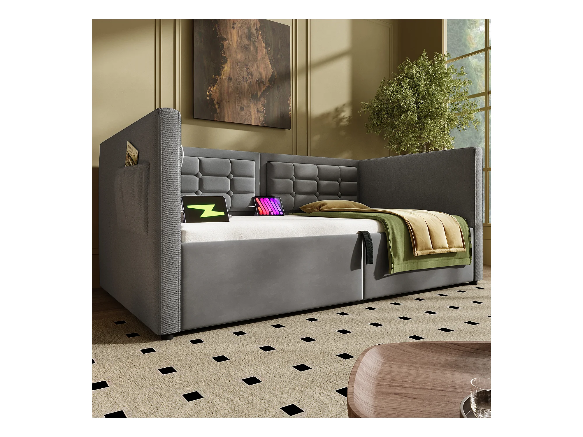 Lit de jour 90x200 cm avec rangement hydraulique, liseuse et port USB-C, cadre en velours gris, avec 4 tiroirs (203x98x70.5 cm)
