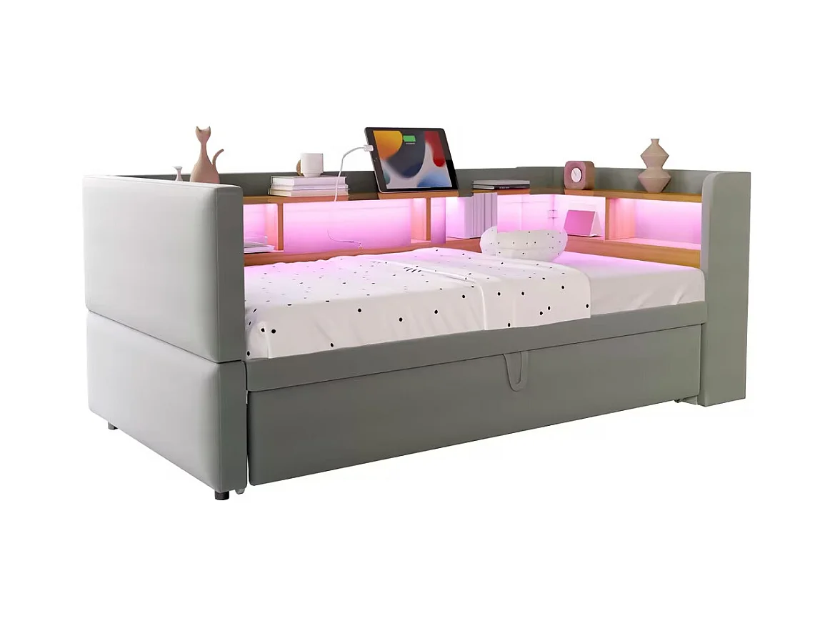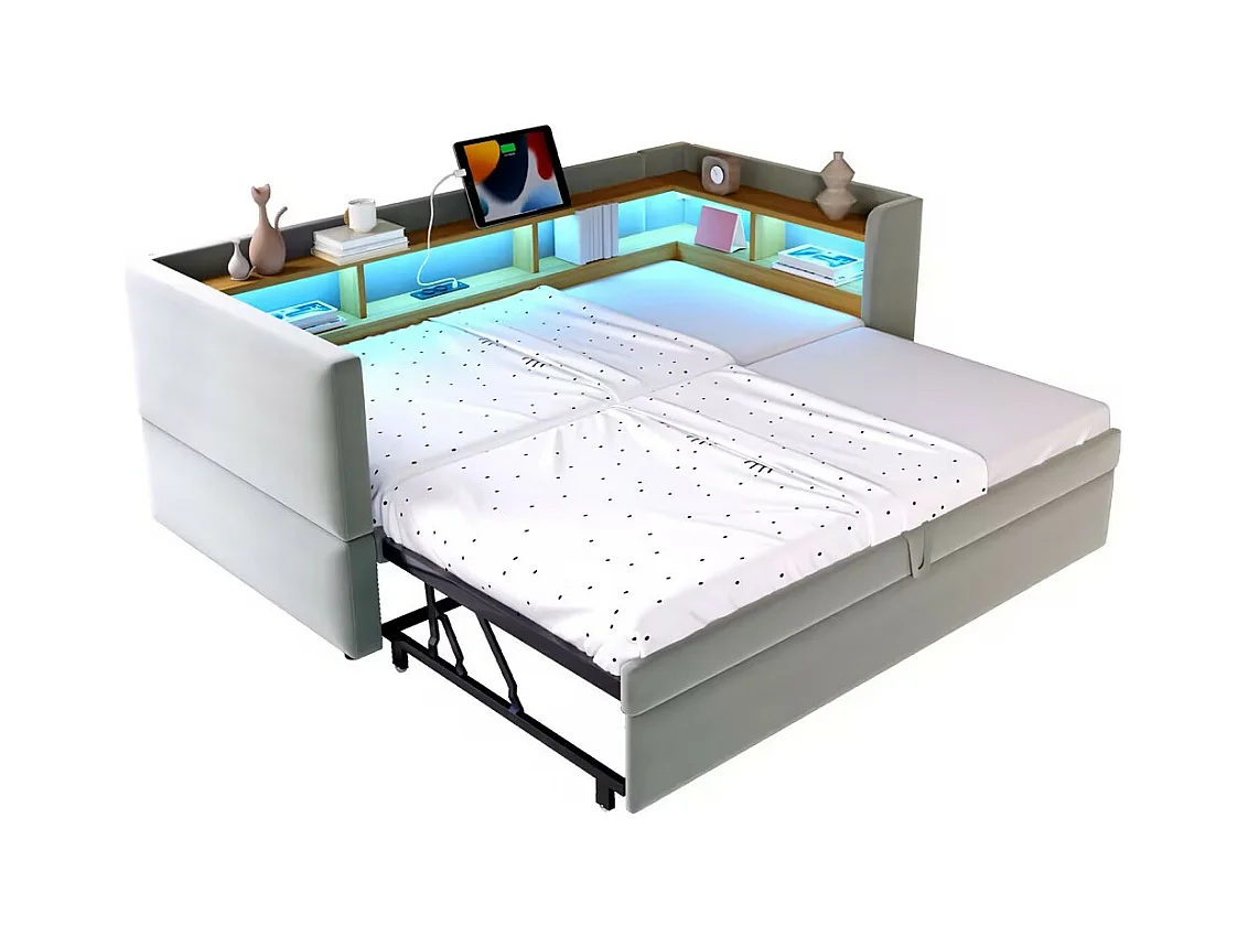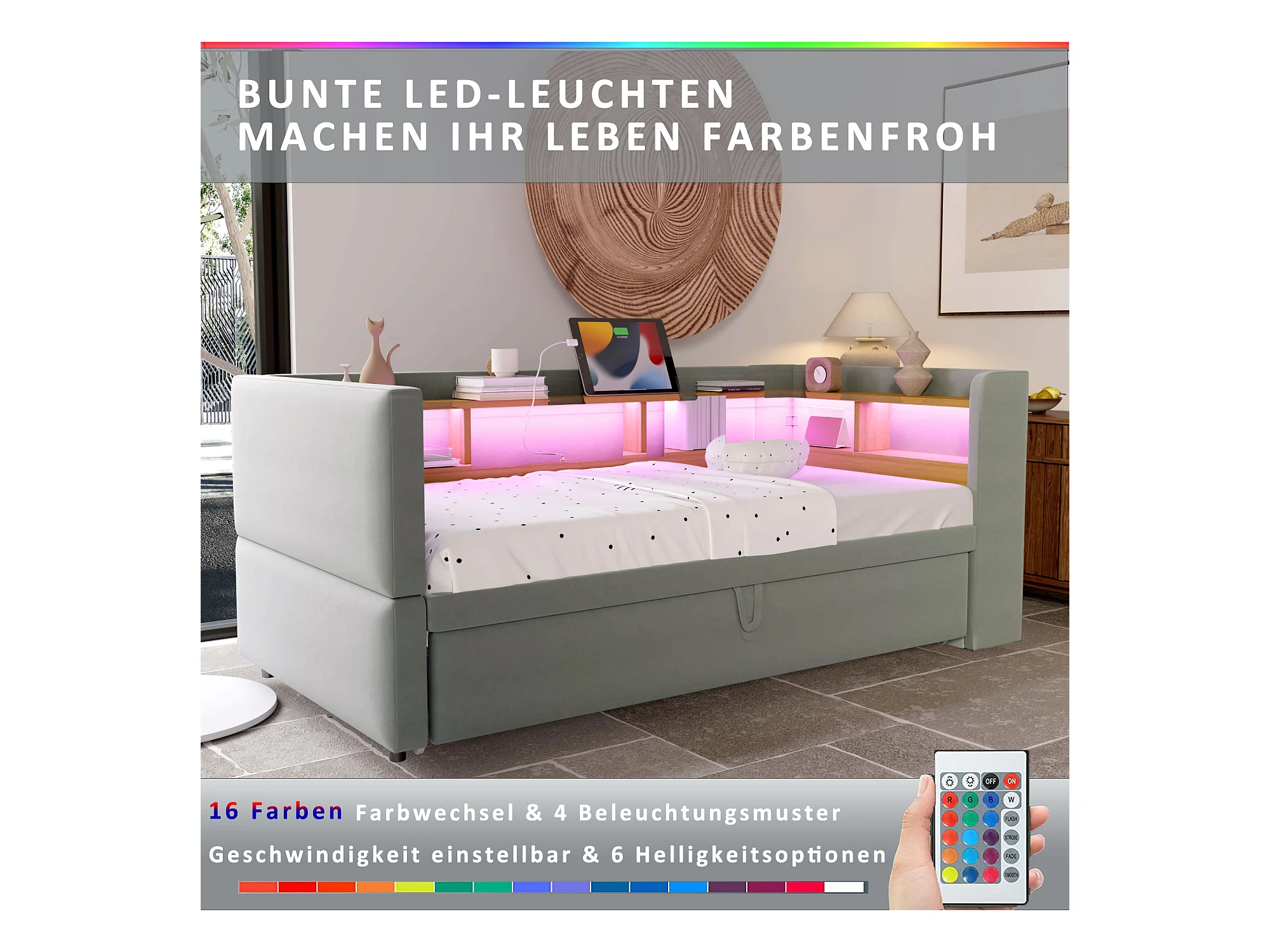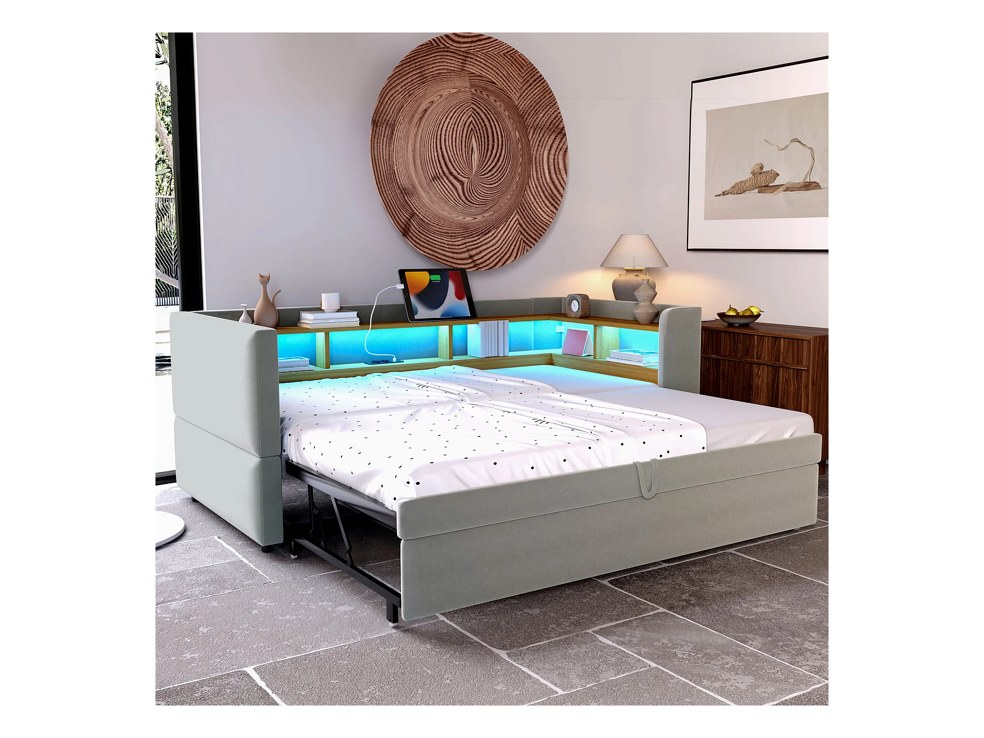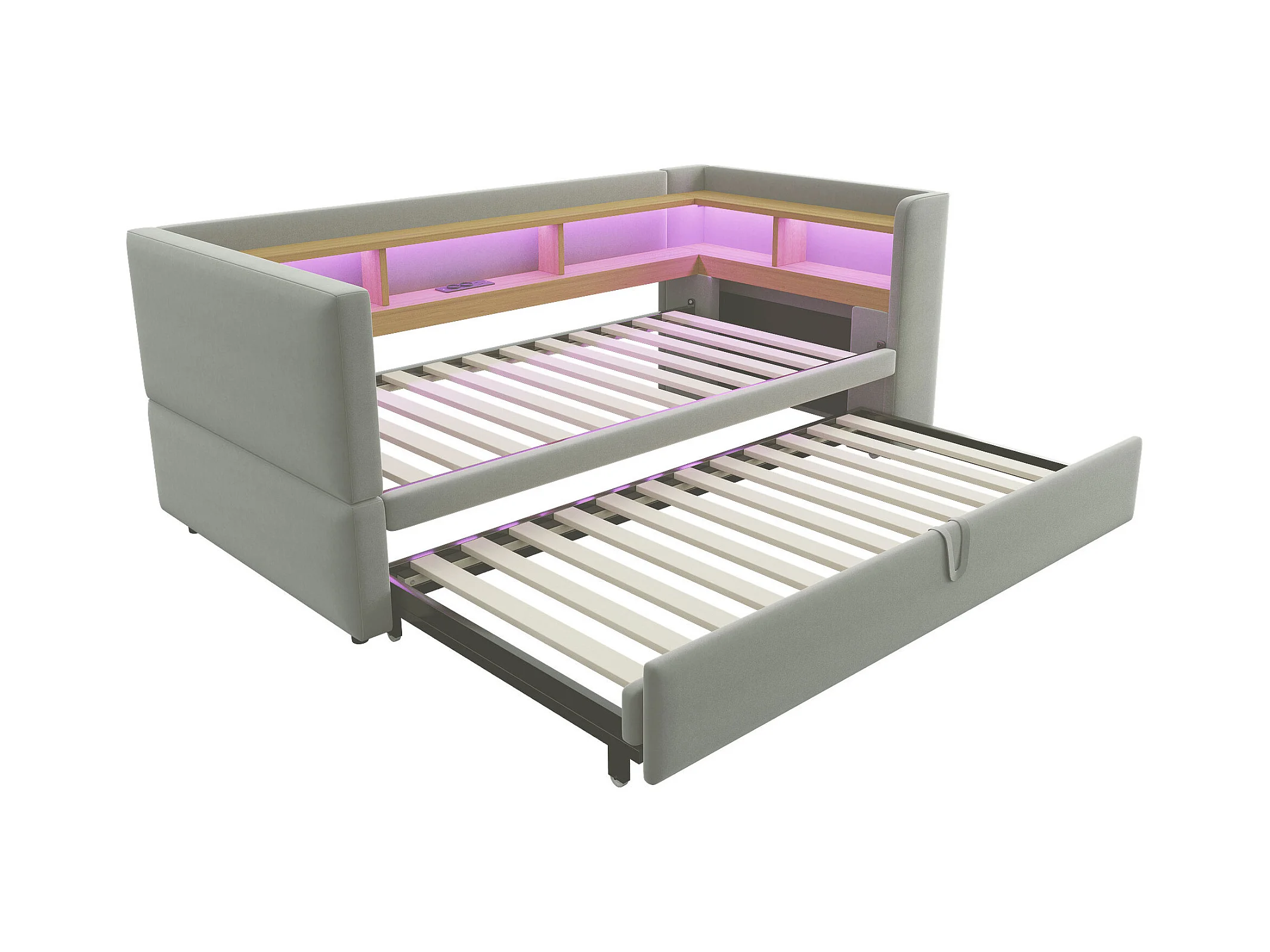 Canapé-lit rembourré gigogne - 140 x 200 cm + 90 x 190 cm - Leds et prises - avec rangements - Tissu flanelle - Gris clair