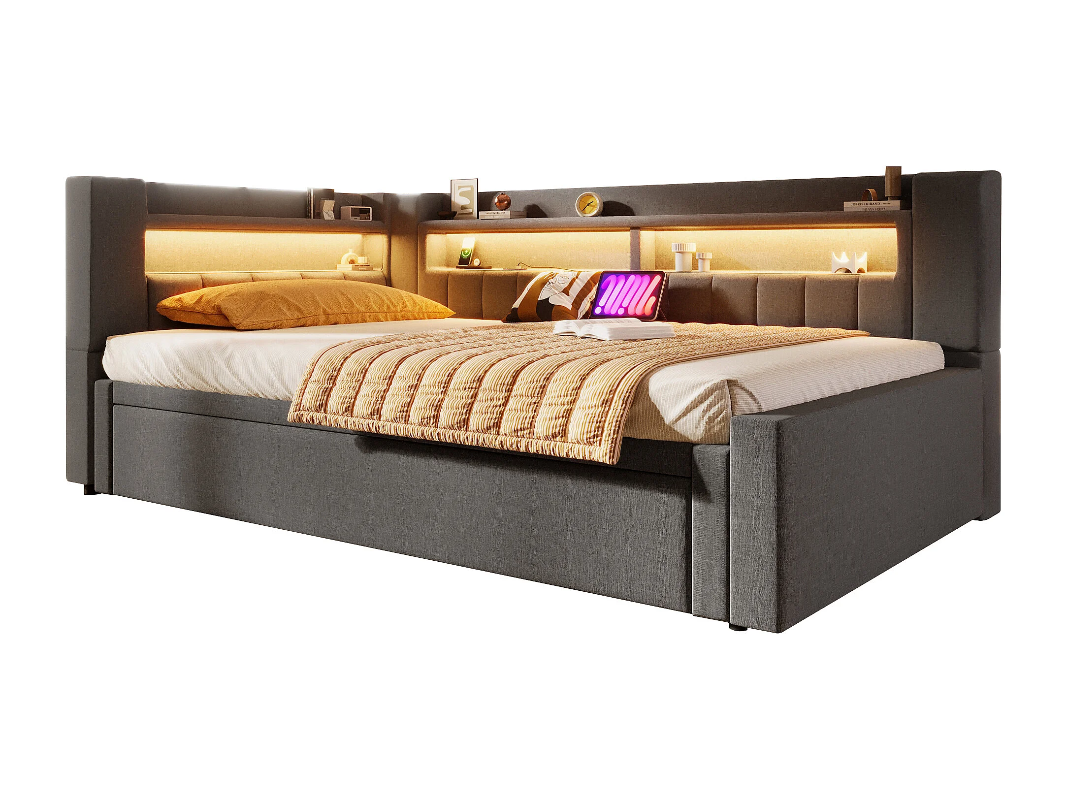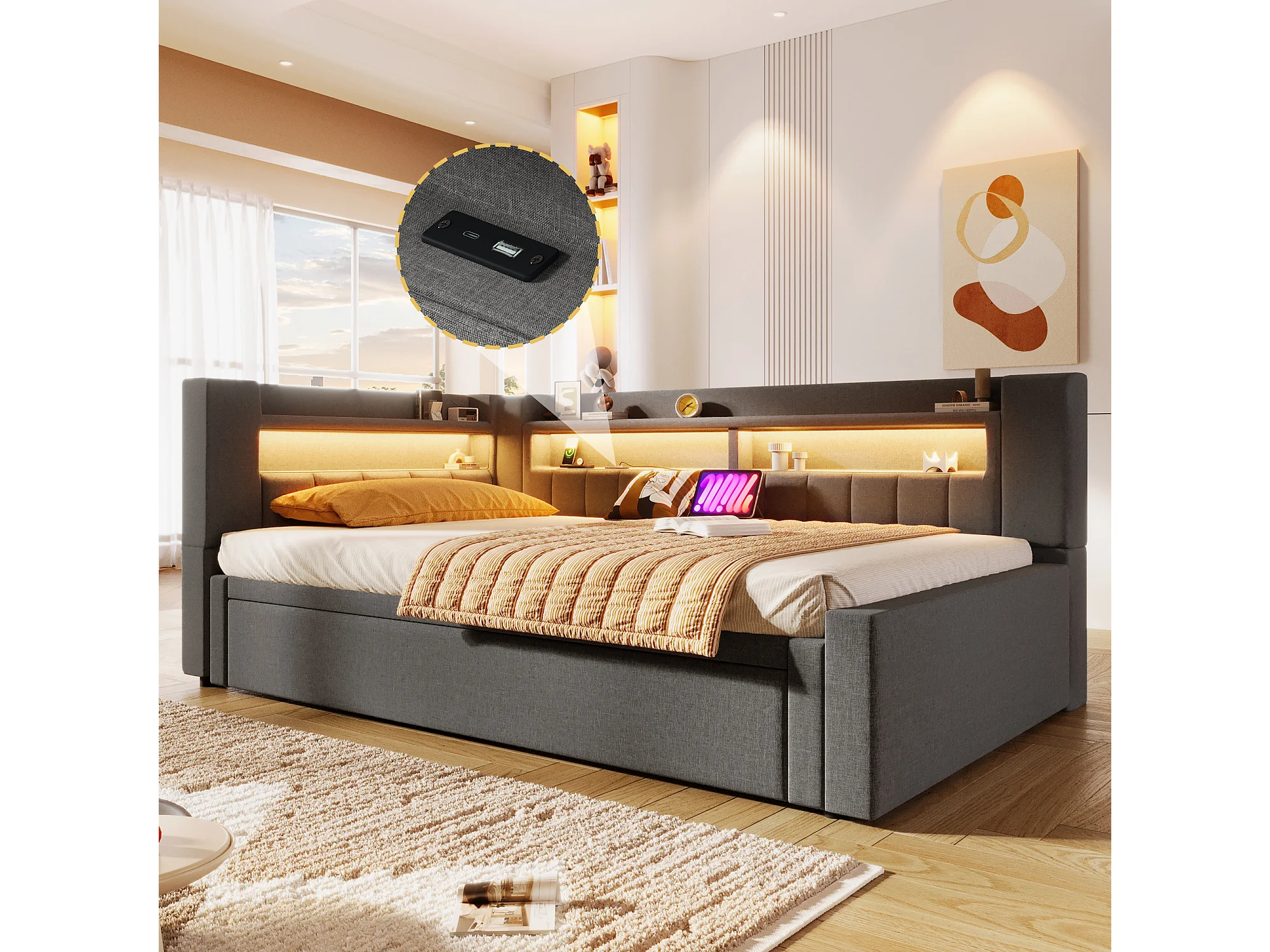 Canapé-lit capitonné avec lit gigogne - 90/180 x 200 cm - avec USB + Type-C + Leds + rangement - lin - gris