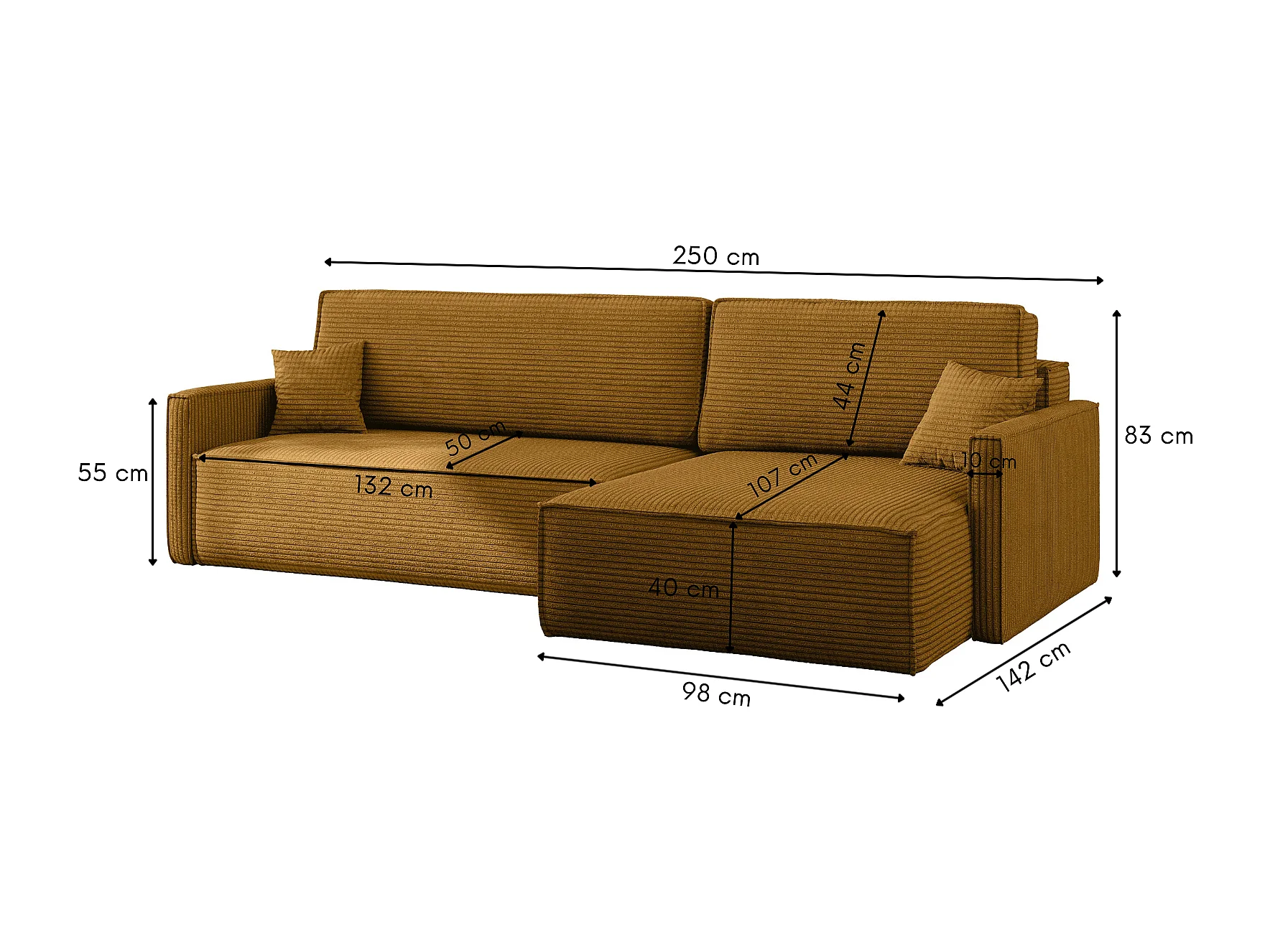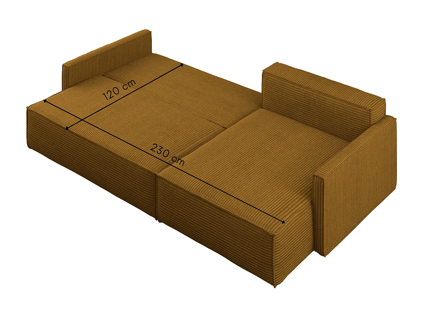 Canapé-lit Carlos, canapé d'angle en L avec fonction couchage et coffre de lit, tissu Poso couleur moutarde, droite