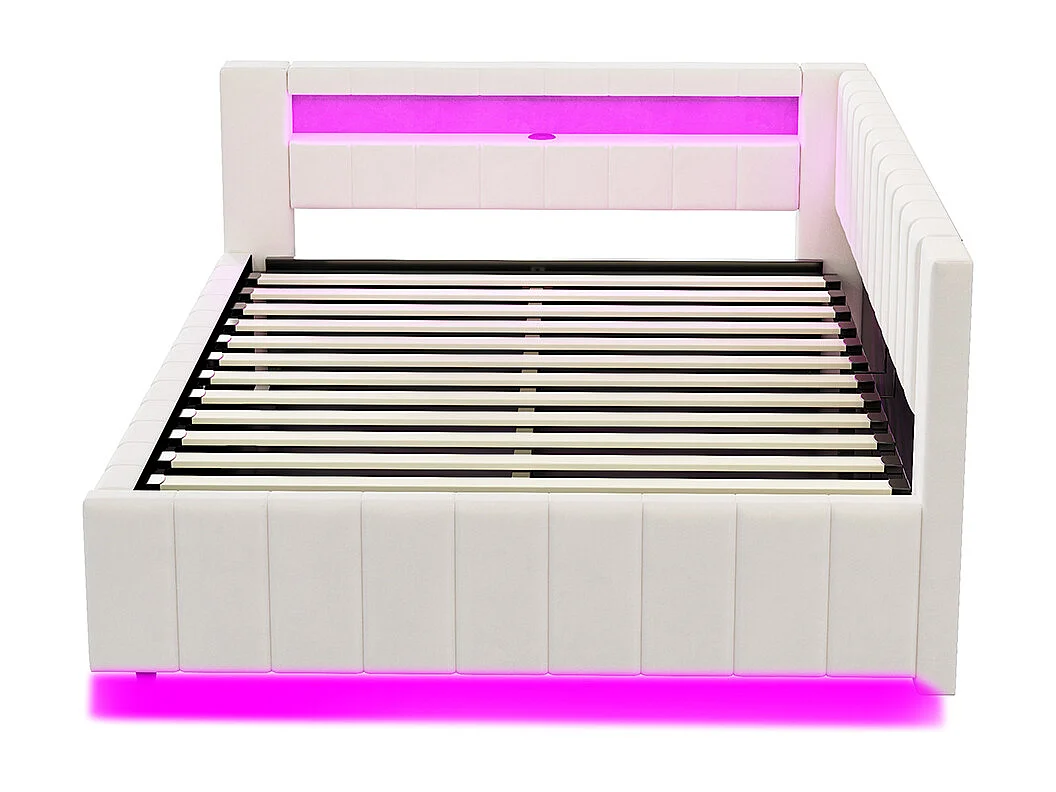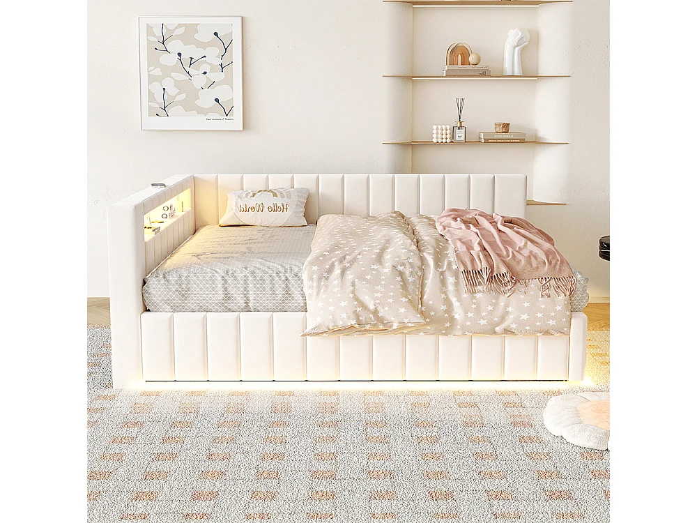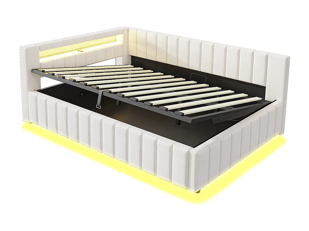 canapé-lit coffer 140x200 avec éclairage LED et port de charge USB, beige, tissu velours