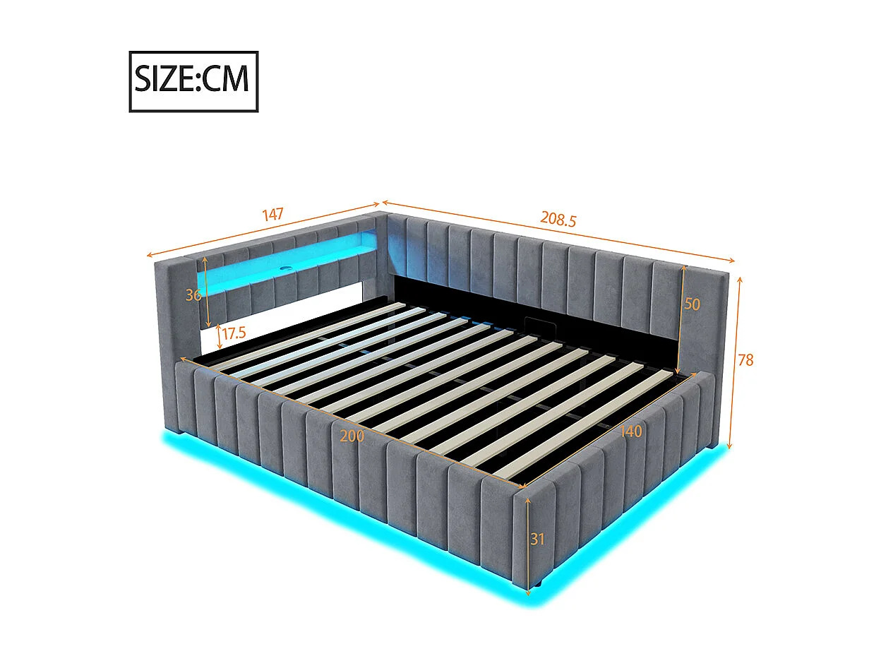 canapé-lit coffer 140x200 avec éclairage LED et port de charge USB, gris, tissu velours