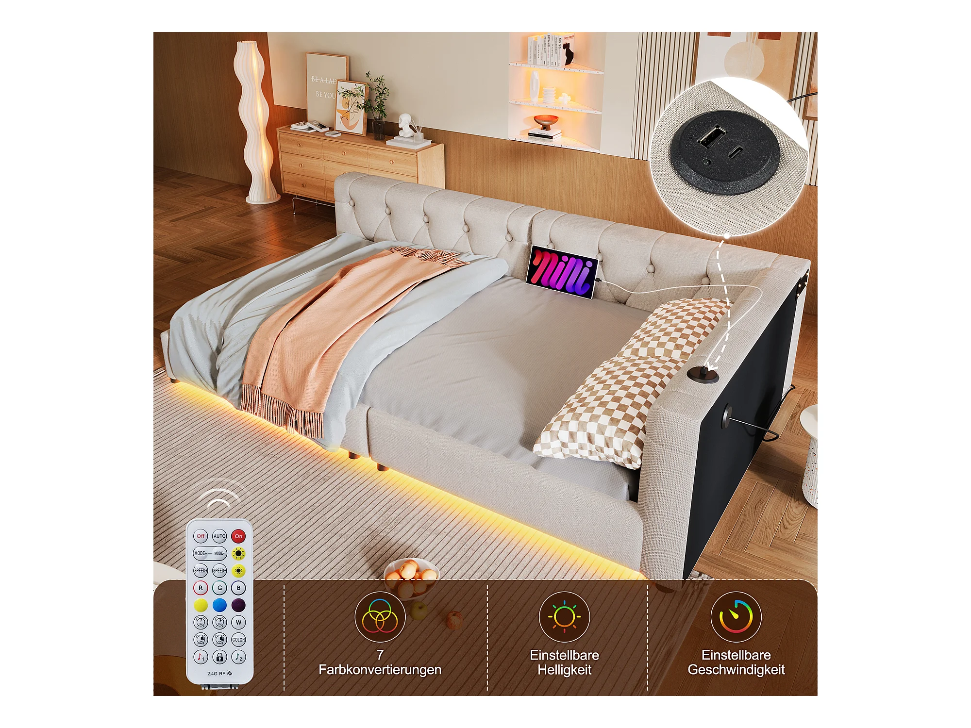Daybett 90x200cm, Lit de jour, Canapé-lit, avec LED, Rangement, USB + Type-C, Lit extractible, avec sommier (sans matelas), Lin, Beige (210x94.5x71 cm)