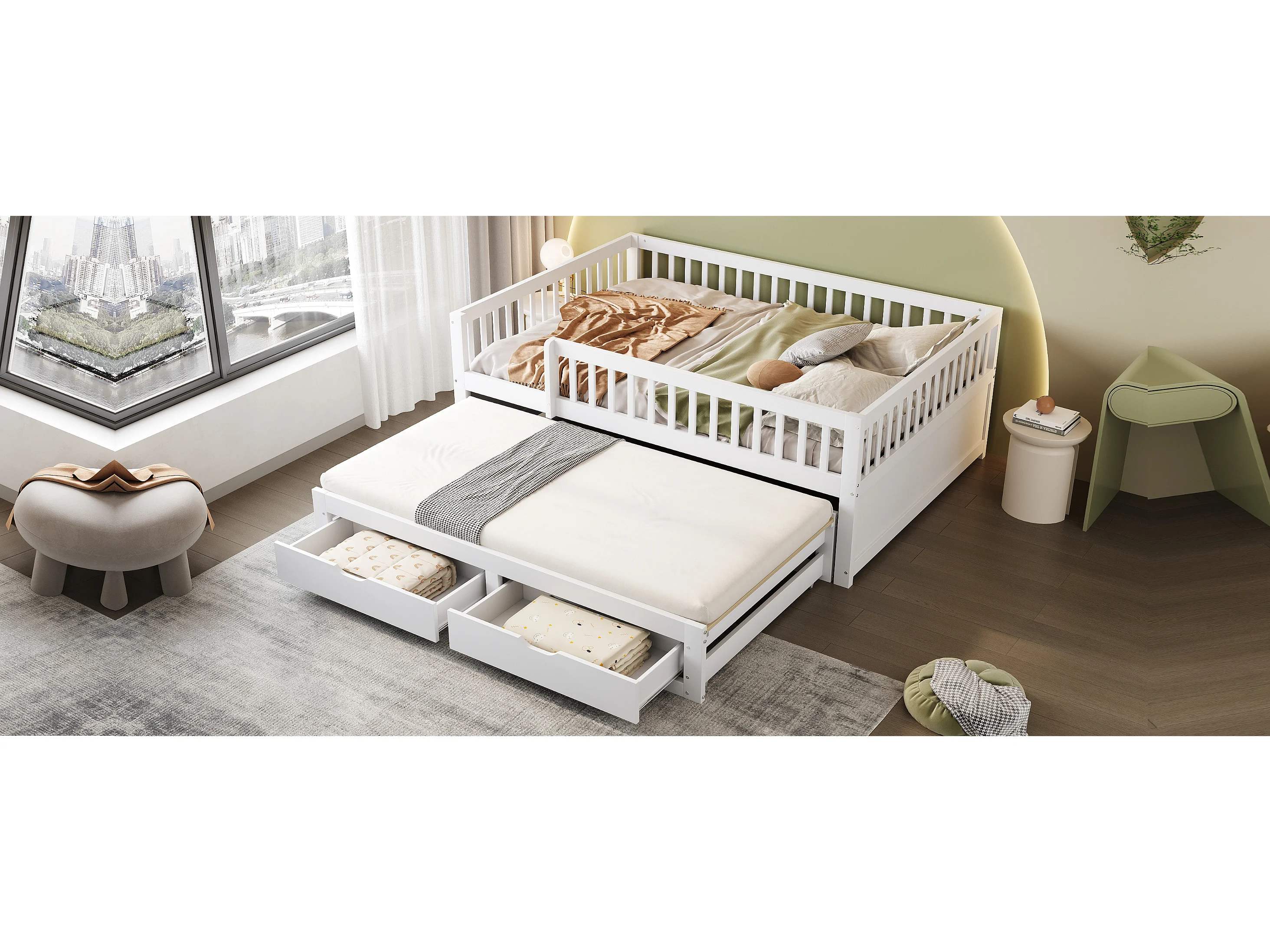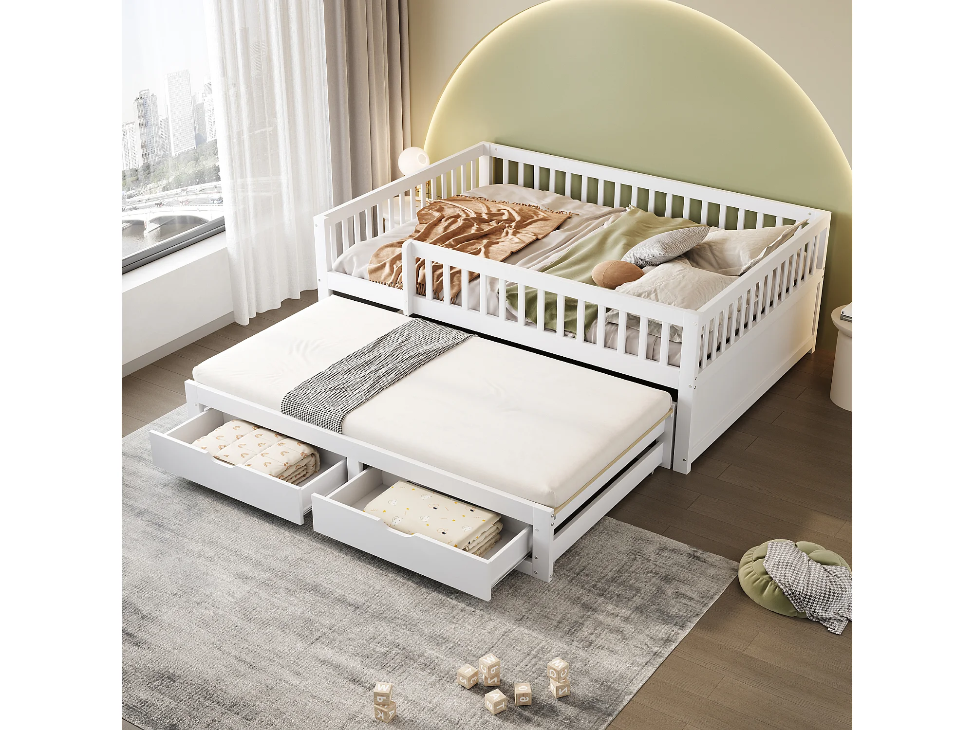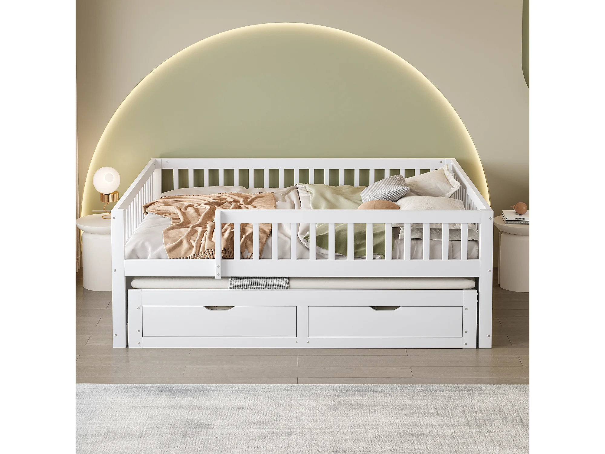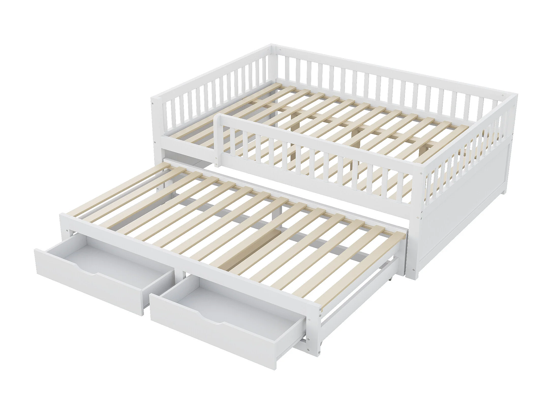 Canapé-lit en bois massif 140x200 cm, avec grille de sécurité et tiroirs, lit escamotable, blanc (205x145x77.5 cm)