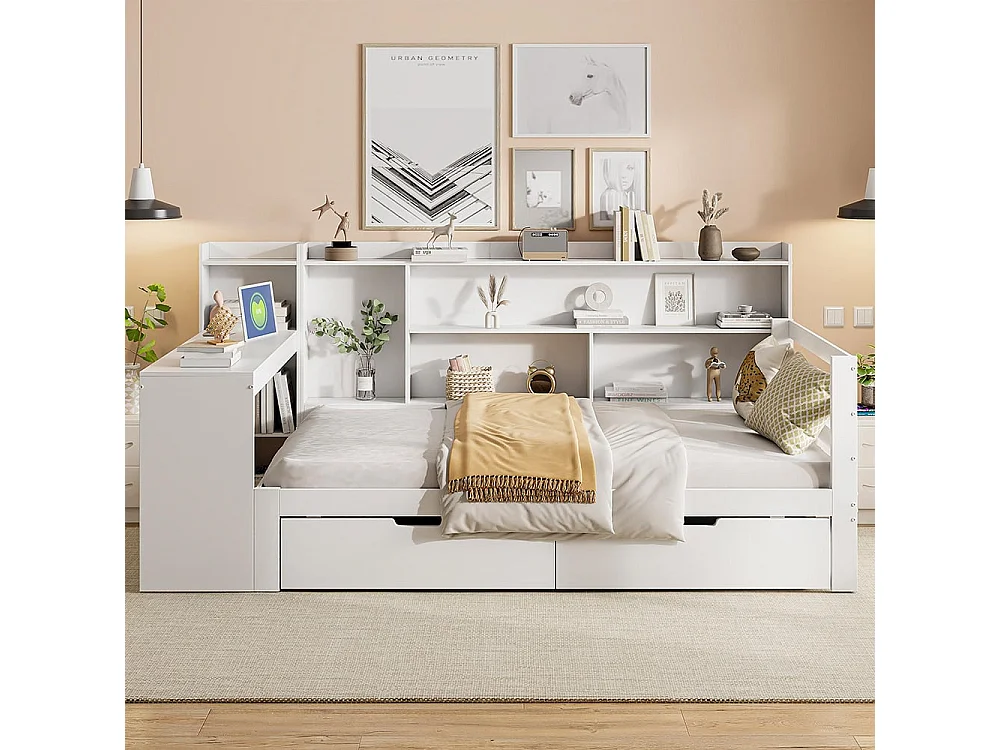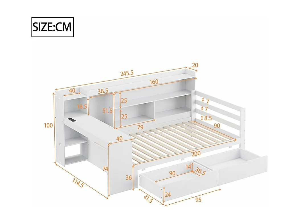 Canapé-lit en bois massif 90*200 cm, avec bureau, bibliothèque et étagères, prise de courant, avec 2 grands compartiments de rangement,Blanc
