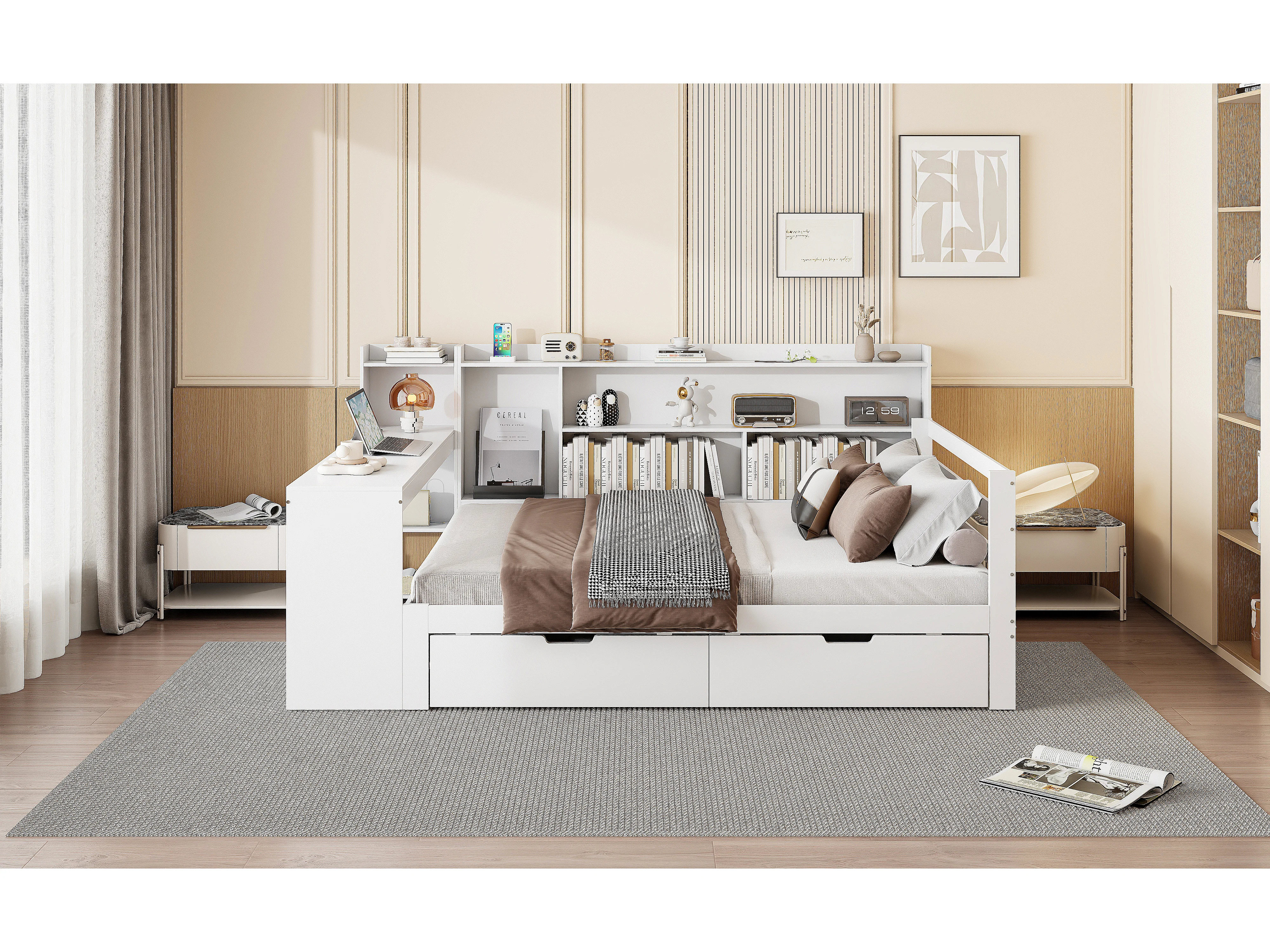 Canapé-lit en bois massif 90x200 cm, avec bureau, étagères, tiroirs et prise, multifonction, blanc (205x95x77.5 cm)