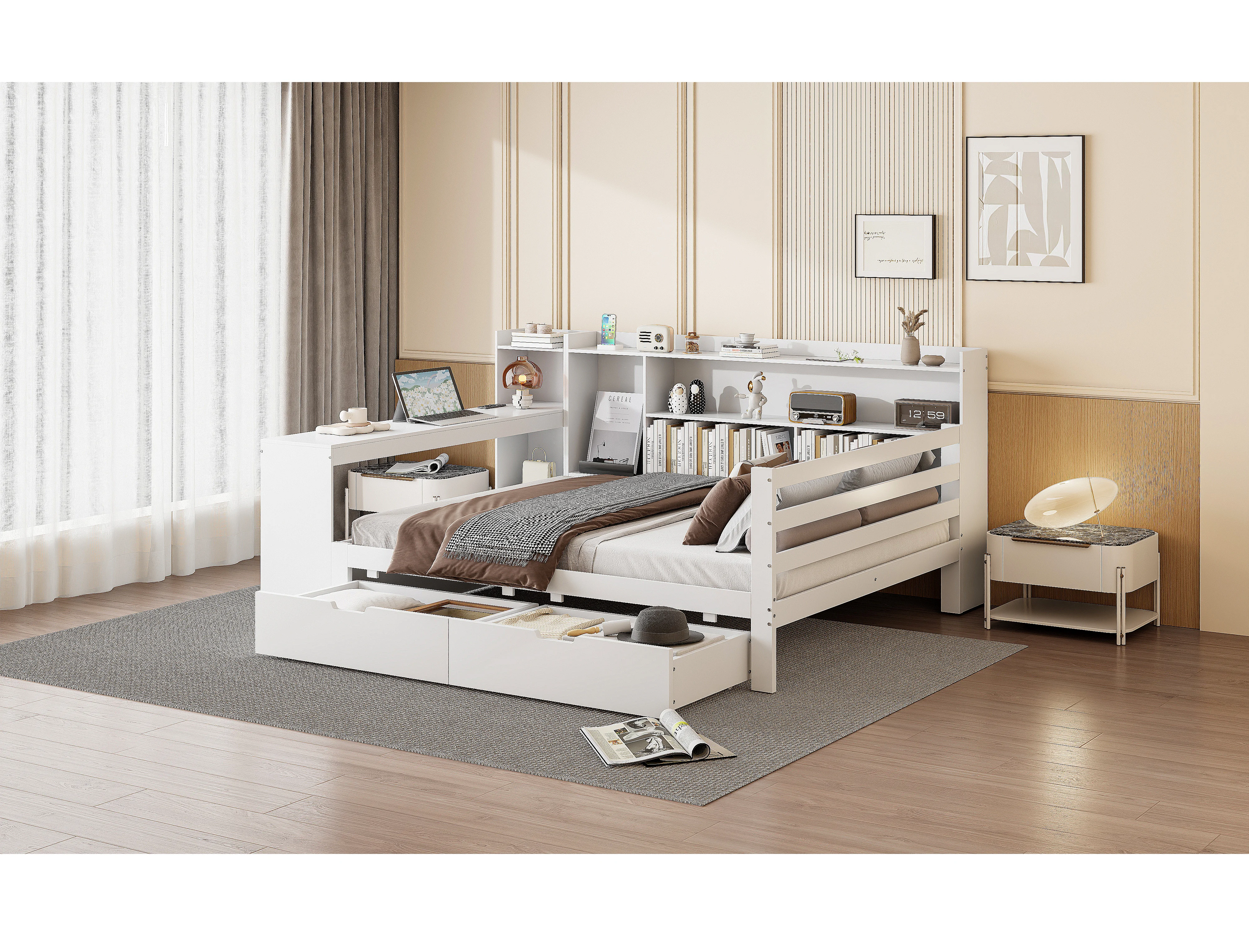 Lit combiné 90x200cm, lit simple enfant avec 2 tiroirs et étagères de rangement, lit en bois massif, blanc