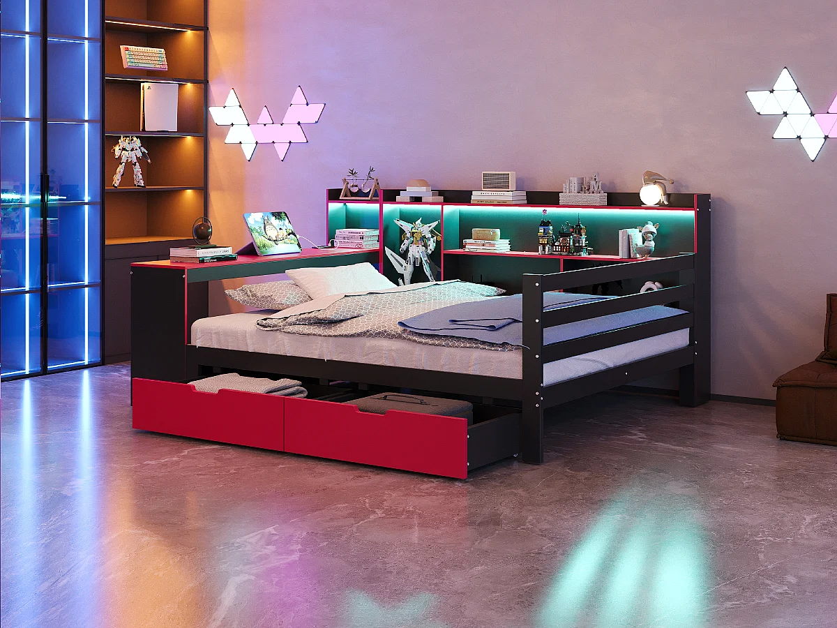 Canapé-lit en bois pour enfant - 140 x 200 cm - avec bureau + bibliothèque + étagères + Leds + prises - noir + rouge