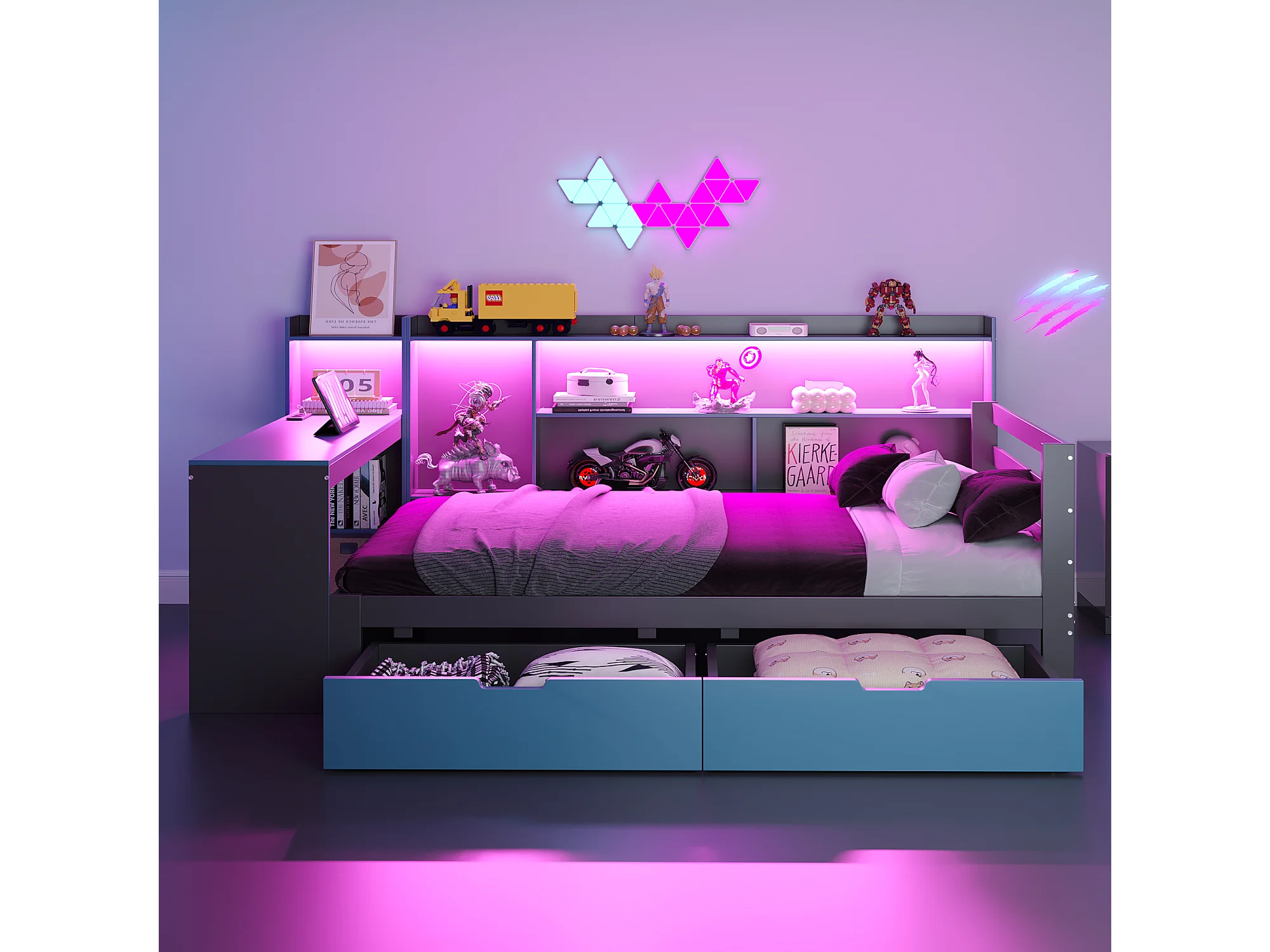 Canapé-lit en bois pour enfant - 90 x 200 cm - avec bureau + bibliothèque + étagères + Leds + prises - noir + bleu