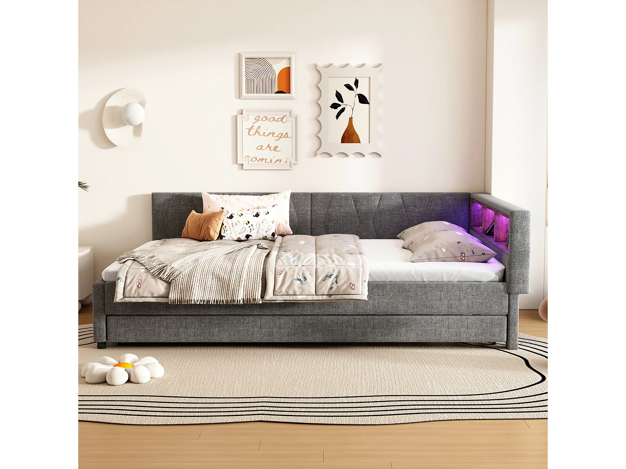 Canapé-lit enfant - 140 x 200 cm - rangements sur lit - avec USB + Leds - avec lit gigogne 90 x 190 cm - lin + MDF - gris