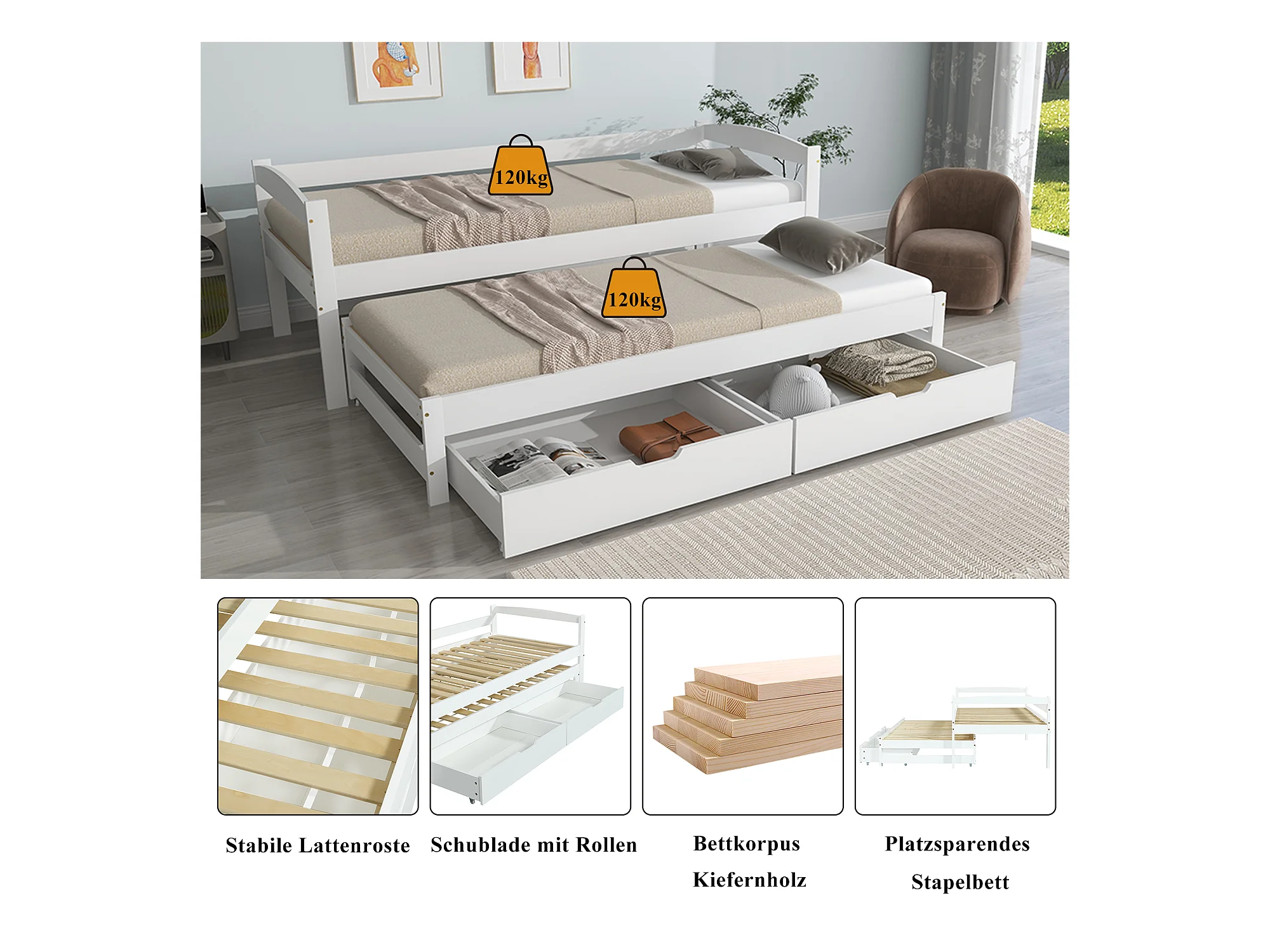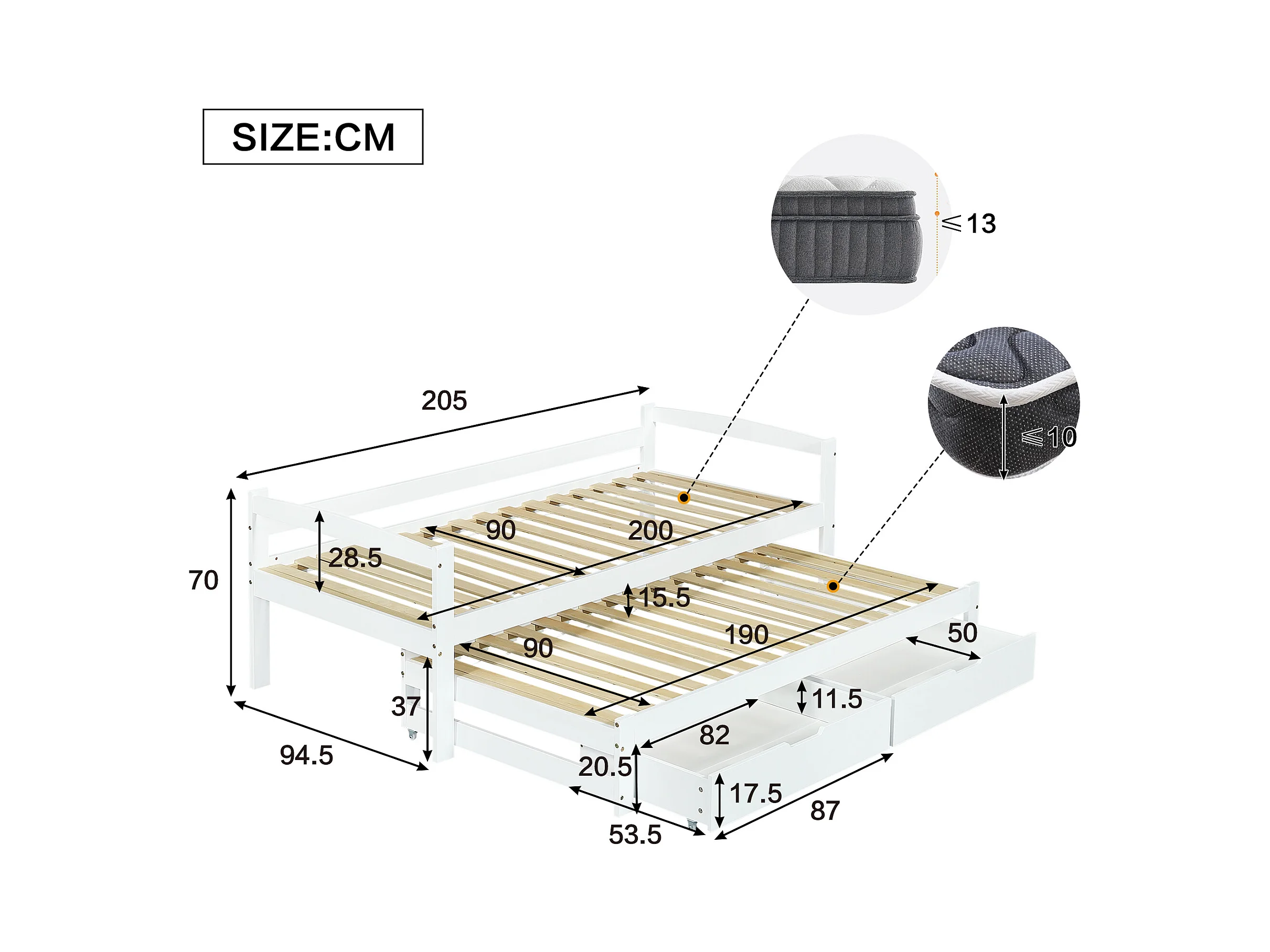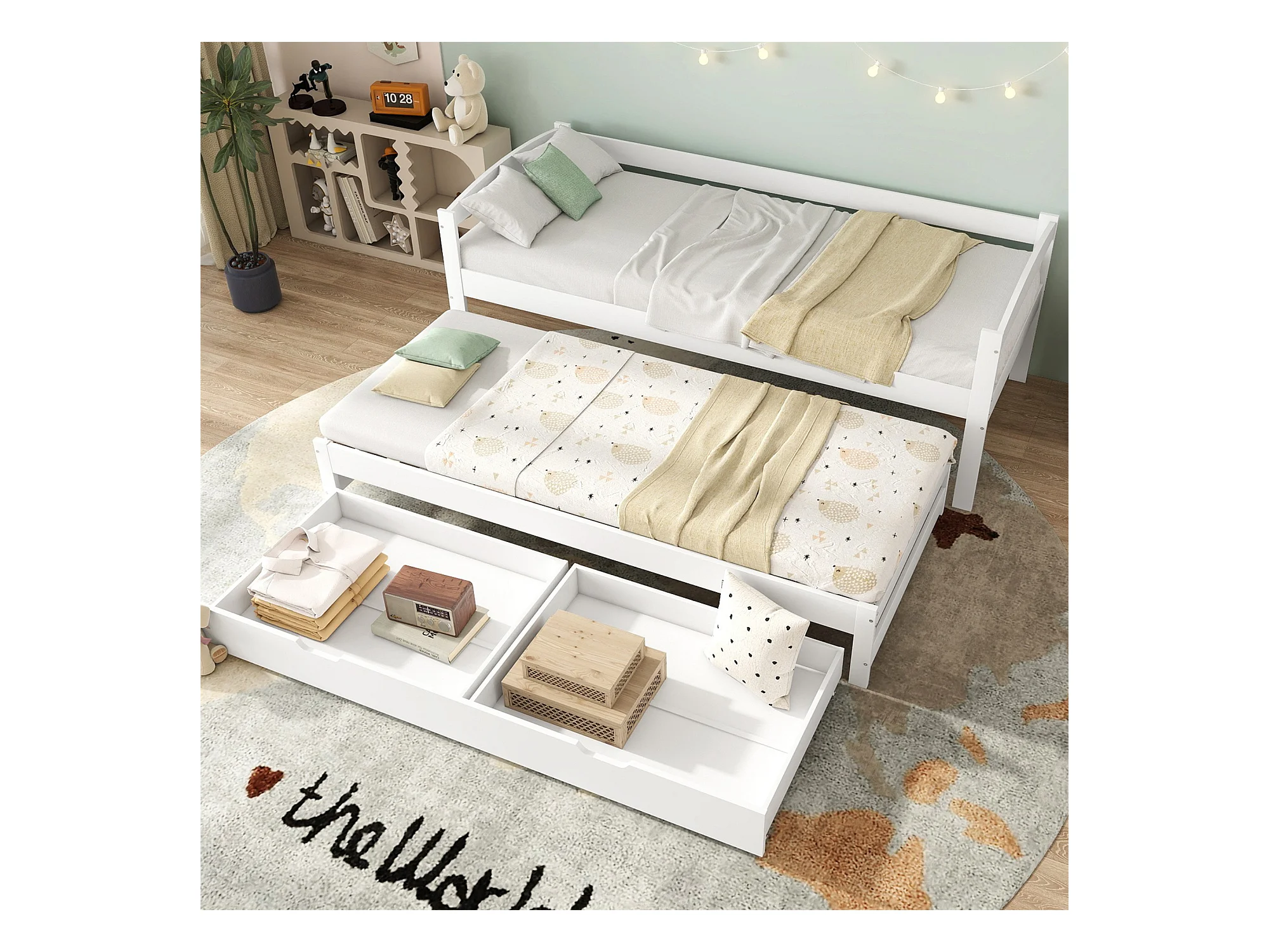 Canapé-lit enfant - 90 x 190/200 cm - avec lit gigogne + avec 2 tiroirs - bois + MDF - blanc