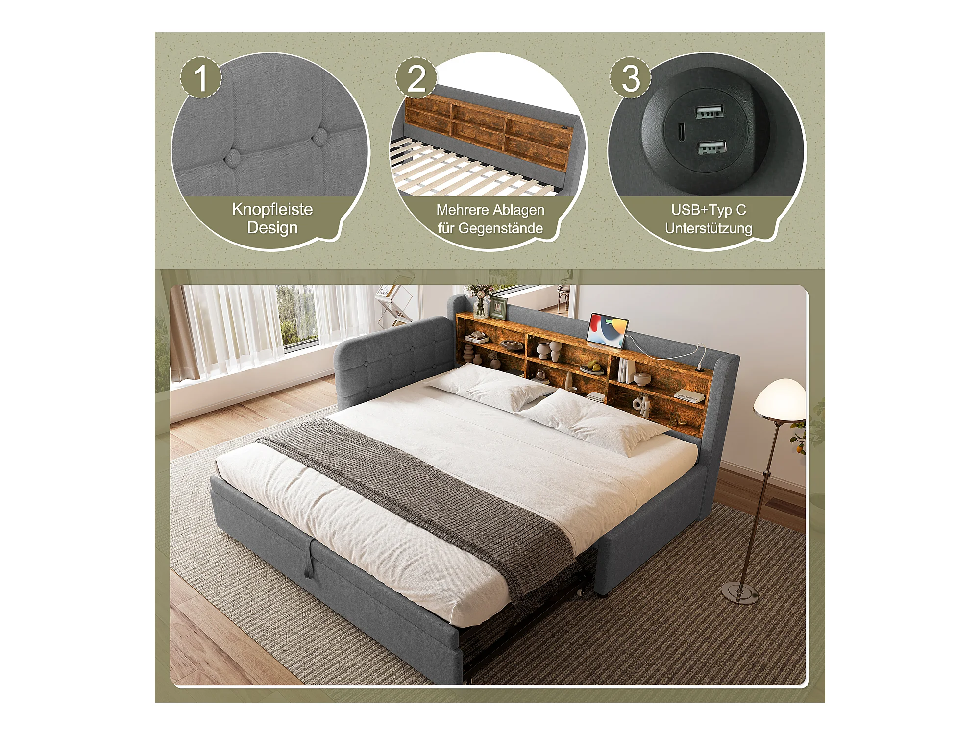 Lit gigogne 90x200cm+90x190cm, lit à roulettes avec 3 tiroirs, lit capitonné en lin, pour enfant et jeune, gris