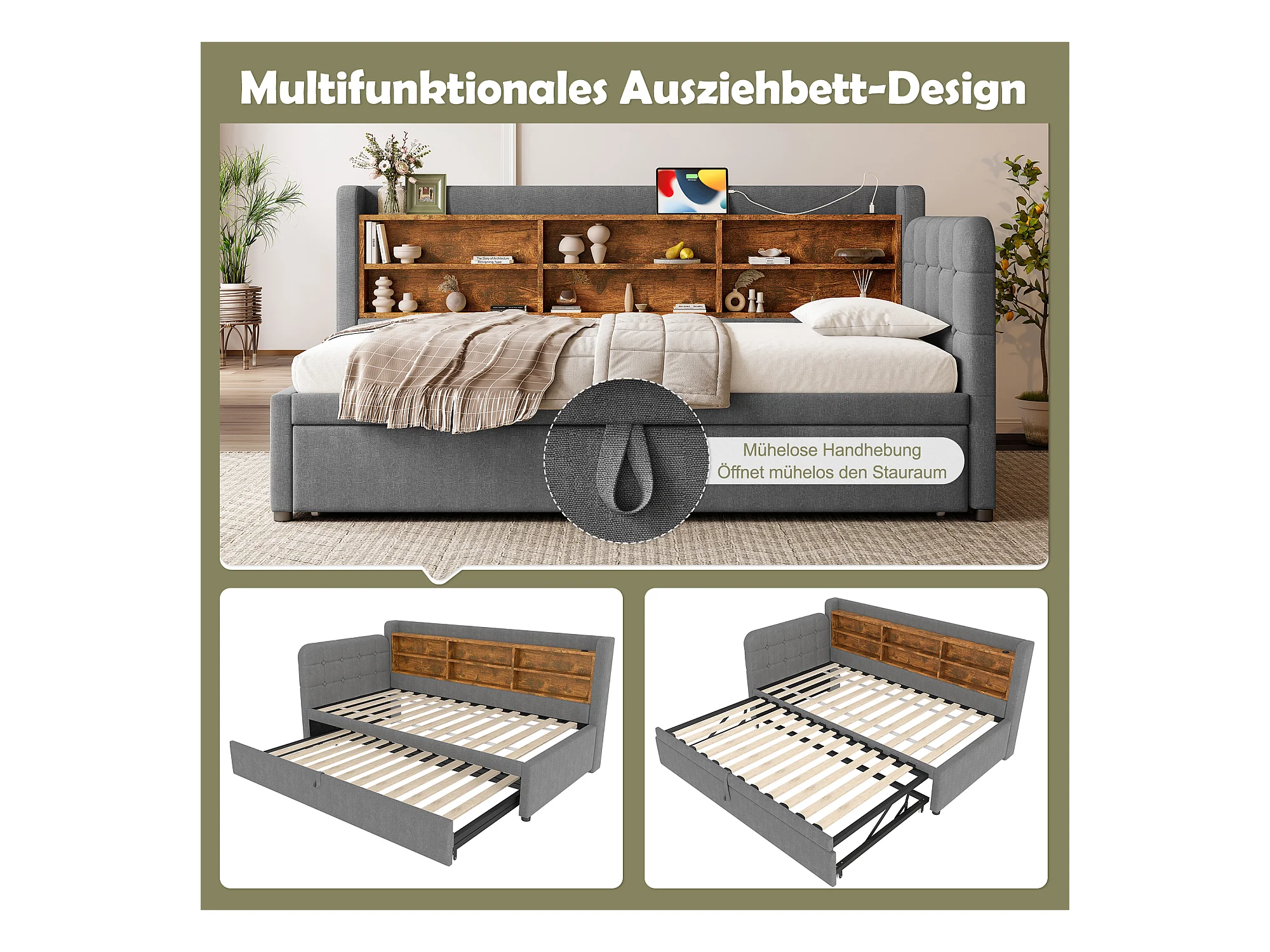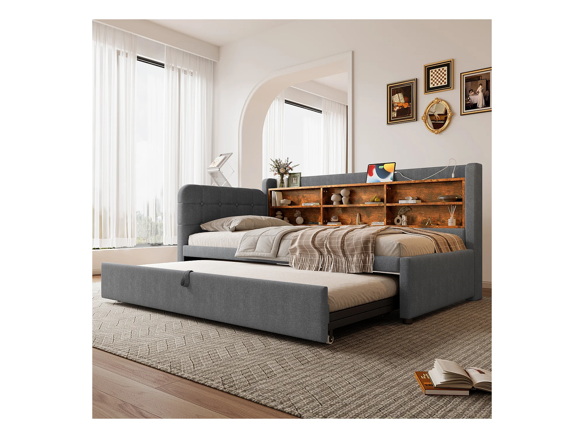 Lit banquette 90x200 cm avec lit gigogne et étagère de rangement, port USB - gris - sans matelas