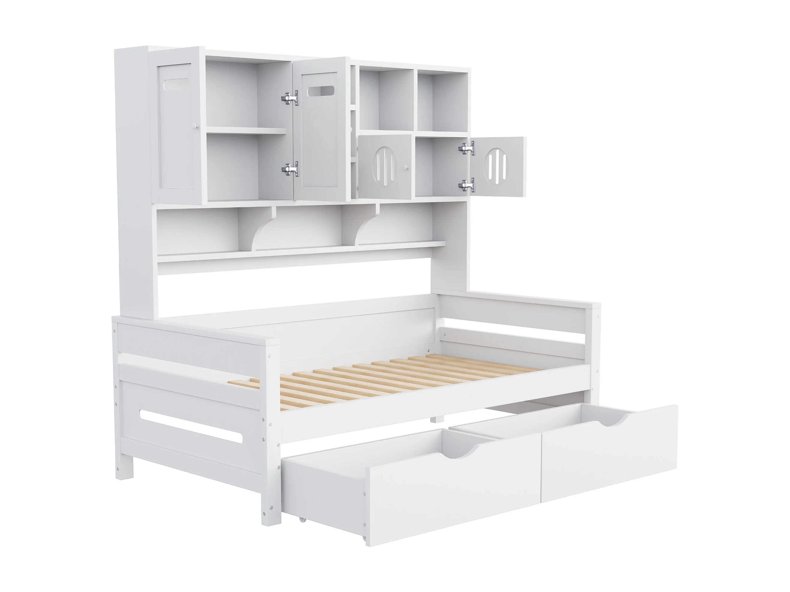 Canapé-lit enfant - 90 x 200 cm - avec rangement de étagères + 2 tiroirs + bureau coulissant - bois - blanc