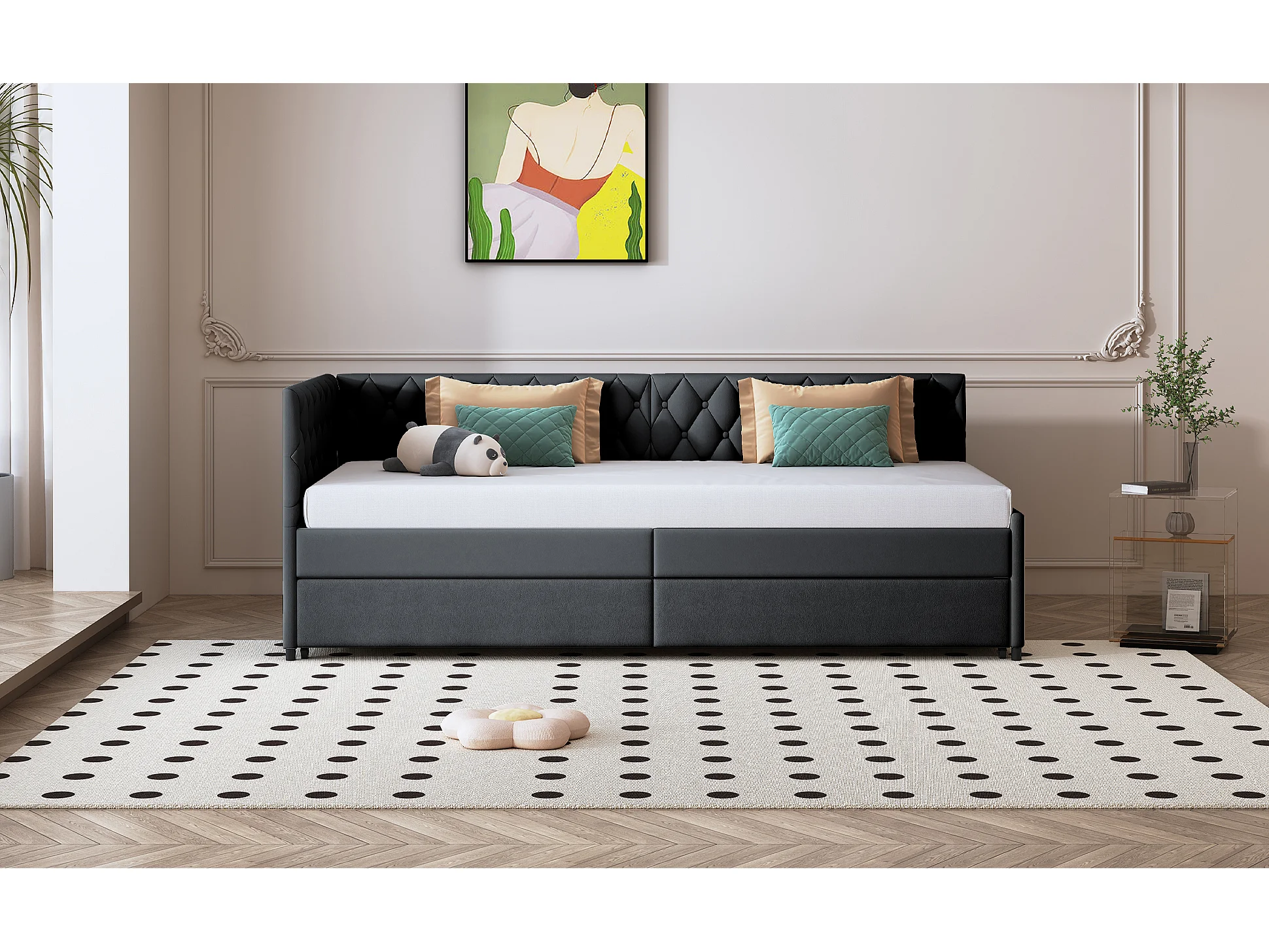 Lit multifonction 90 x 200 cm, canapé-lit avec 2 grands tiroirs de rangement, tissu velours gris (205x97x68 cm)
