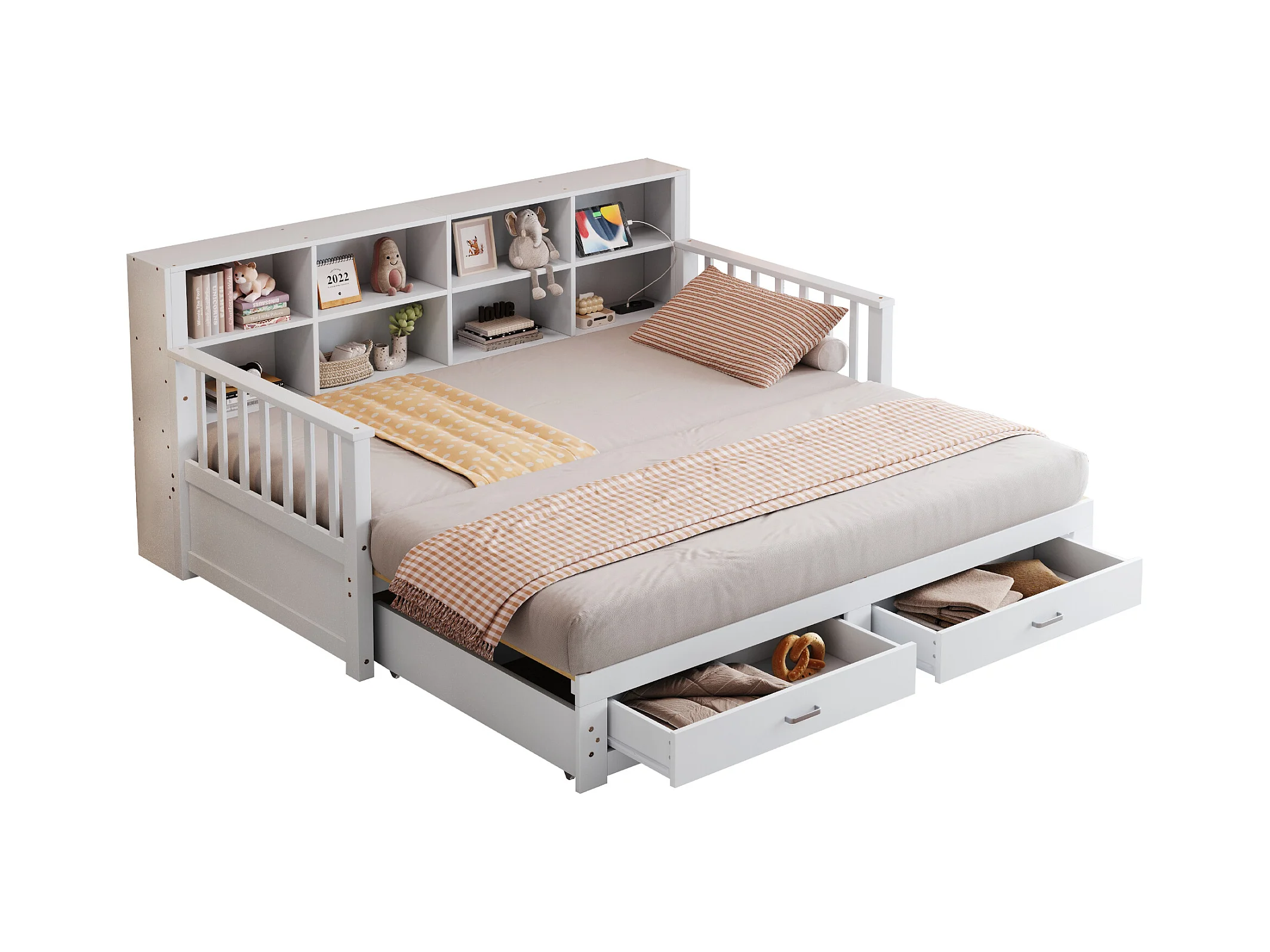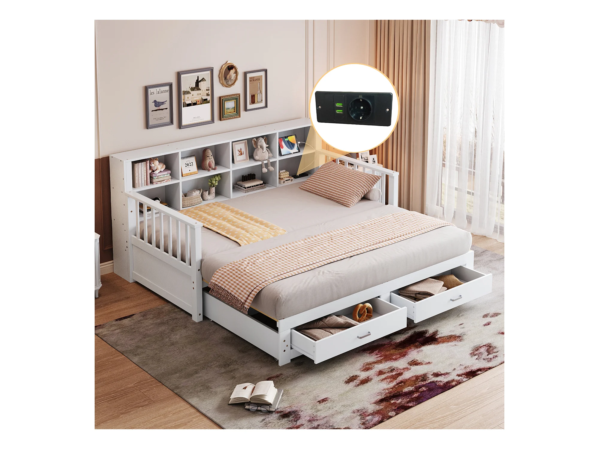 Canapé-lit 90x200 cm, lit gigogne 90x190 cm avec tiroirs, grand rangement, prise USB, bois blanc (192.3x110x100cm)