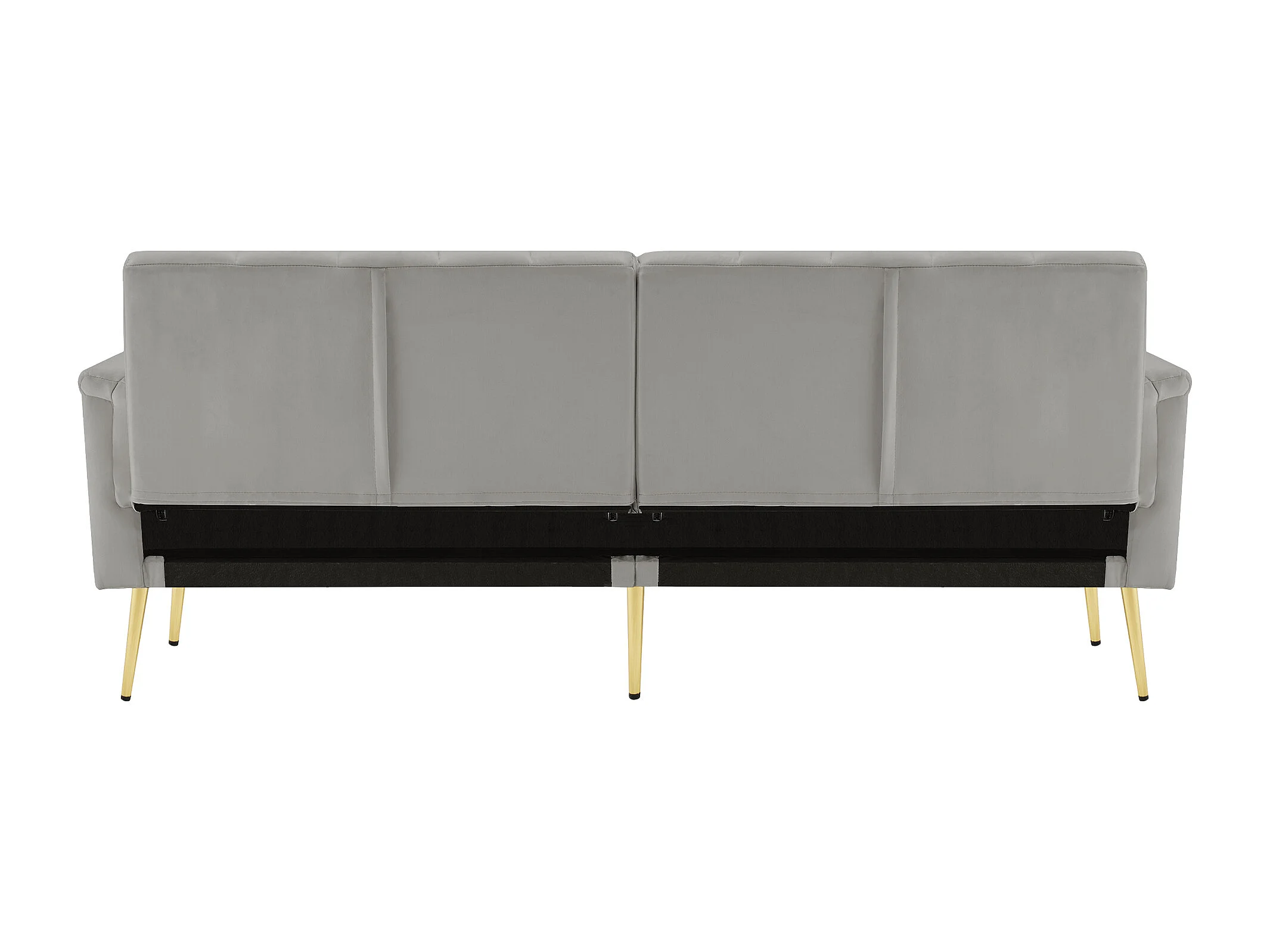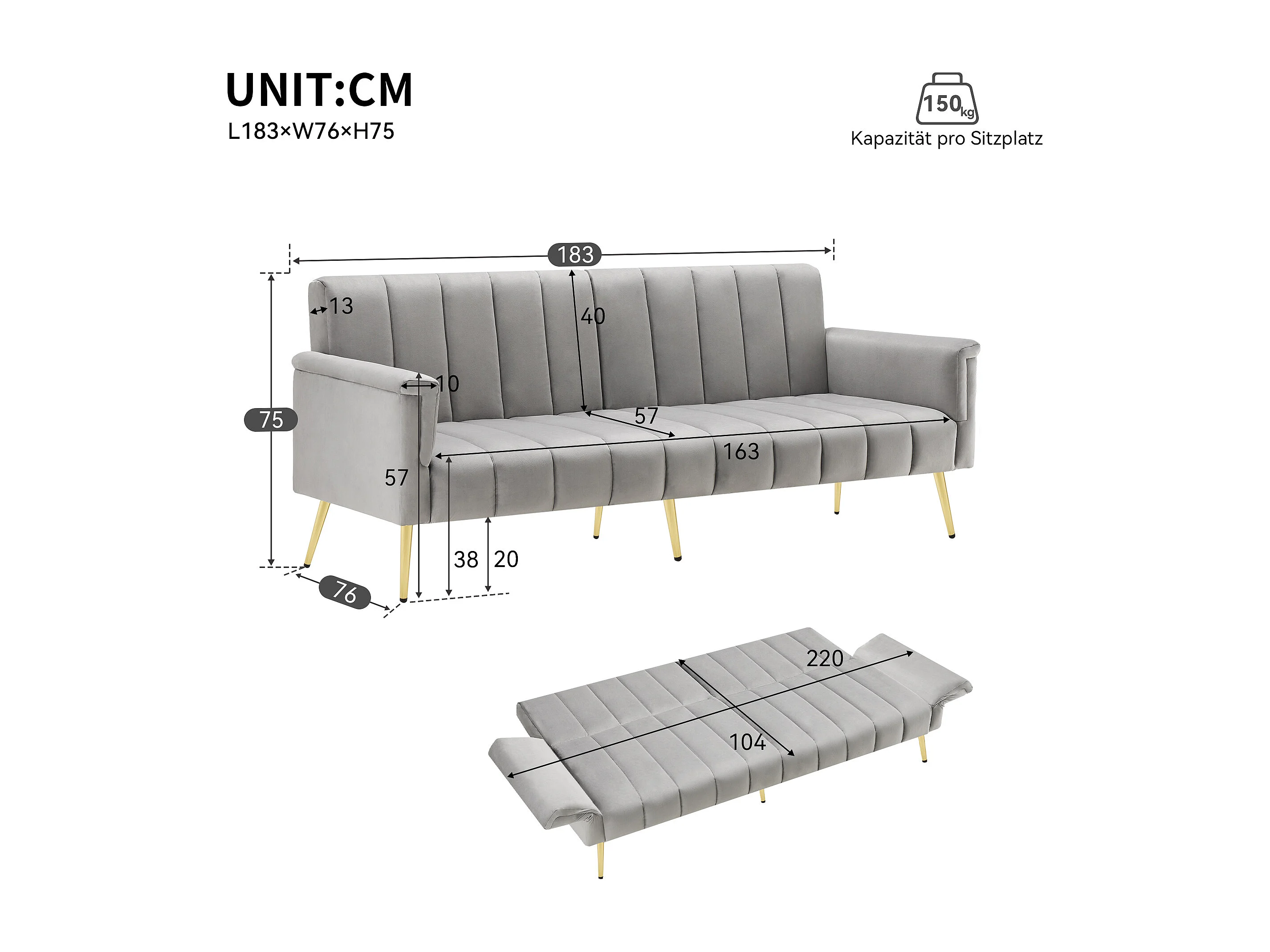 Canapé convertible 183x76x75 cm, dossiers et accoudoirs réglables, pieds métalliques, velours gris