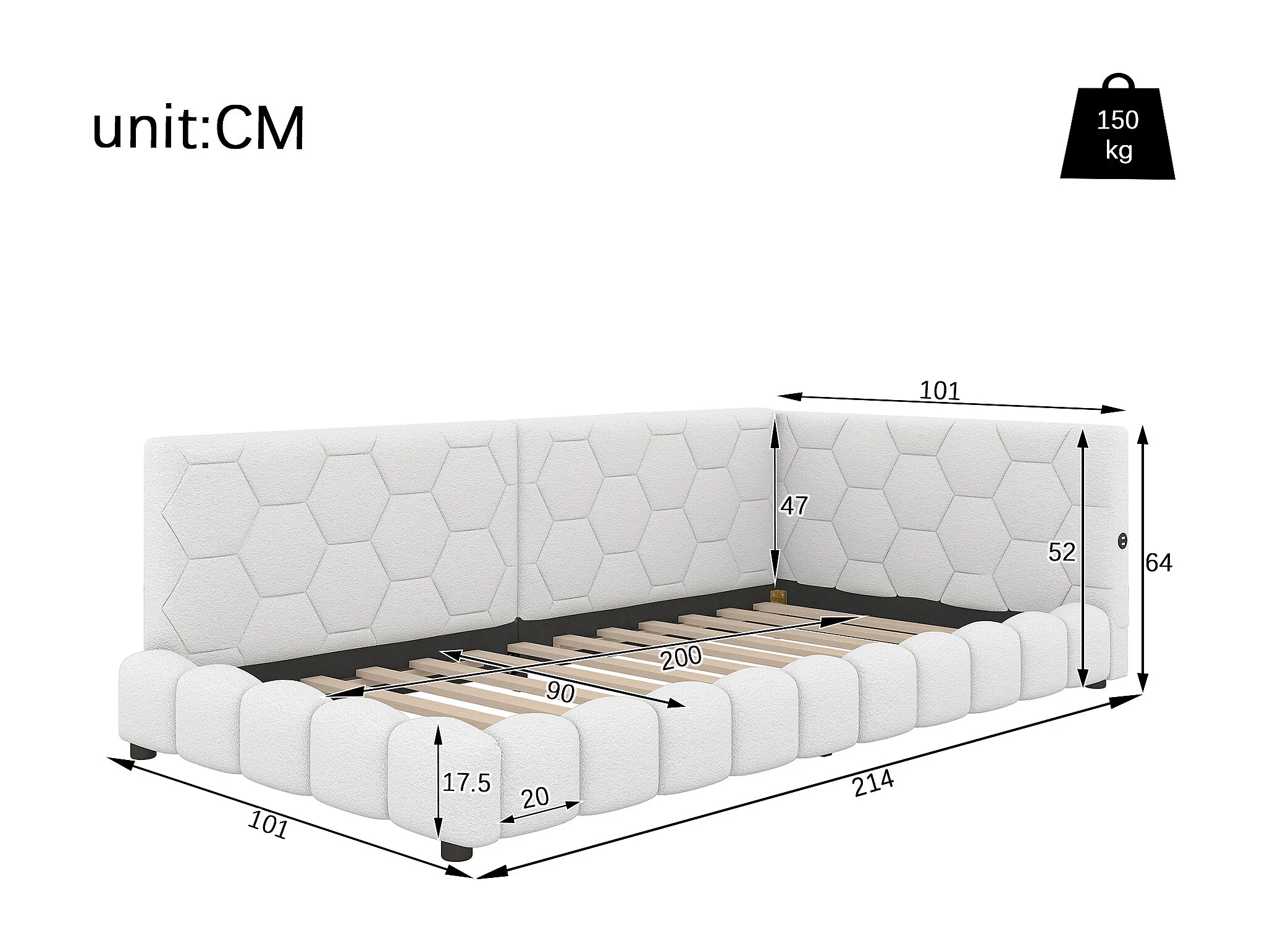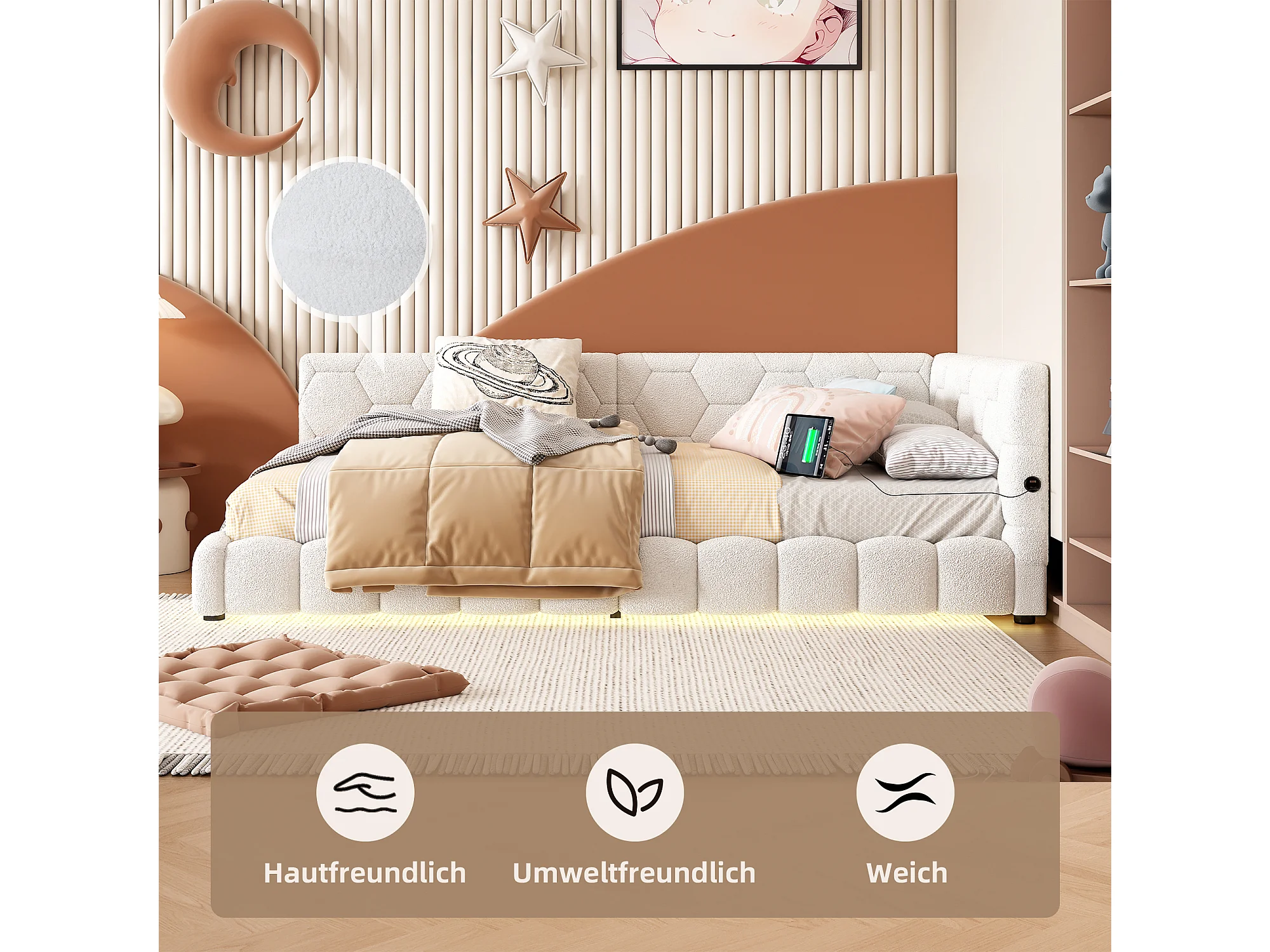 Canapé-lit pour enfant - 90 x 200 cm - avec Leds + USB + sommier à lattes - velours - blanc