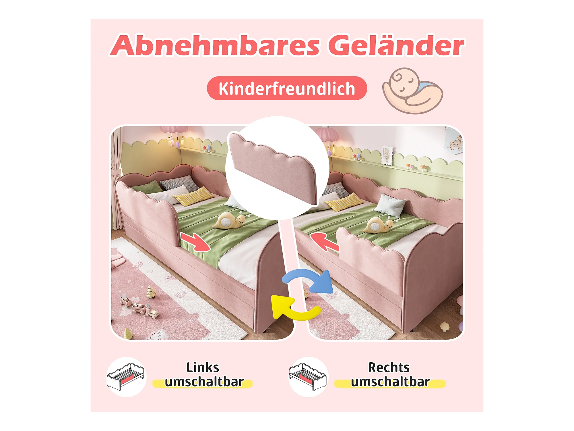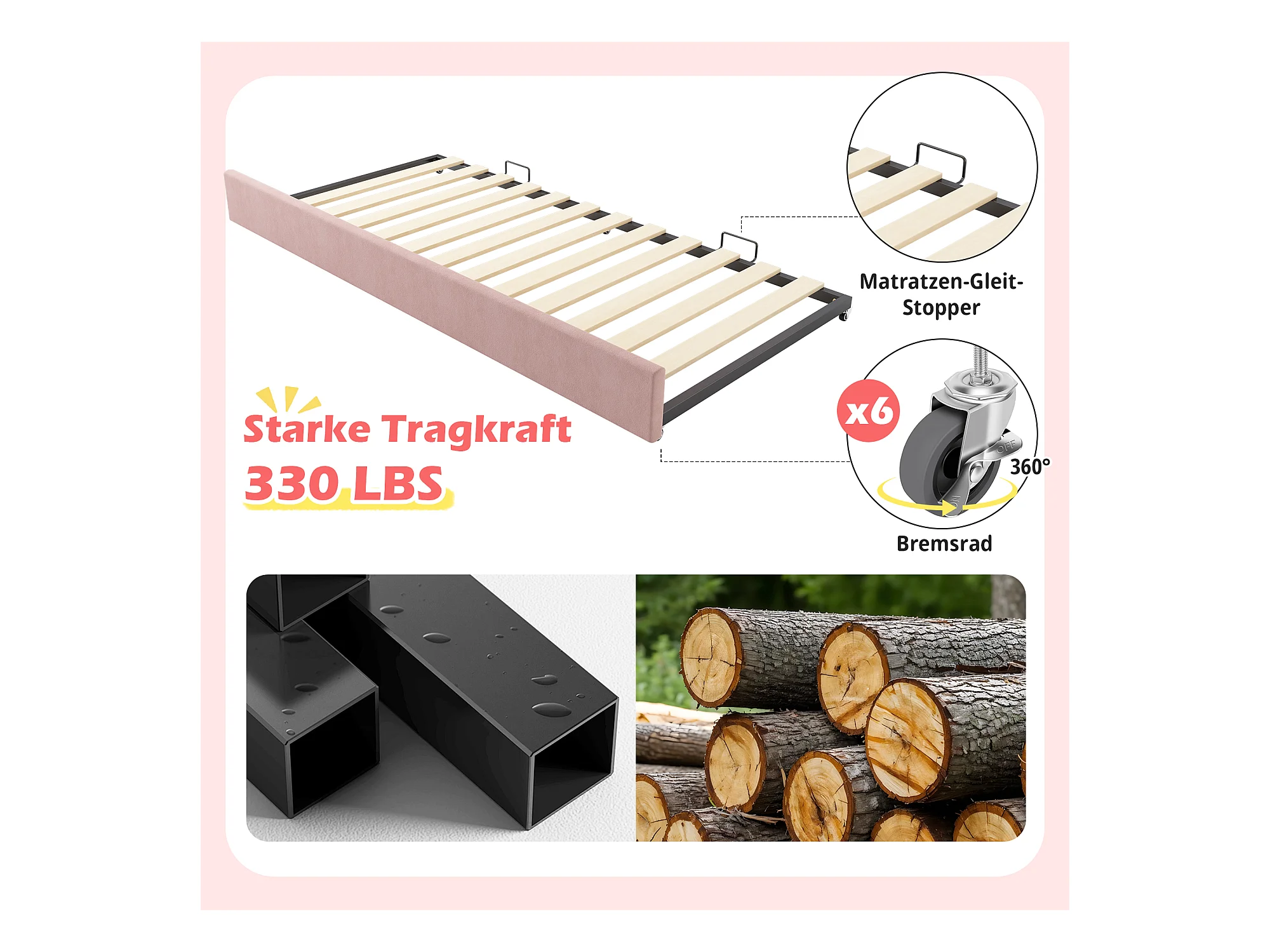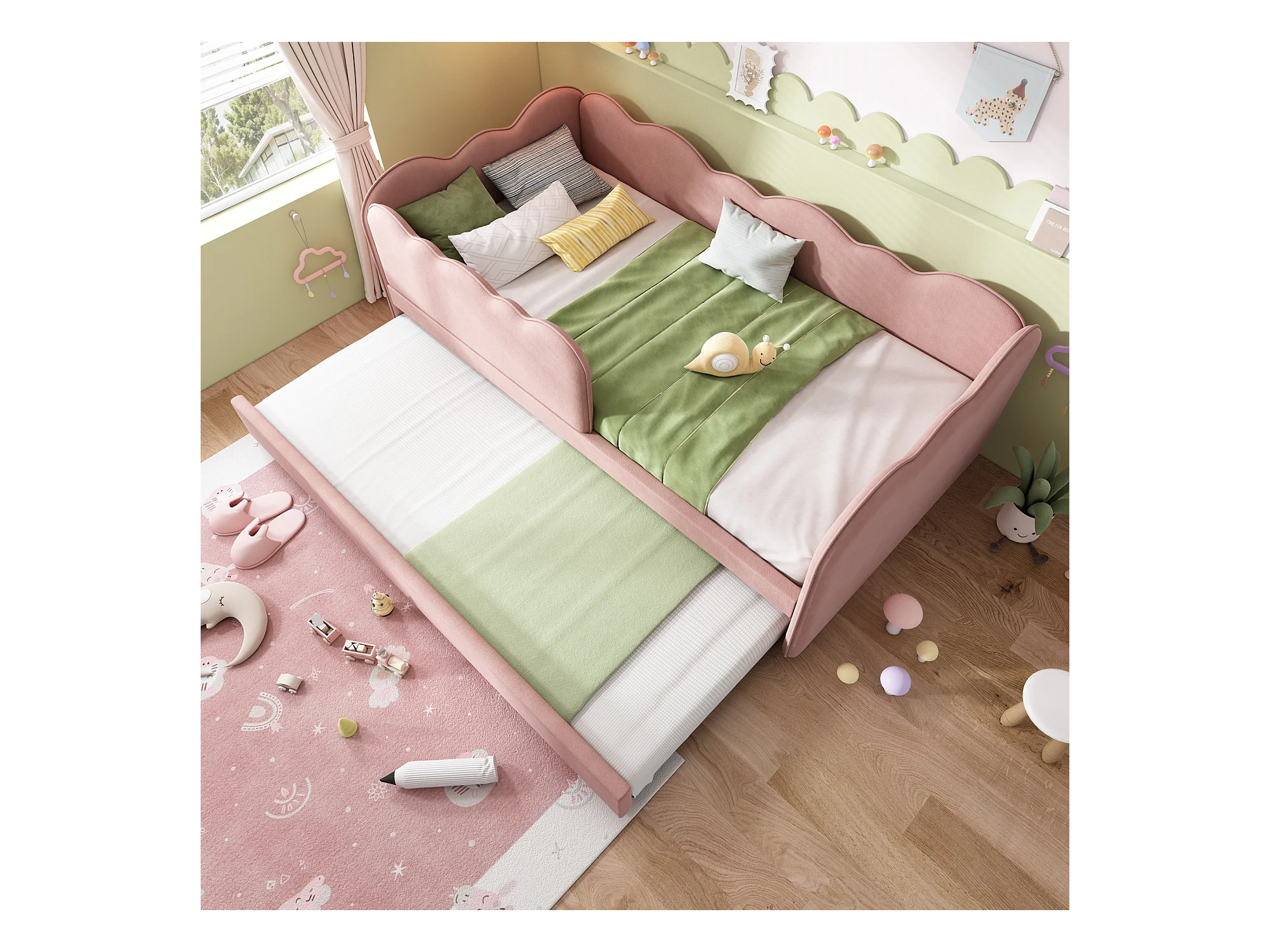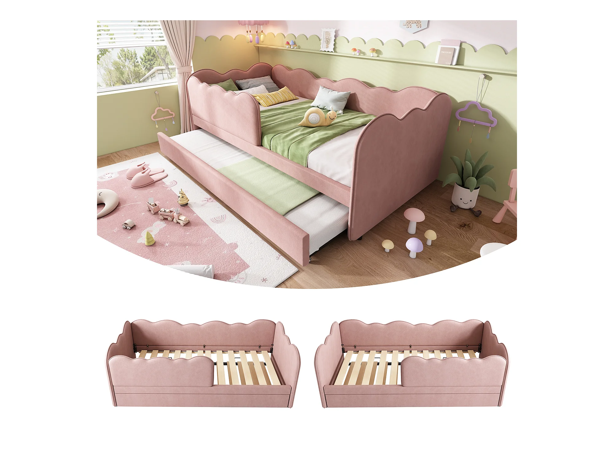 Canapé-lit rembourré - 90 x 190 cm - avec lit gigogne 90 x 190 cm + sommier à lattes - lin - rose