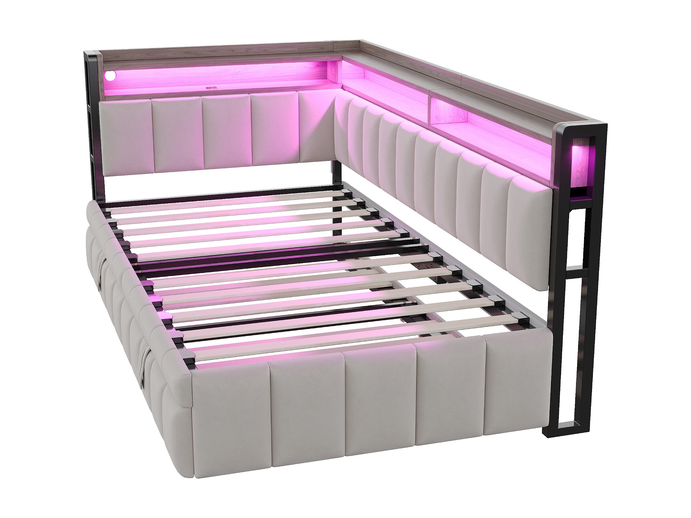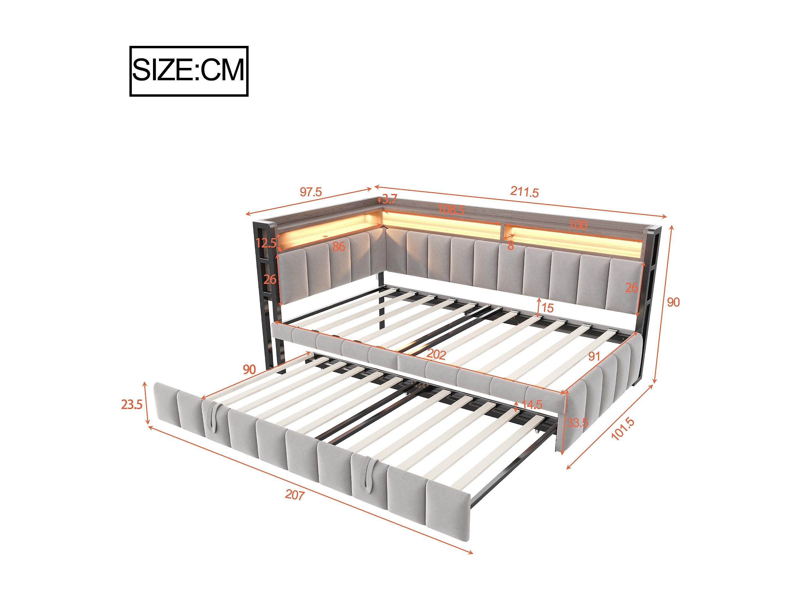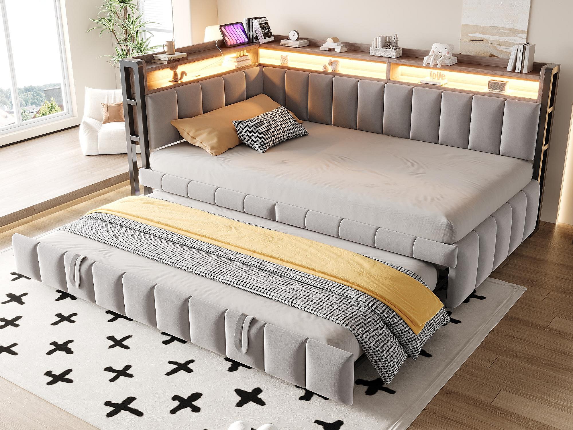Canapé-lit rembourré 90x200 cm - avec lit gigogne - éclairage LED - ports USB et Type-C - gris clair (matelas non inclus)