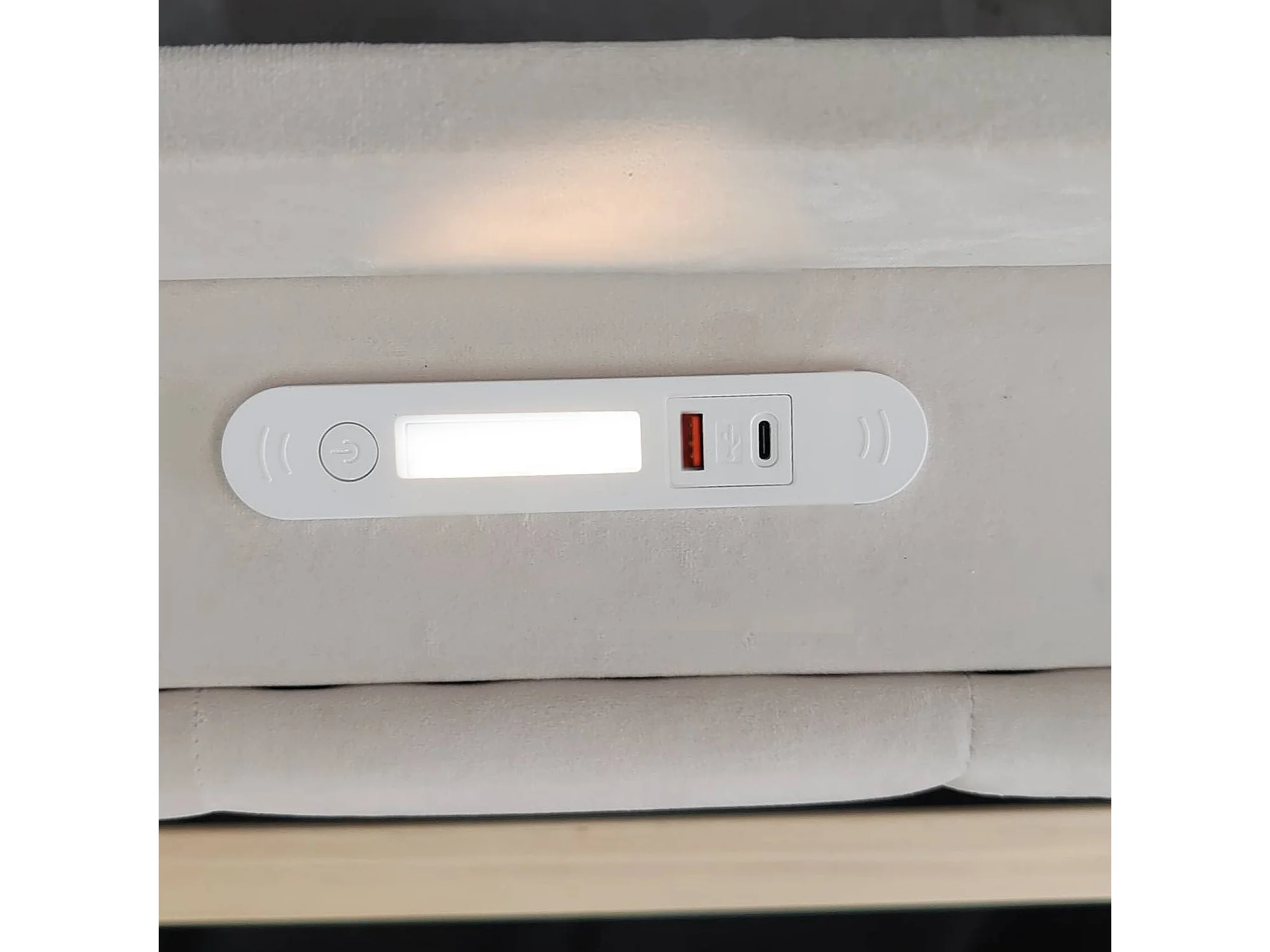 Canapé-lit velours multifonction, rangement hydraulique, LED, ports USB/Type-C, tête rembourrée, beige (90x200x81cm)