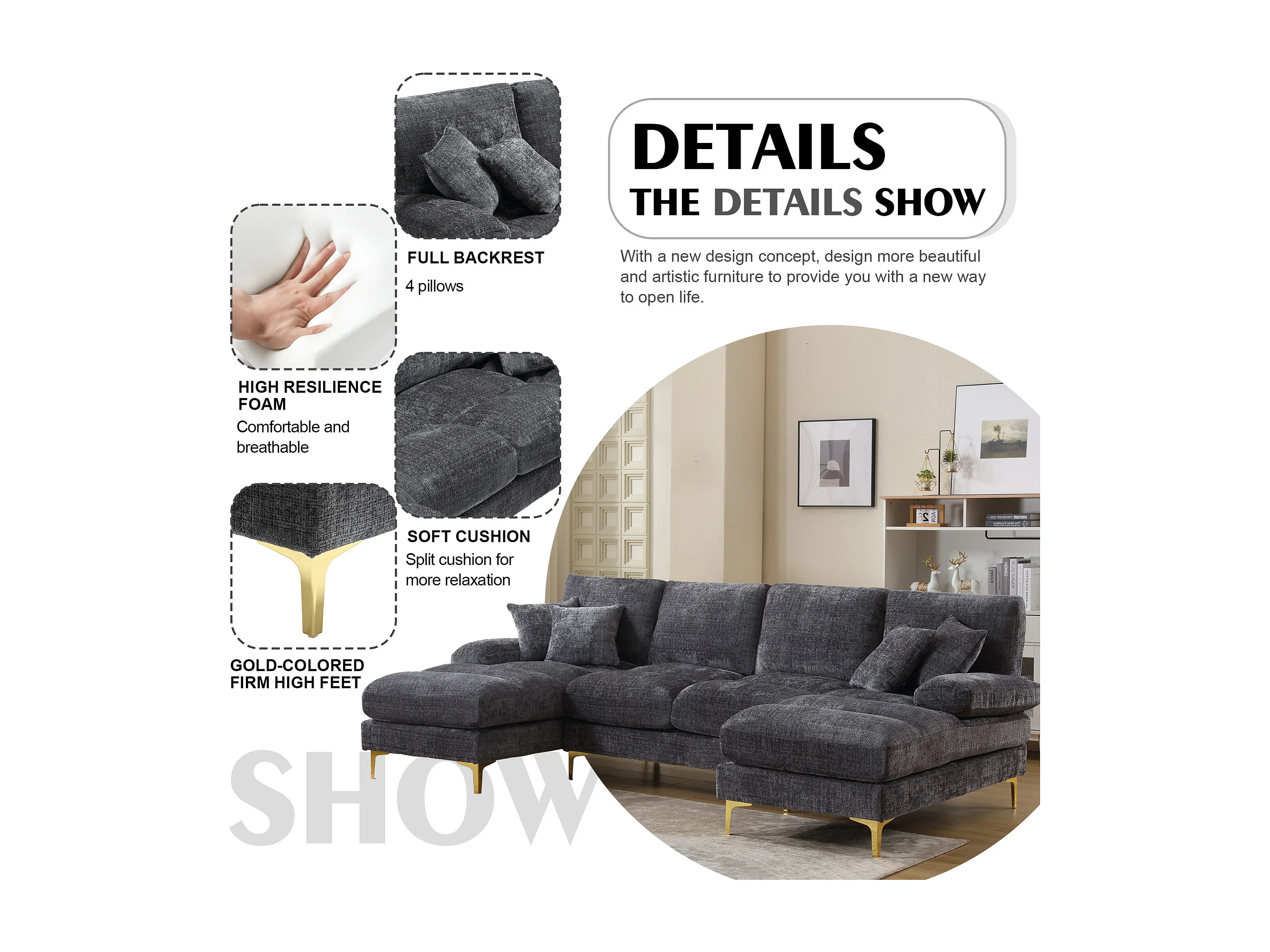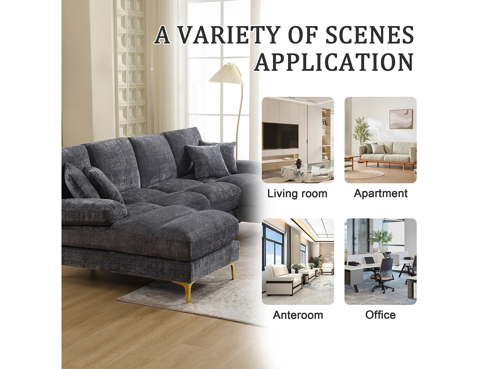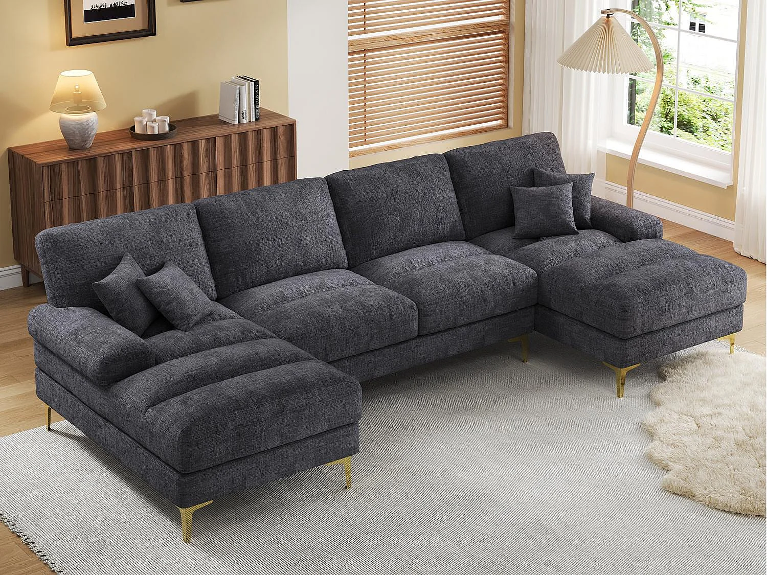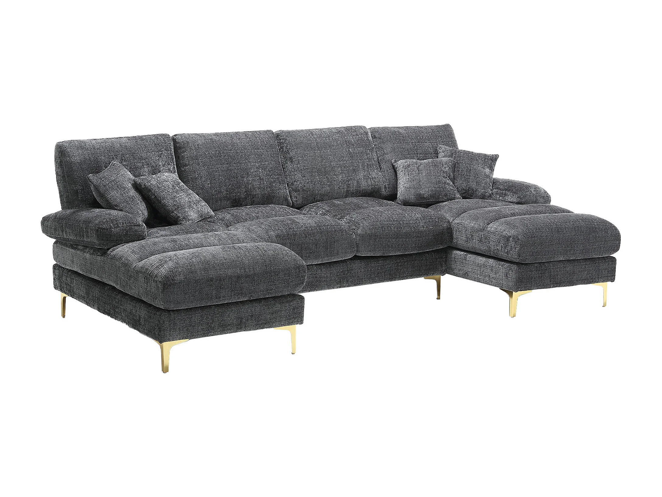 Canapé 4 Places Panoramique en Chenille Gris à Double Couche (272x136x88 cm) - Pieds Dorés pour un Confort Exceptionnel