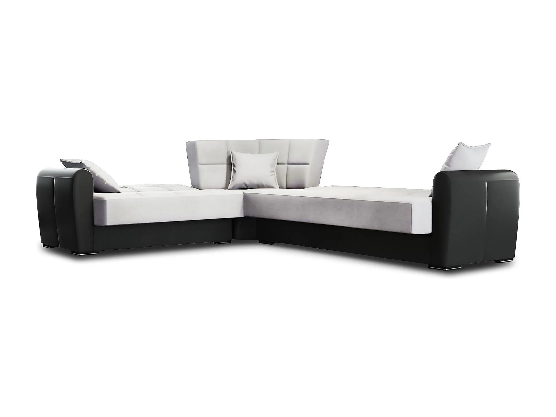 Canapé Matias, Canapé d'angle conteneur en éco-cuir et tissu, Canapé de salon avec ouverture clic-clac et péninsule réversible, 305x238h91 cm, Noir et Gris Clair