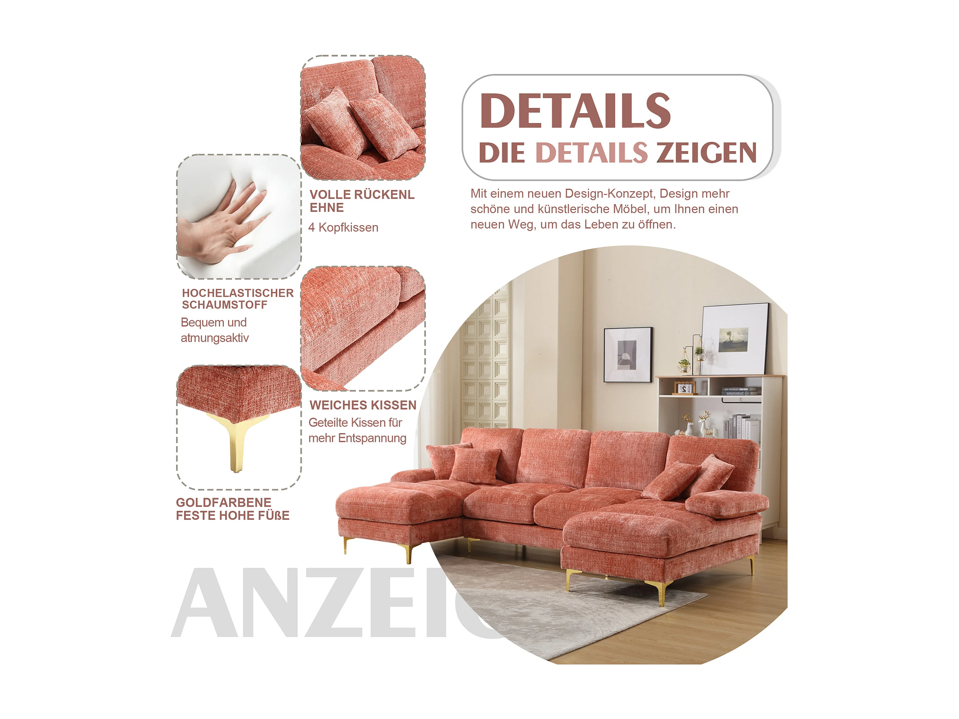 Canapé moderne en U - 272 x 136 x 88 cm - avec 2 places inclinables pour salon - velours - rose