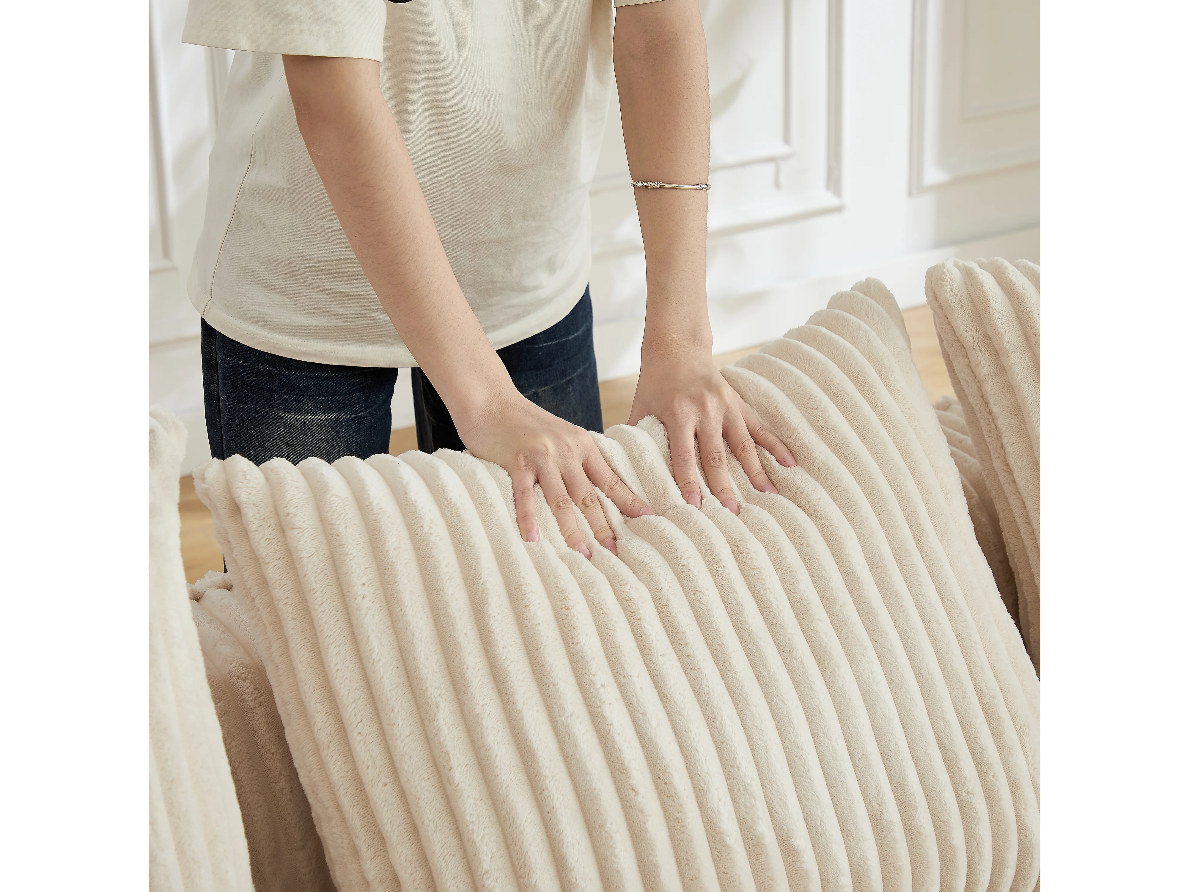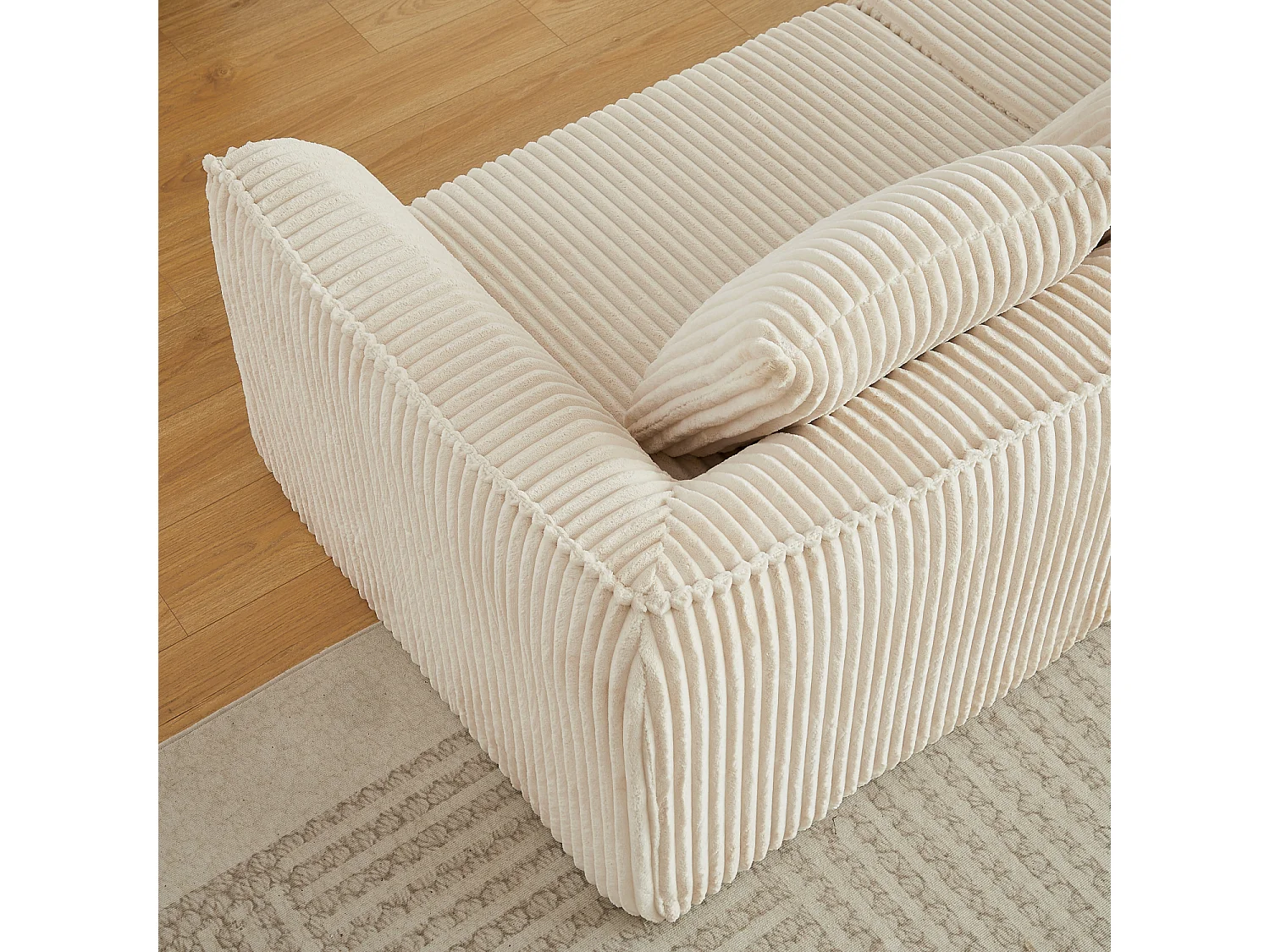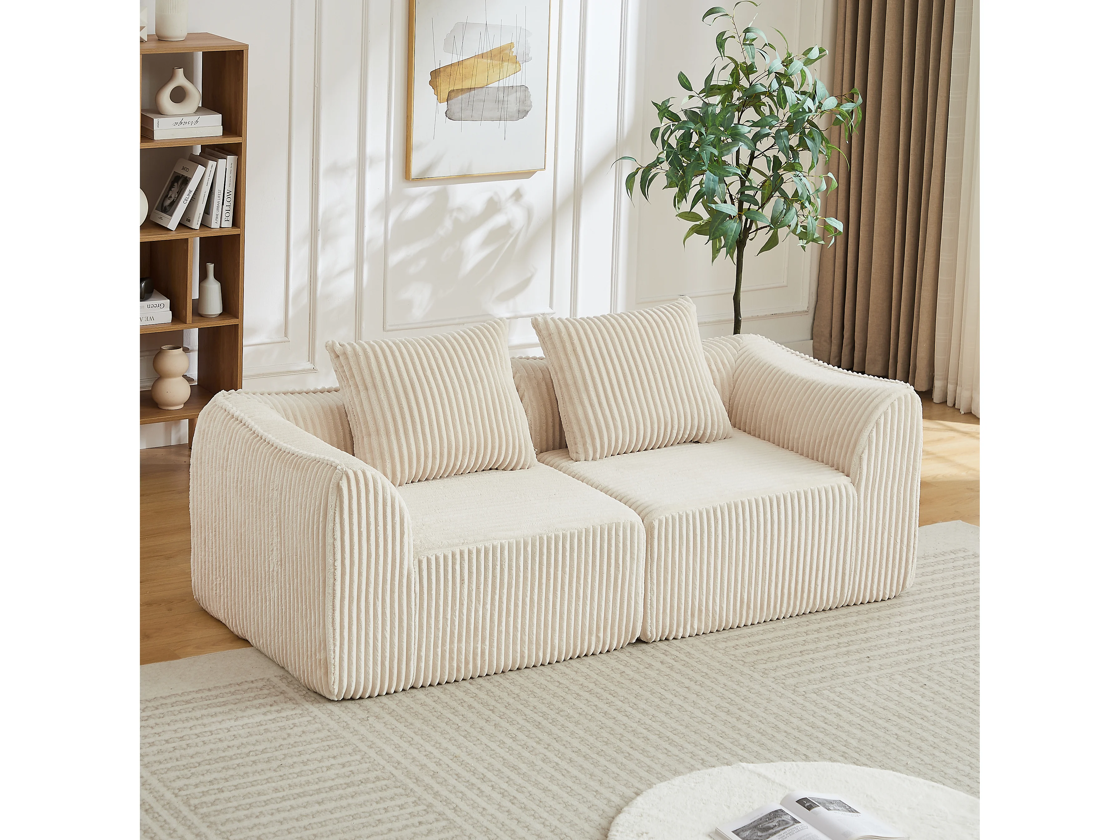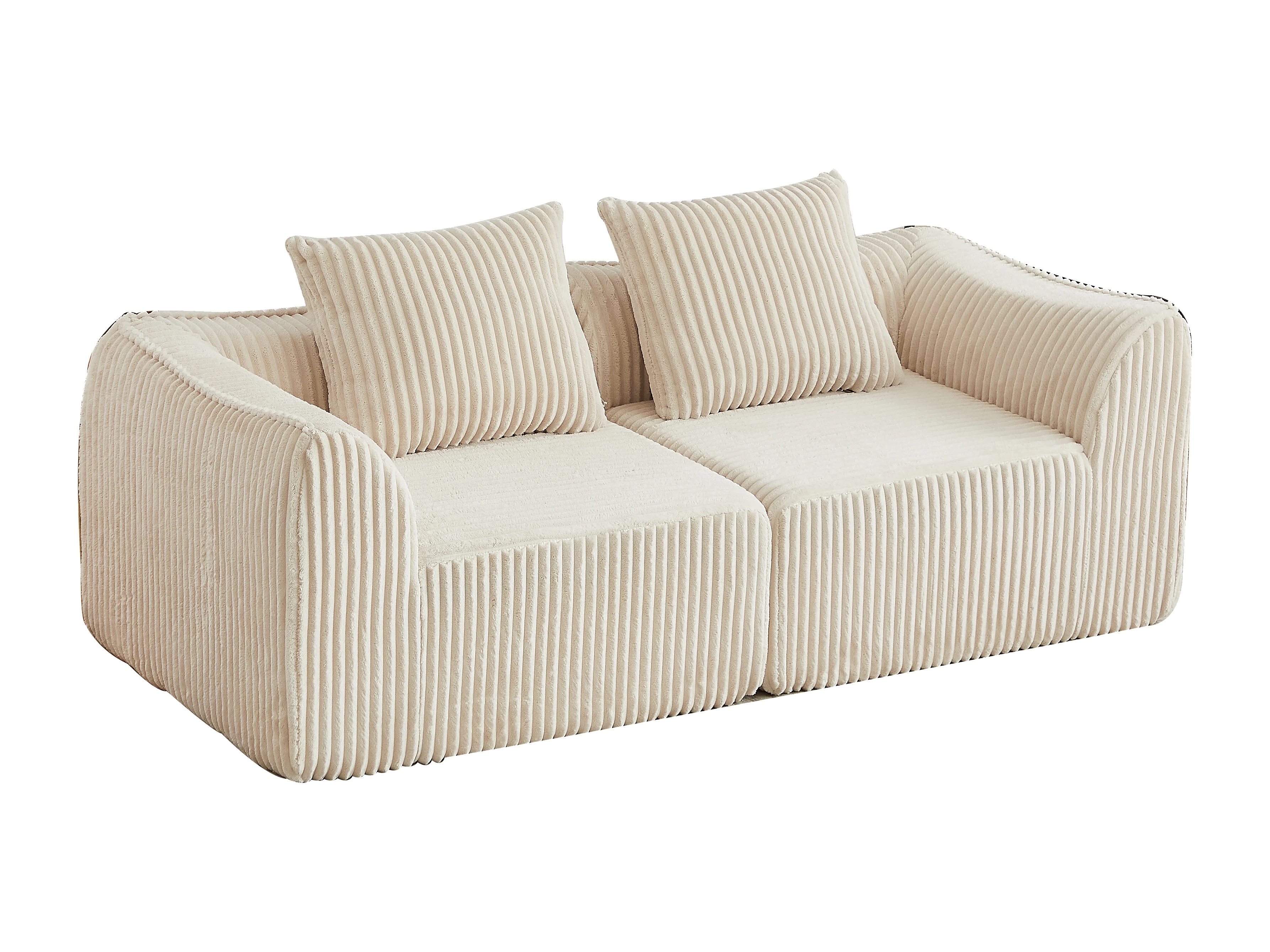 Canapé modulable 2 places en tissu velours côtelé beige avec 2 coussins