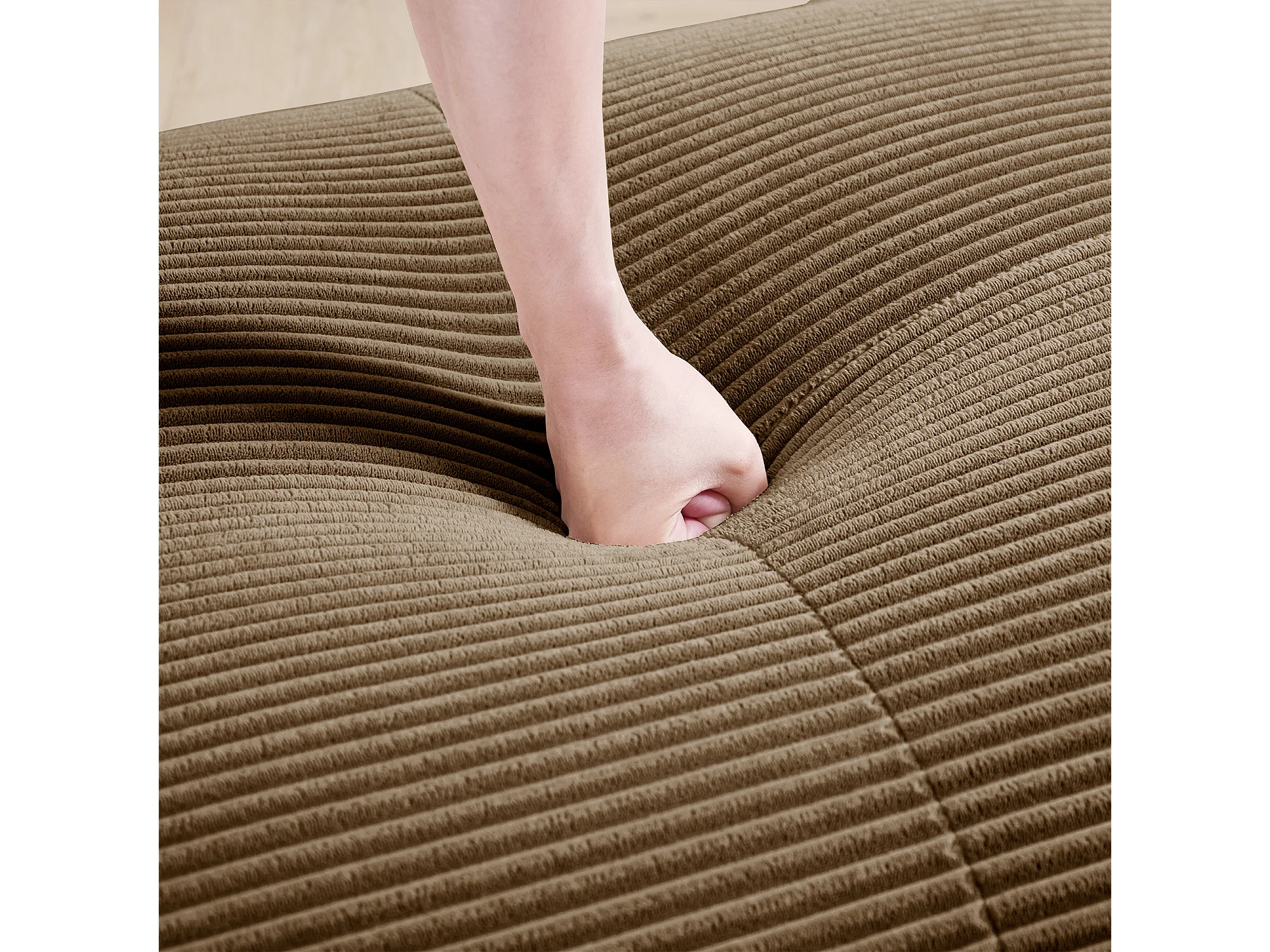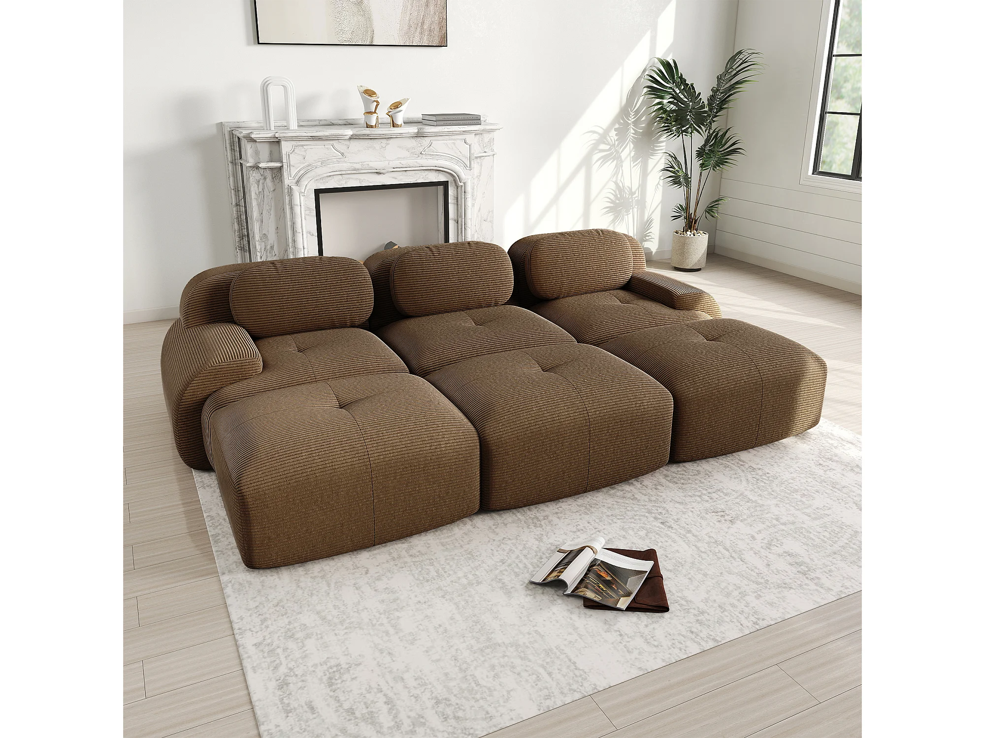 Canapé modulable 3 places + 3 pouf - velours côtelé - avec 3 oreillers - 32kg/m³ densité assise - 298x178x70cm - Marron