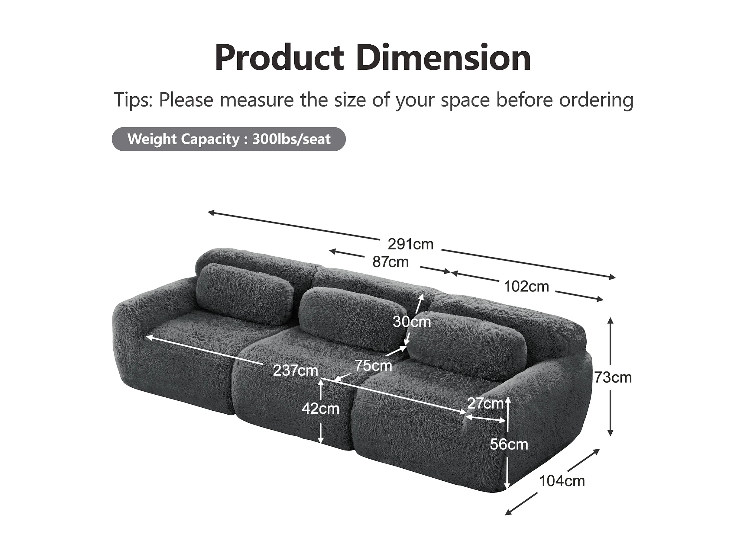Canapé Modulable 3 places en tissu peluche, avec 3 coussins, sans cadre, 291x104x73cm, Gris