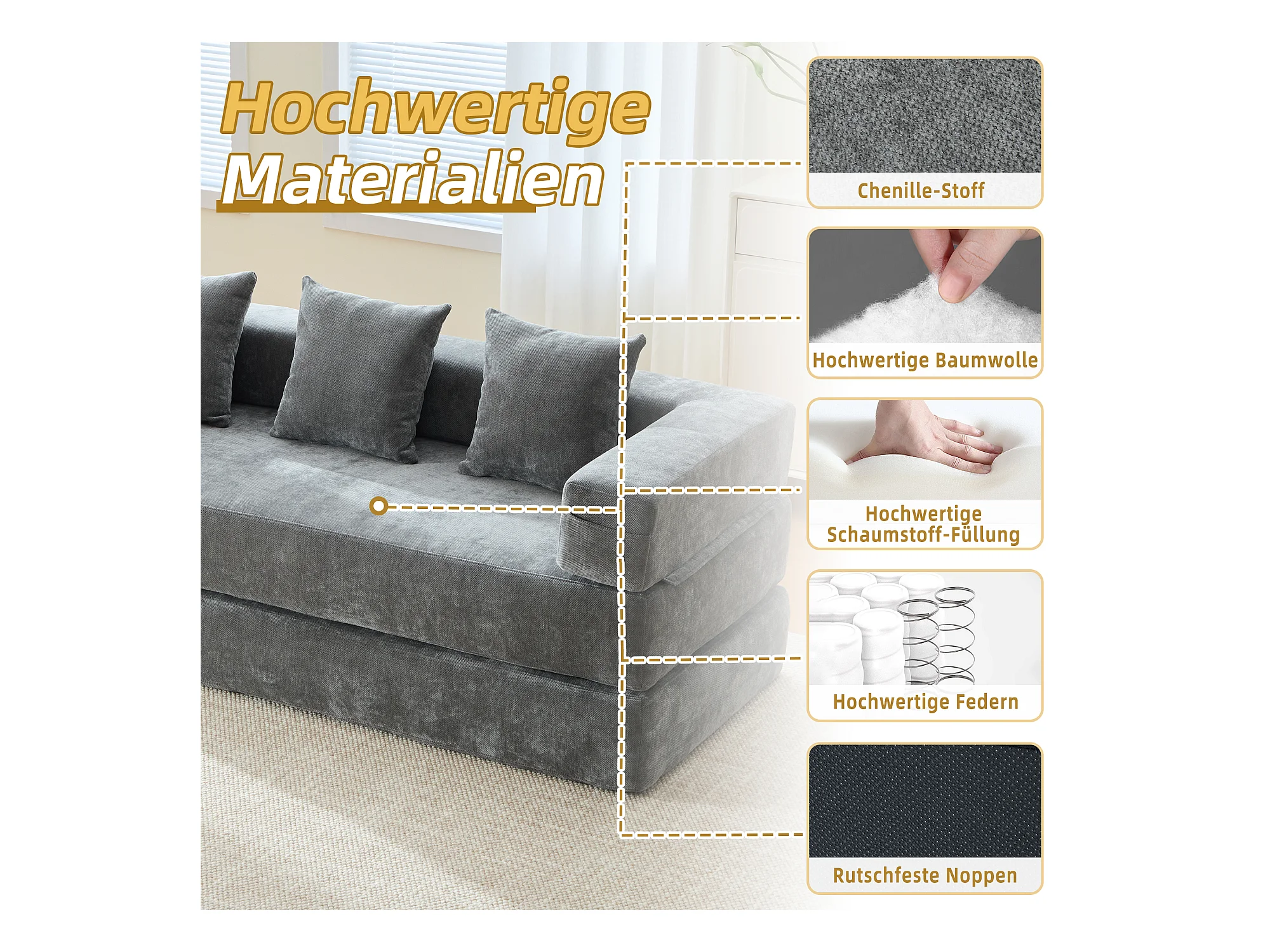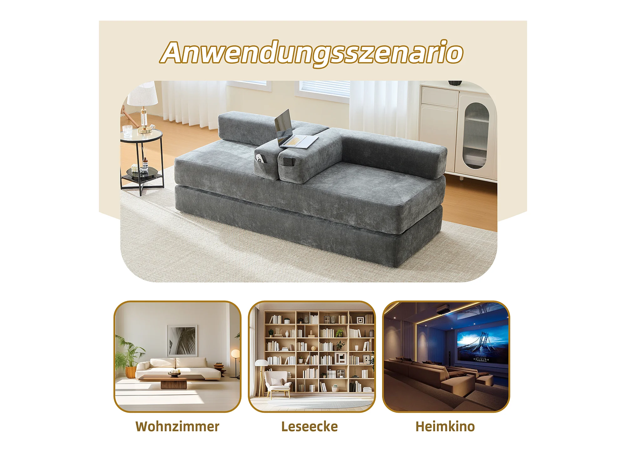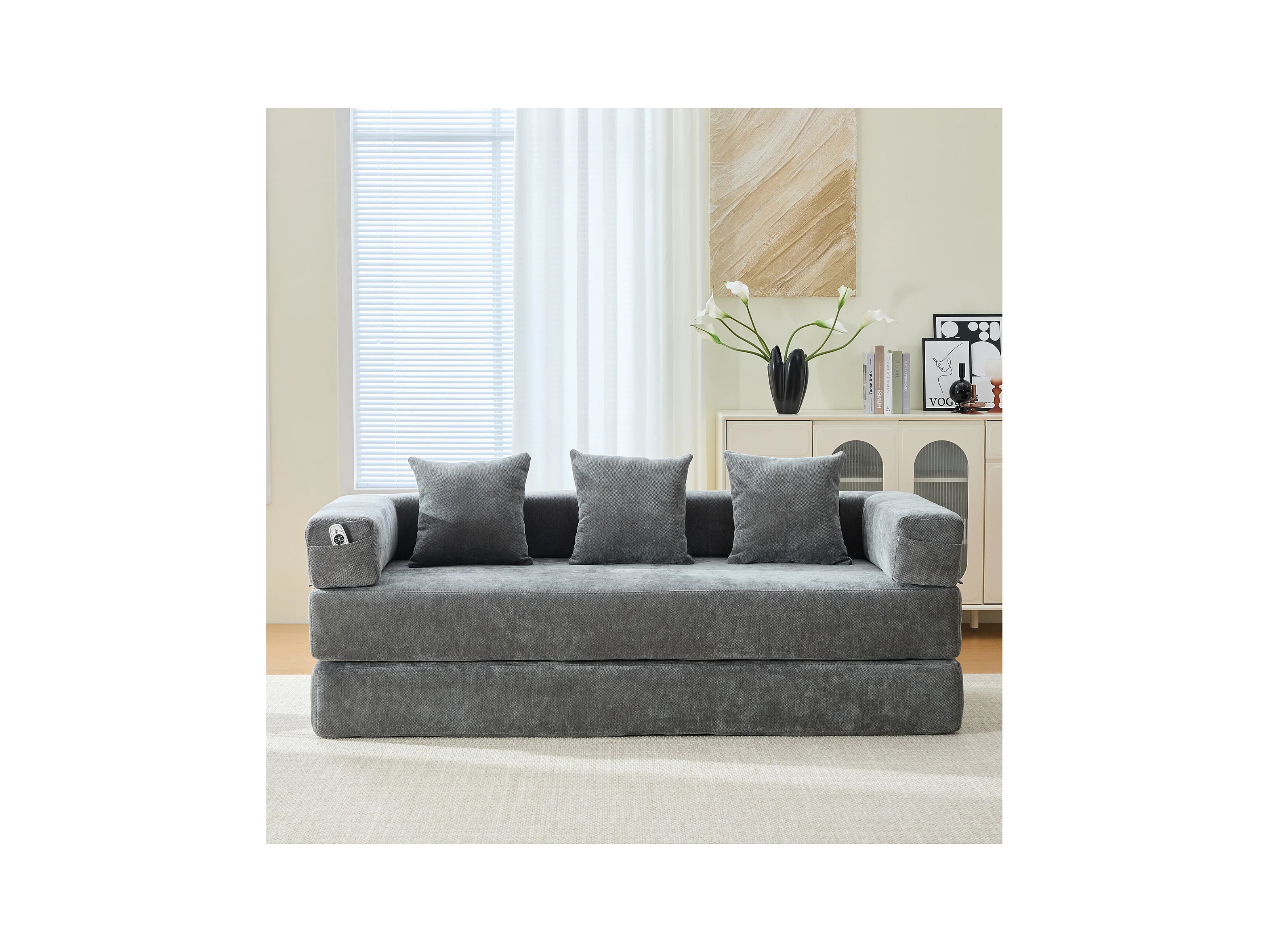 Canapé modulable à volonté - 198 x 79 x 60 cm - convertible - avec poches latérales - chenille - gris