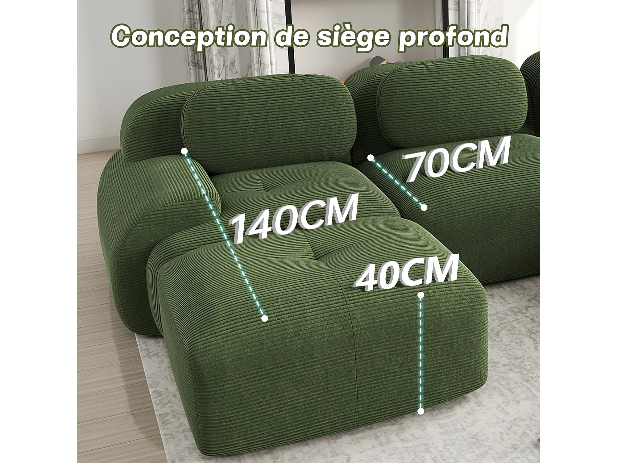 Canapé modulable en velours côtelé - 2 places - avec 2 oreillers et 2 pouf - dessous antidérapant - 208x178x70cm - Vert