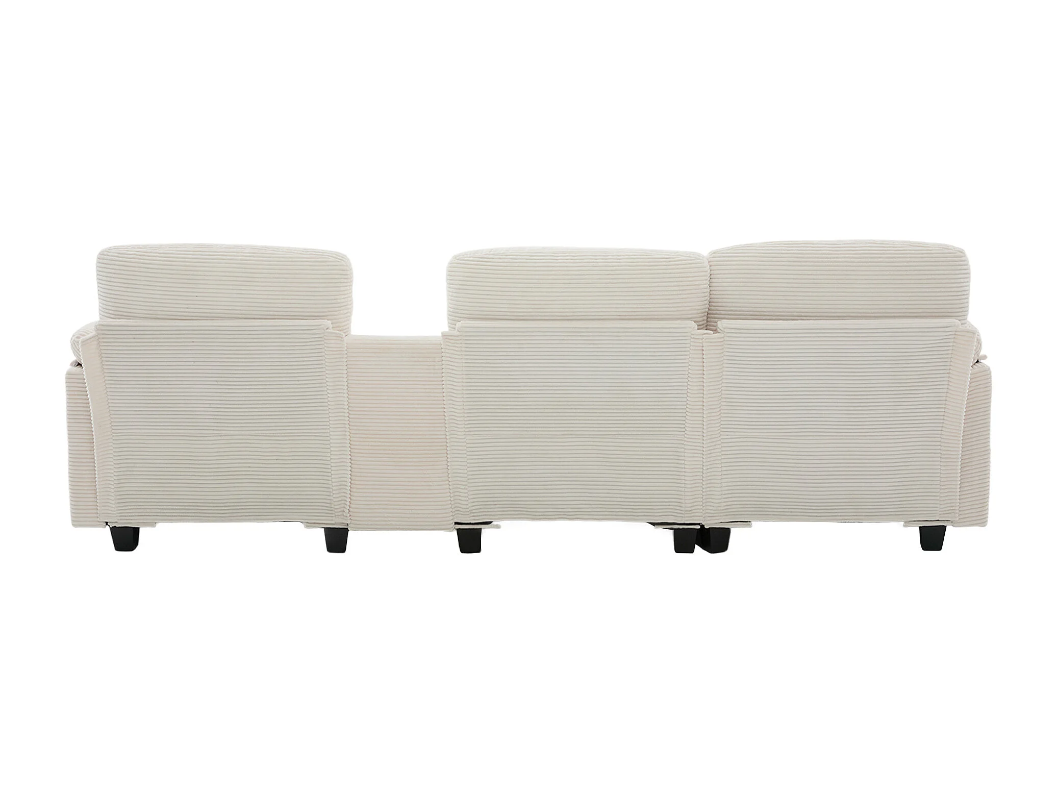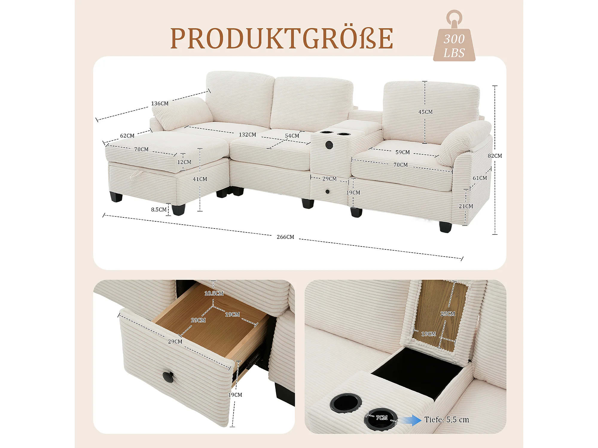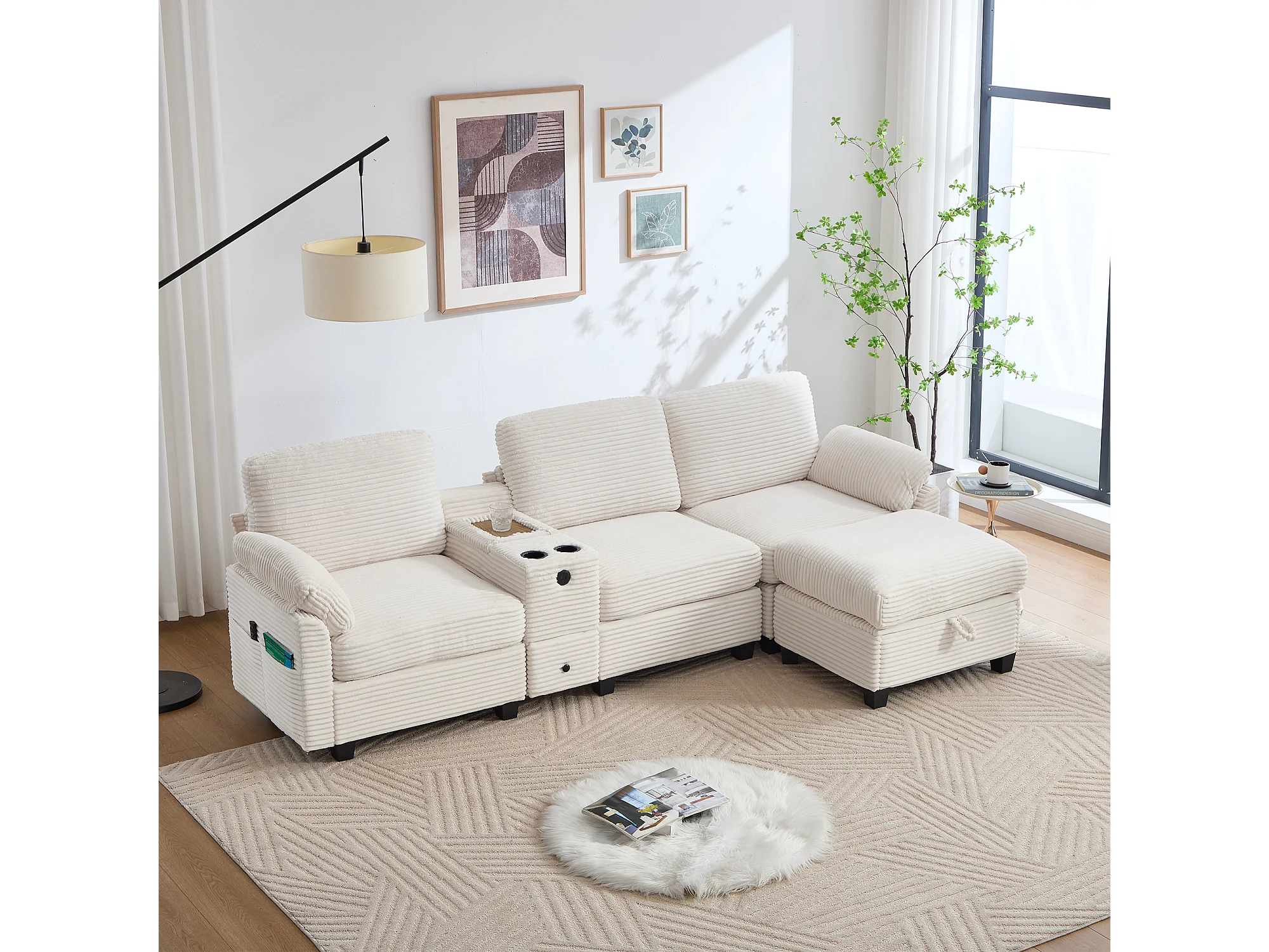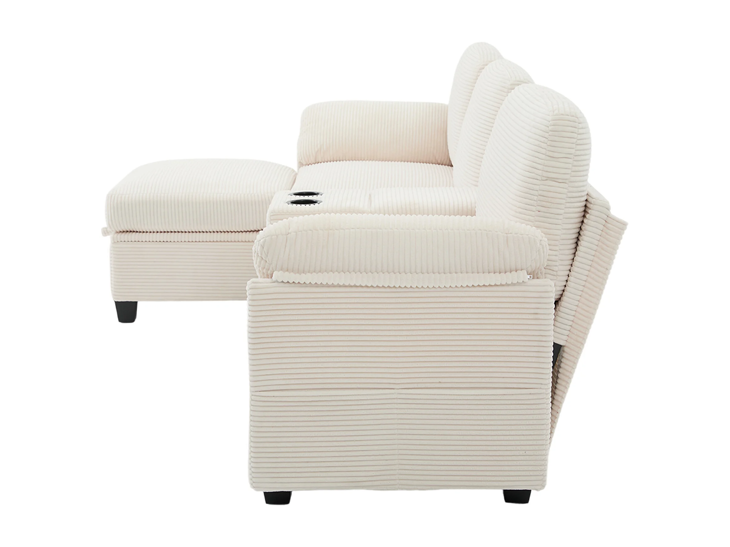 Canapé 266x136x82 cm, mousse haute densité et mousse à mémoire de forme, console centrale avec porte gobelets et USB C, corduroy beige