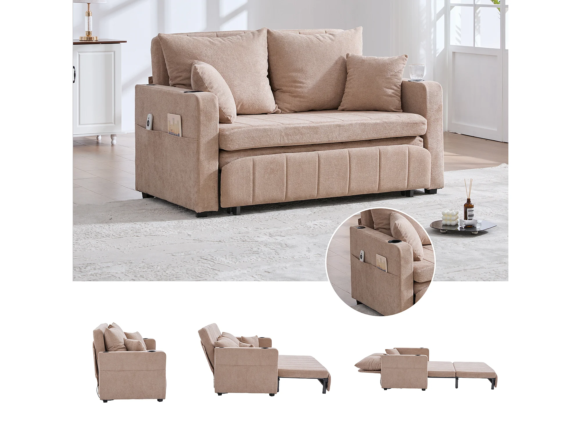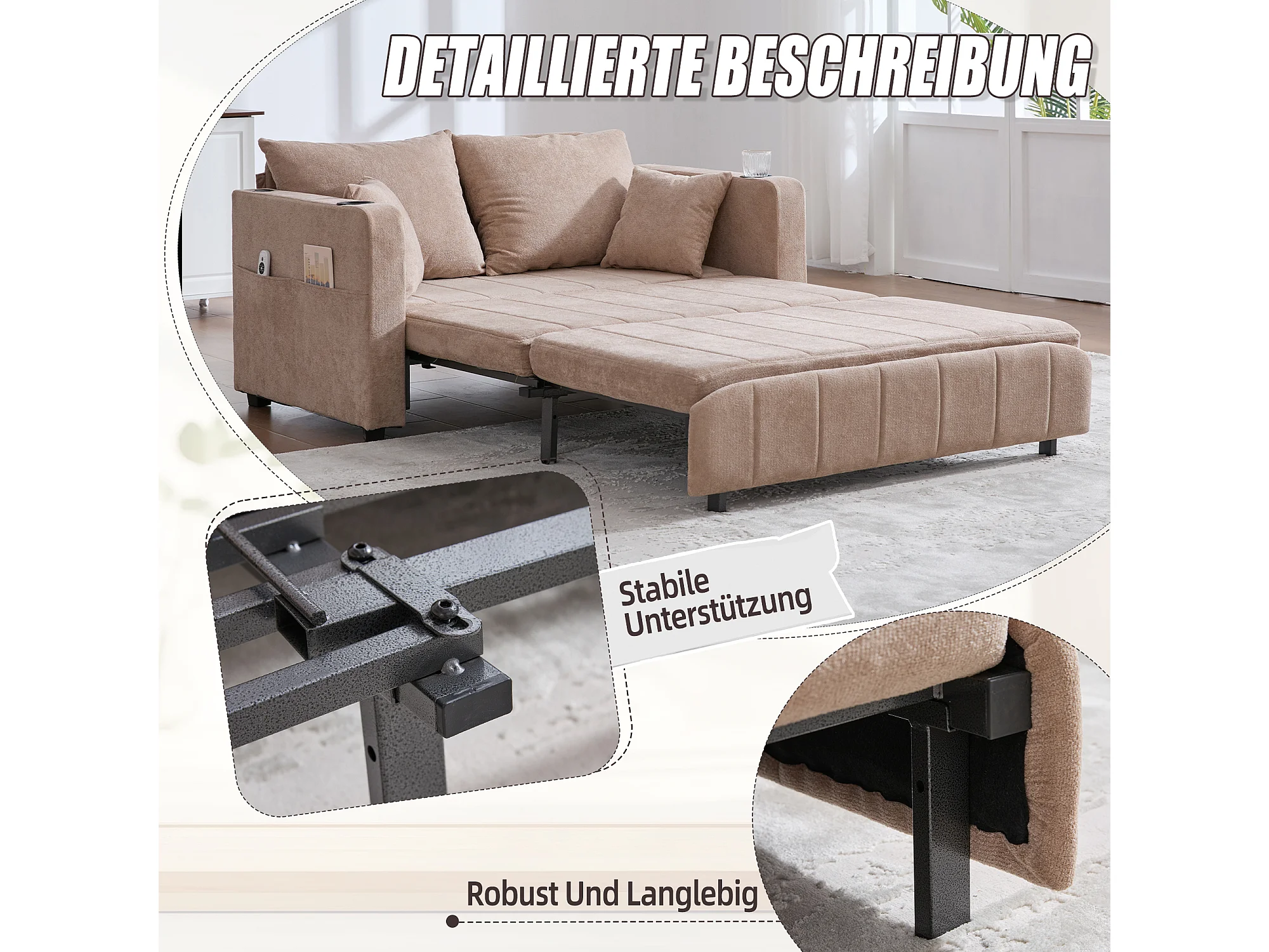 Canapé multifonction en tissu, convertible avec rangement, housse amovible et lavable, avec port USB et porte-gobelet (139x73x83 cm)