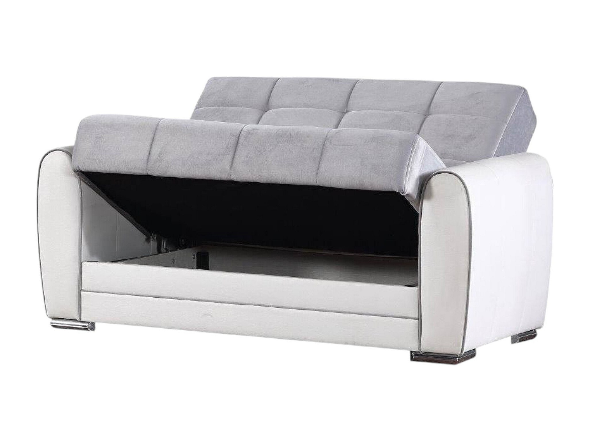Canapé Pablito, Canapé d'angle conteneur en éco-cuir et tissu, Canapé de salon avec ouverture clic-clac et péninsule réversible, 163x84h91 cm, Blanc et Gris