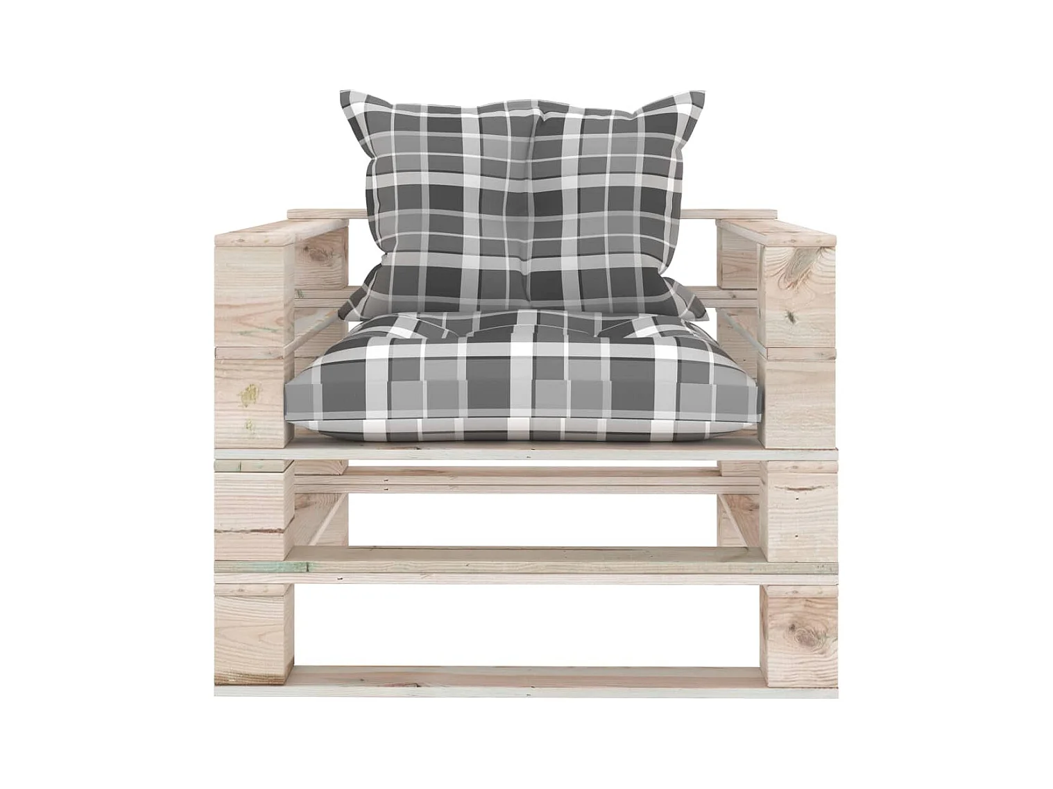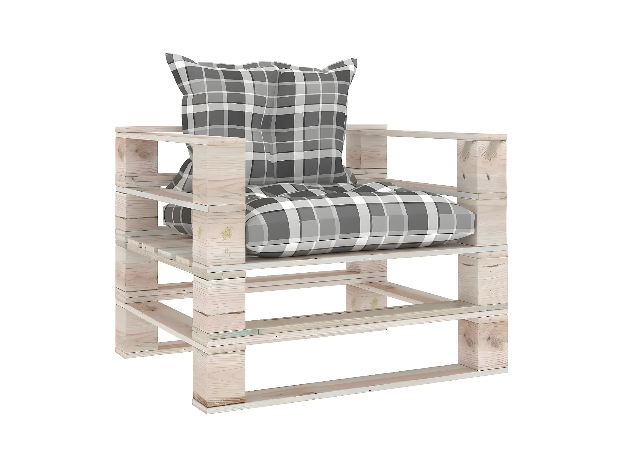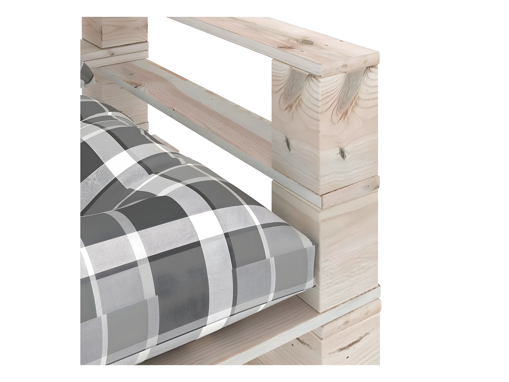 Canapé palette de jardin coussins motif à carreaux gris pinède