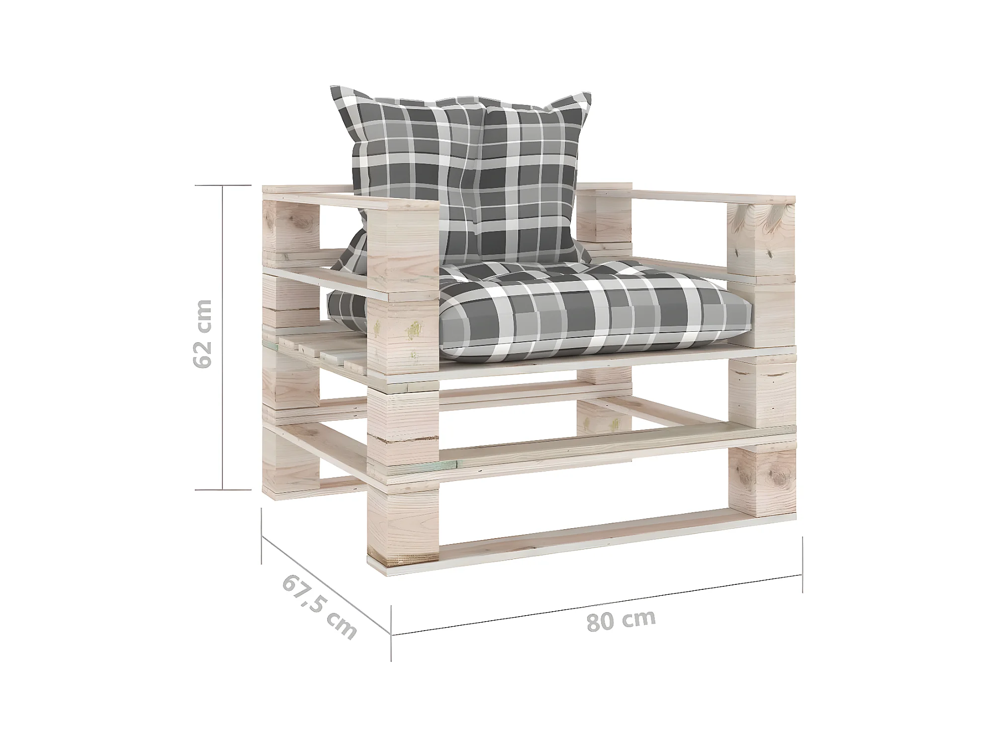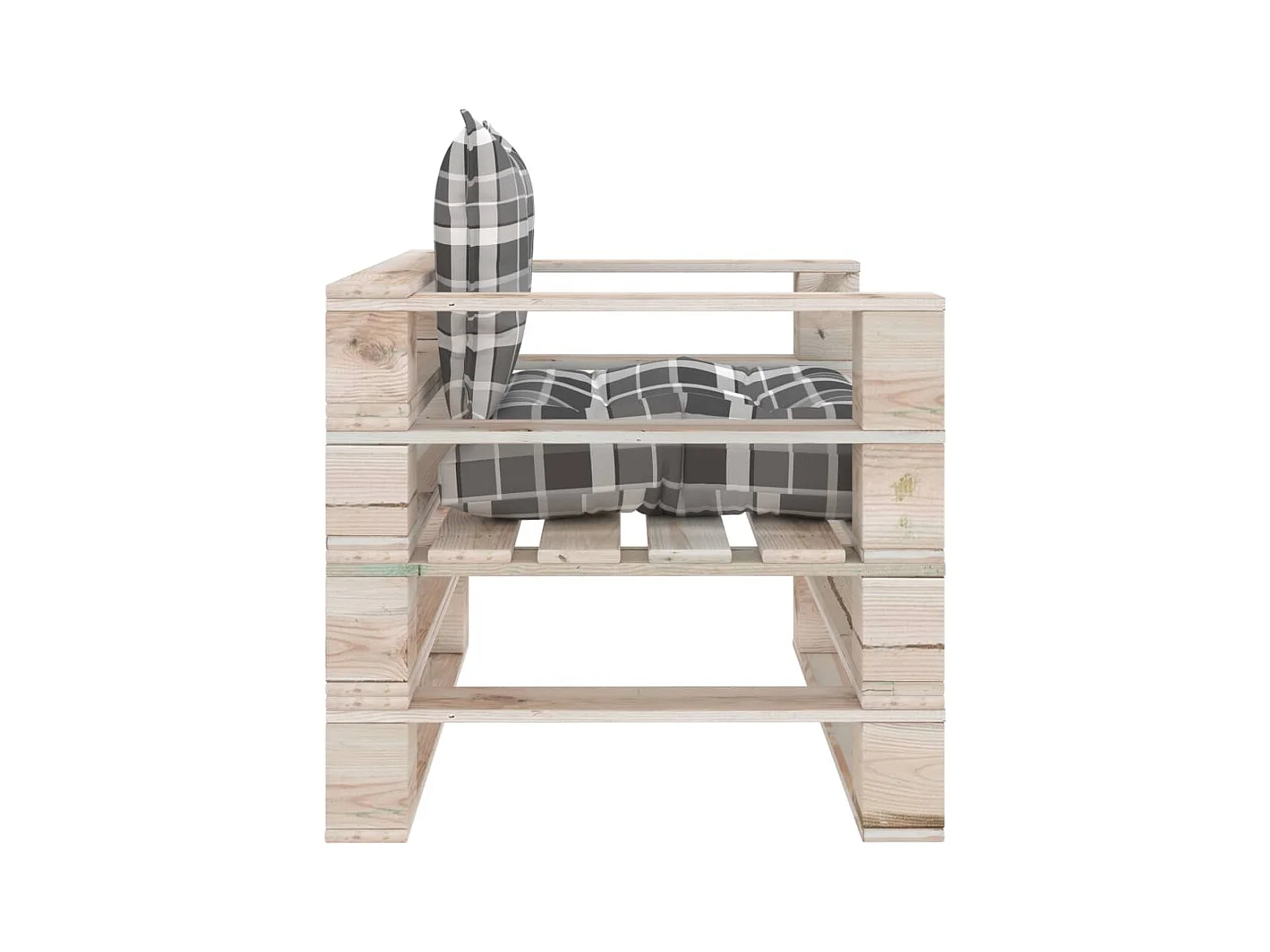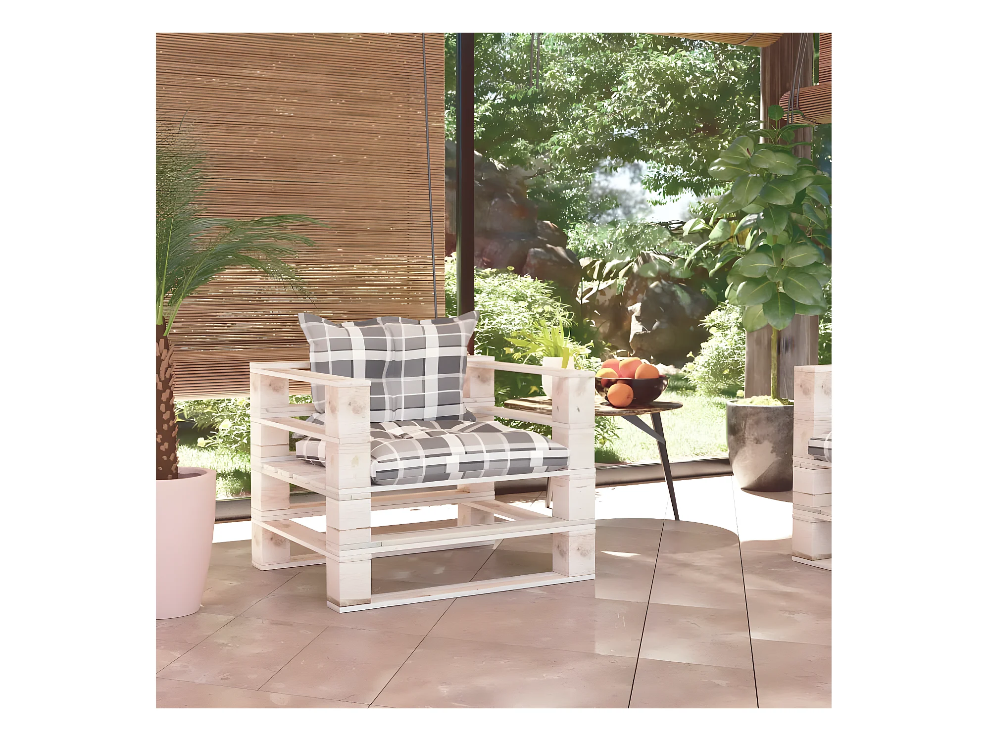 Canapé palette de jardin coussins motif à carreaux gris pinède