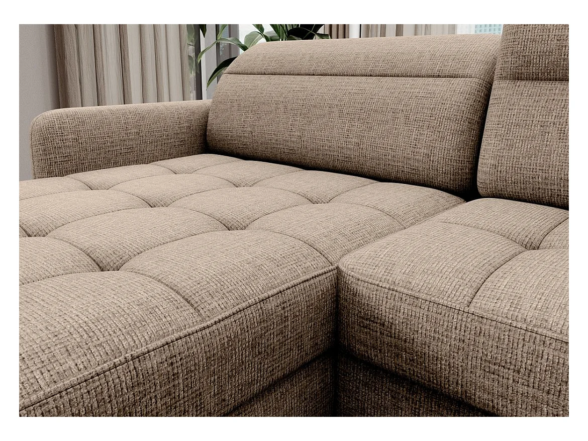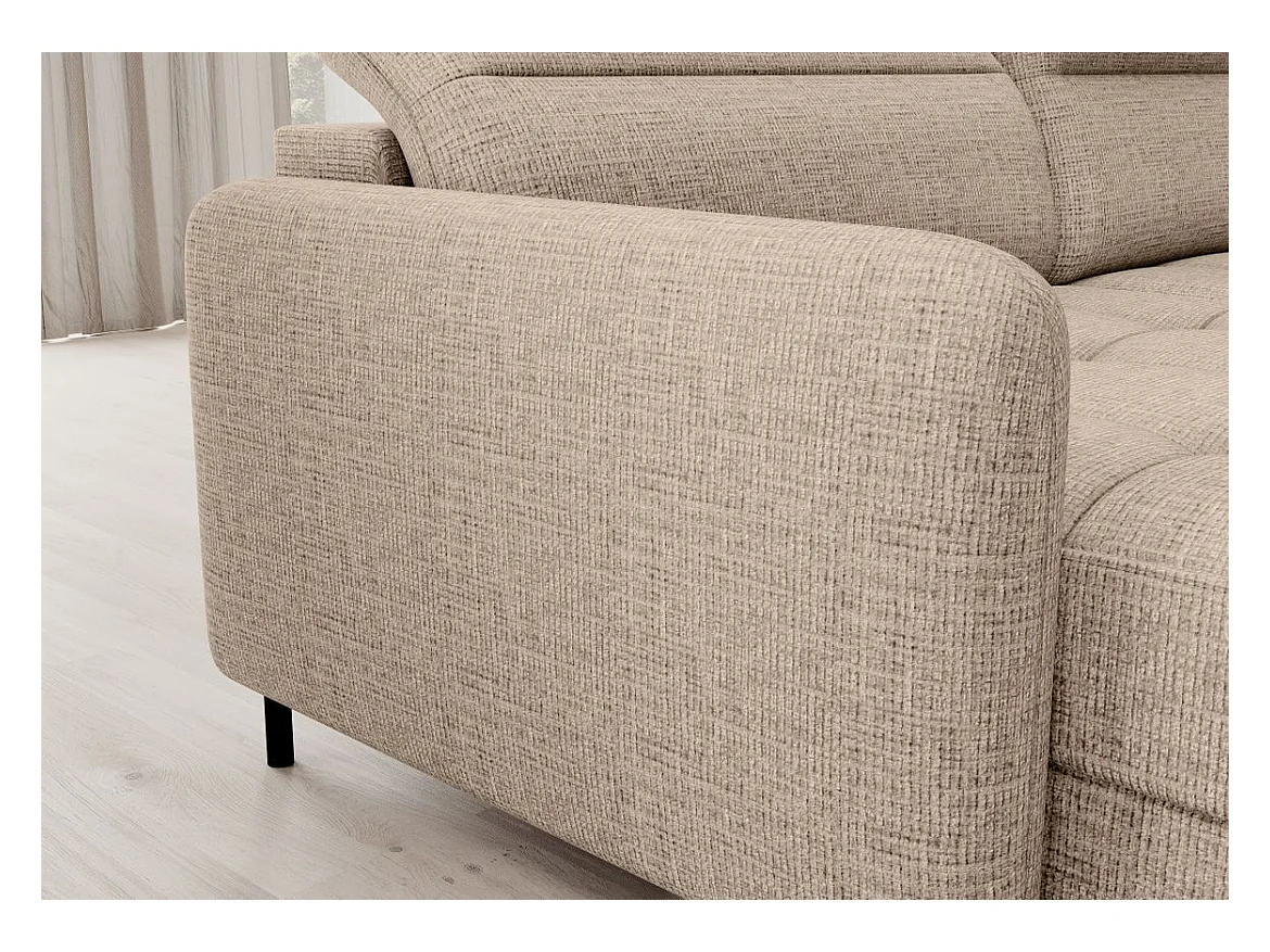 Canapé d’angle convertible tissu appuis-tête réglables KATE – Coffre et pieds métal noir-Beige-angle droit