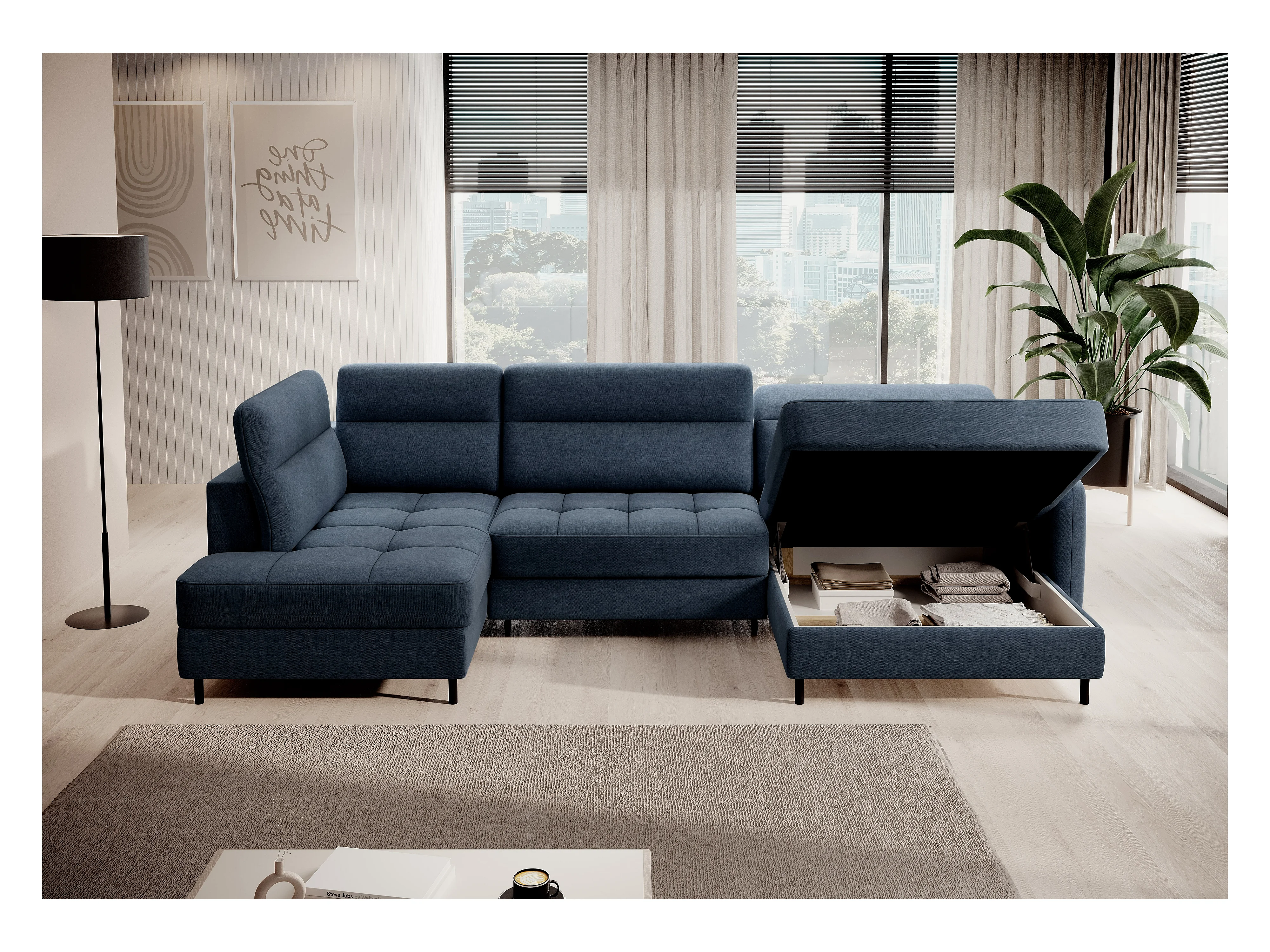 Canapé panoramique convertible BENTO en tissu avec coffre de rangement-Bleu-angle droit