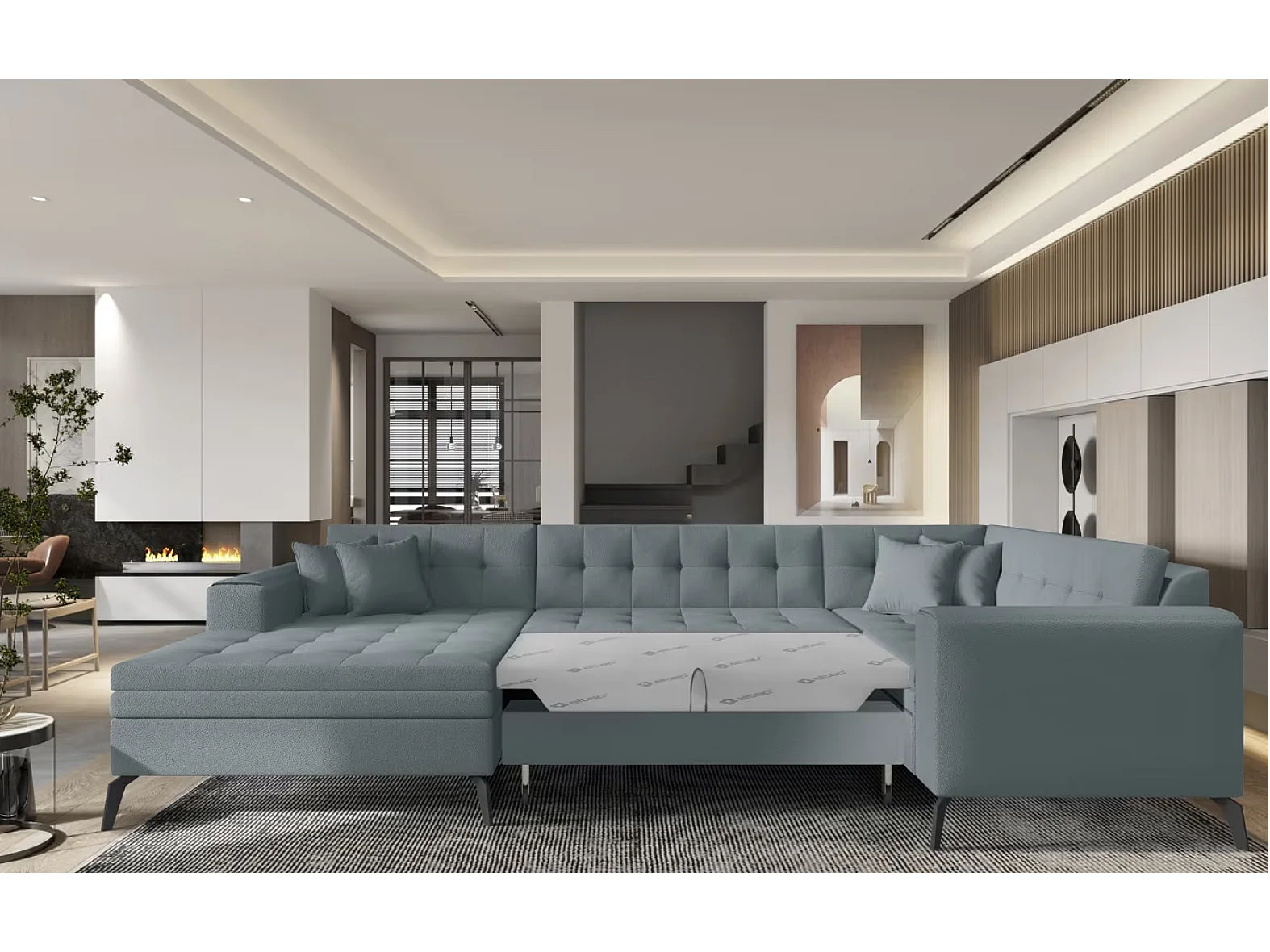 Canapé en U convertible KALANTE tissu - Coffre de rangement et appuie-têtes réglables-Bleu ardoise-Coffre à gauche
