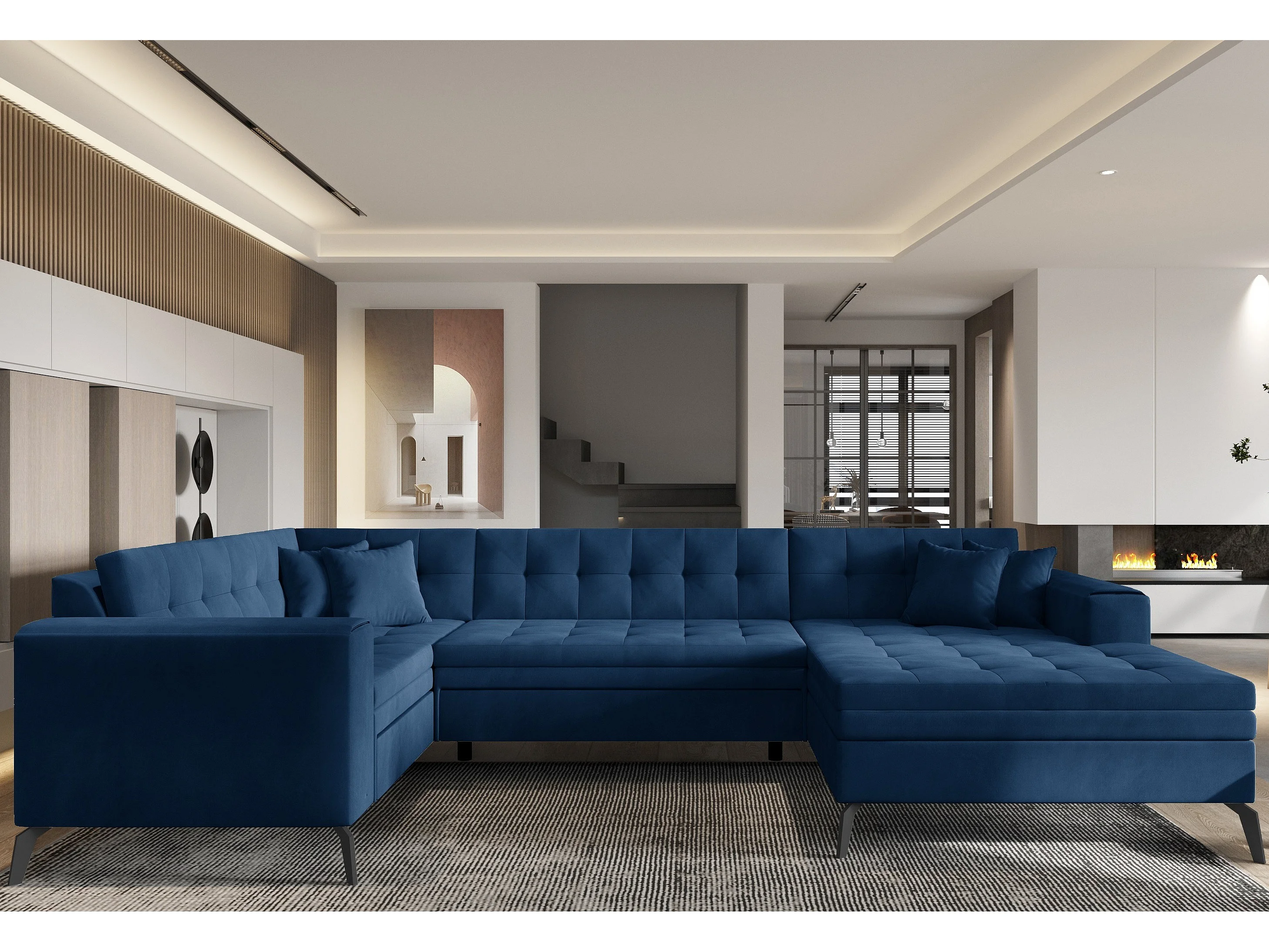 Canapé panoramique convertible droit tissu doux brillant bleu matelassé Bonty 340cm