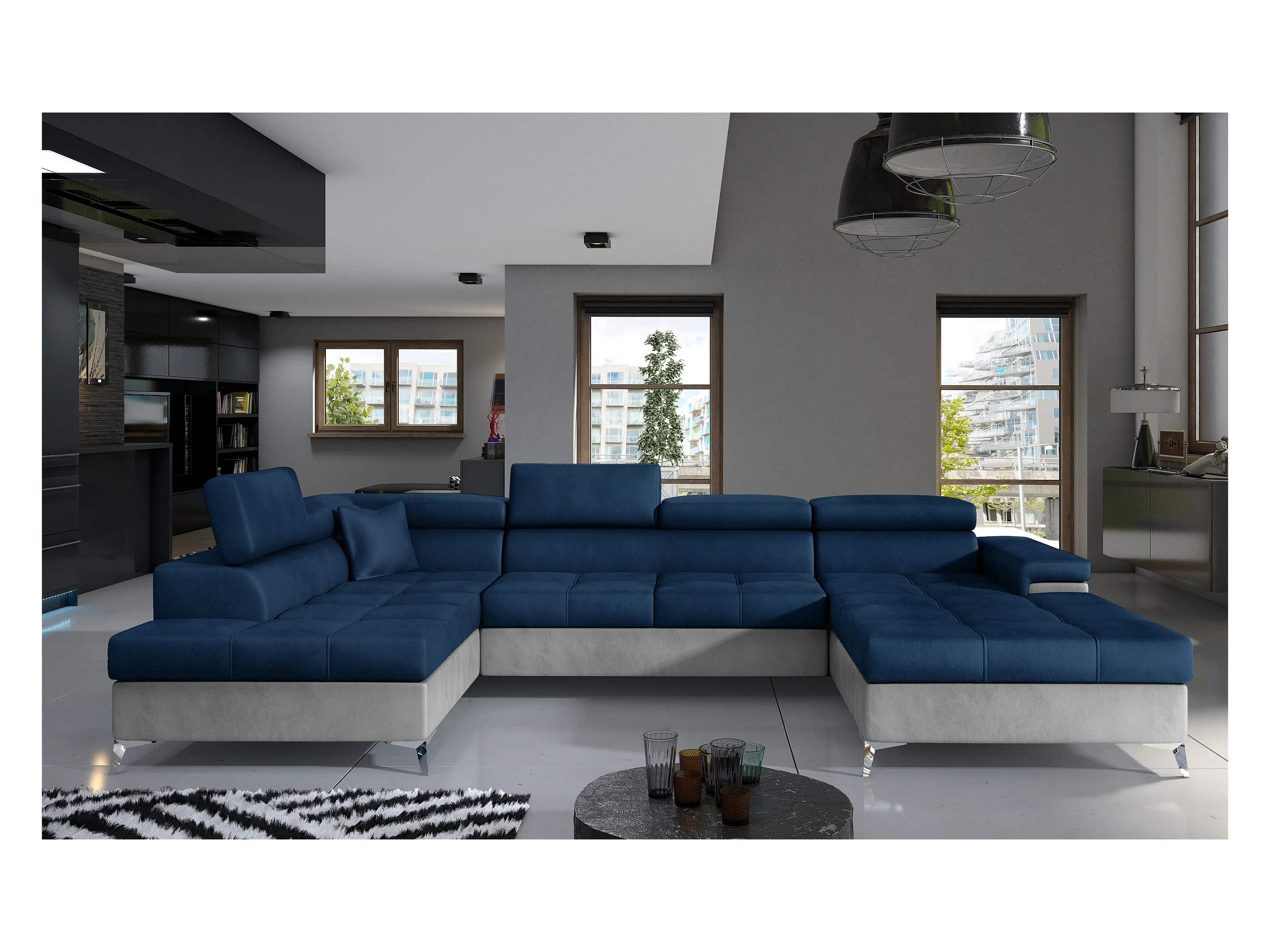 Canapé panoramique convertible KUTTY velours - Rangement et têtières réglables-Gris clair/Bleu-Coffre à droite
