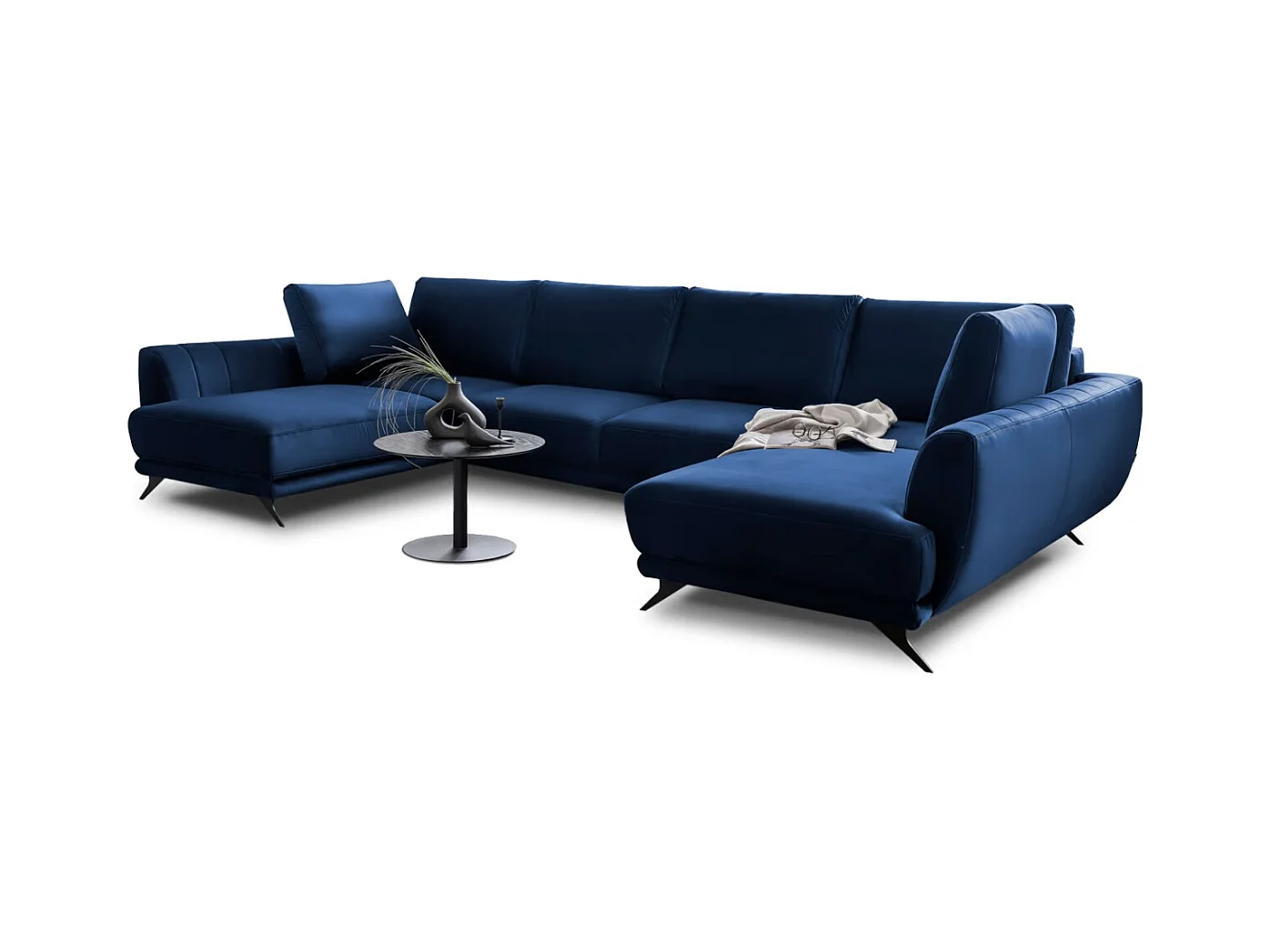 Canapé panoramique convertible design capitonné tissu doux bleu foncé méridienne gauche Boston 350cm