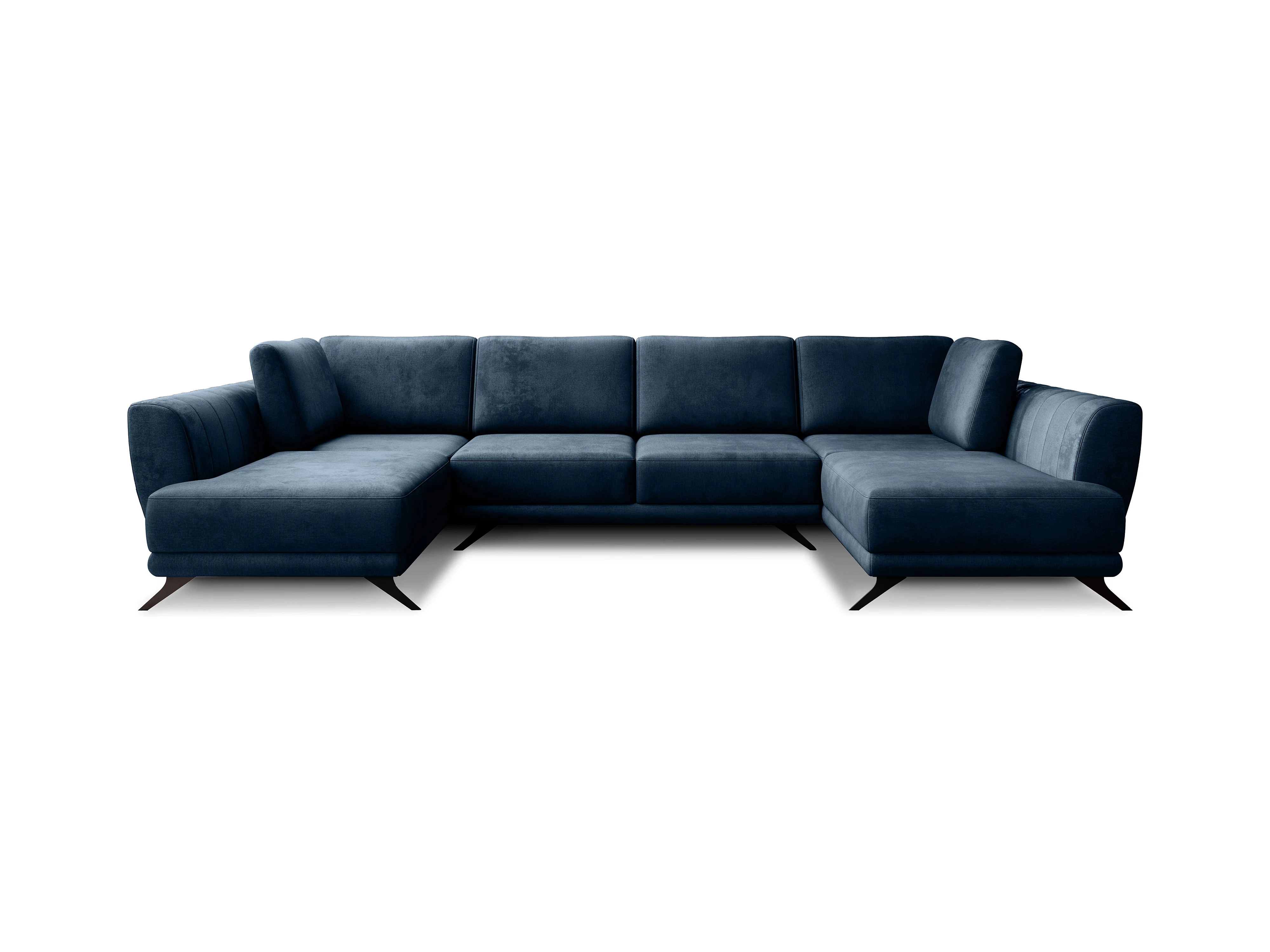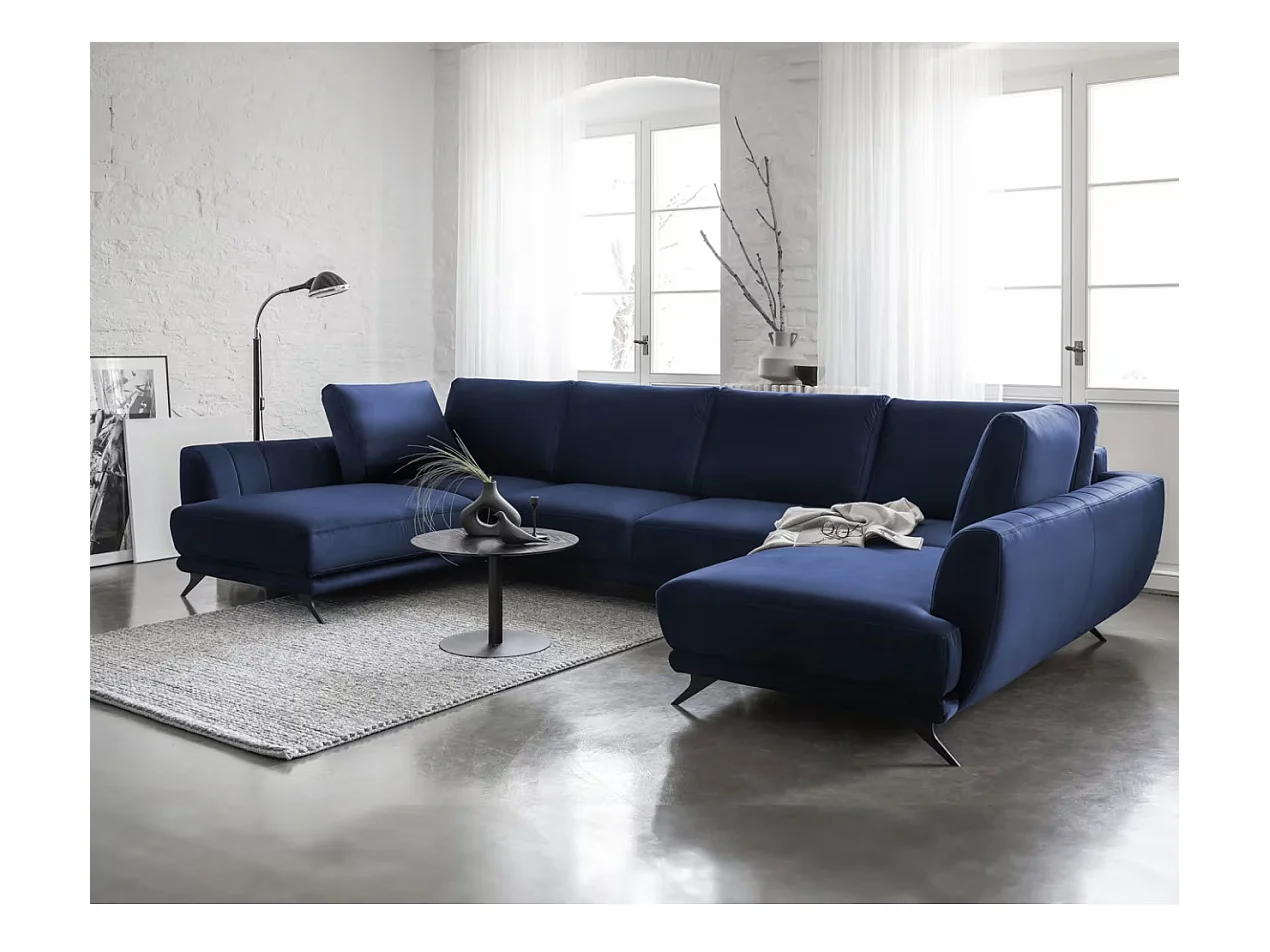 Canapé panoramique convertible design capitonné tissu doux bleu foncé méridienne droite Boston 350cm