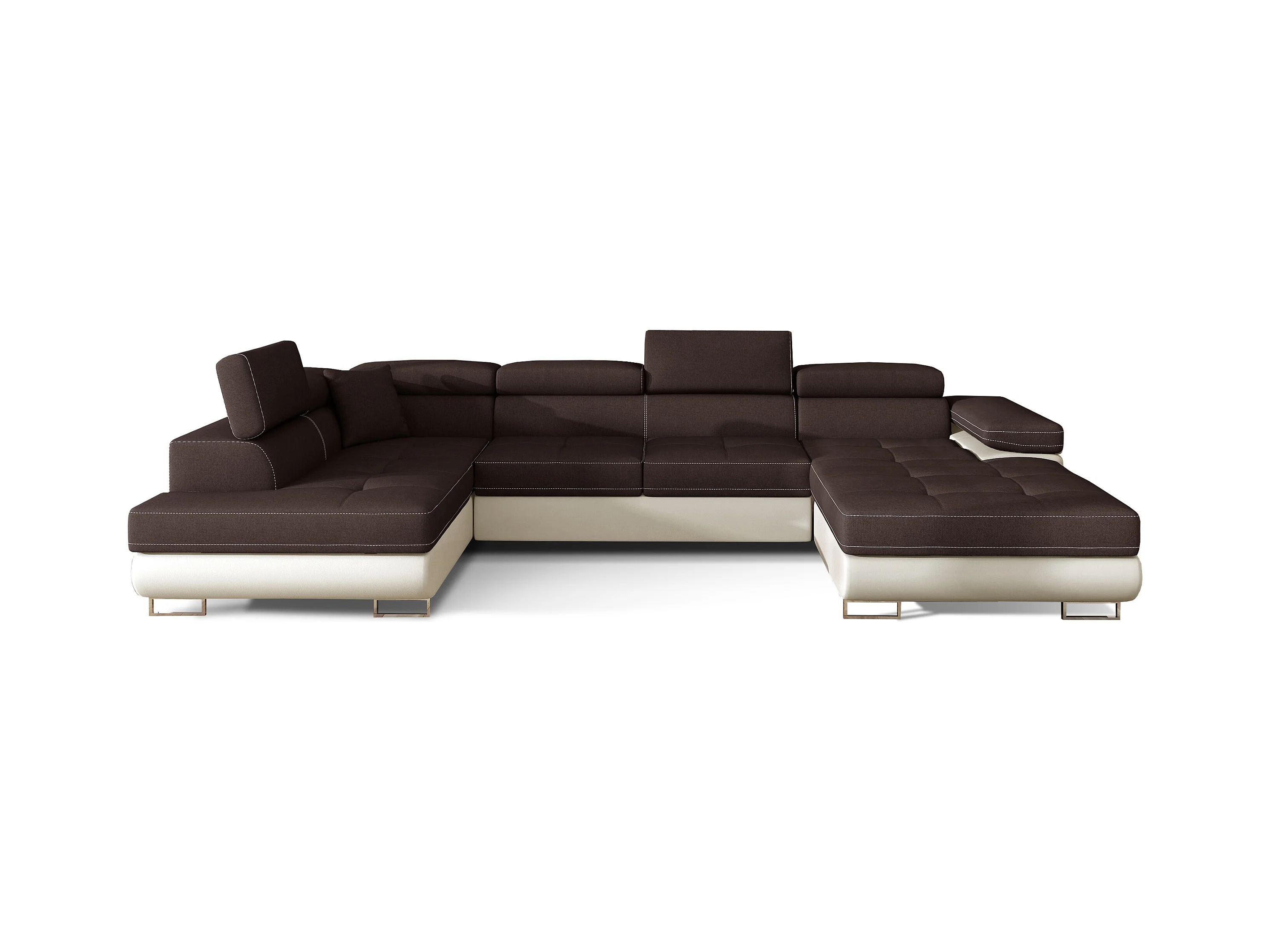 Canapé panoramique convertible ROMANO - Rangement et appuie-têtes réglables-Blanc/Marron-Coffre à droite