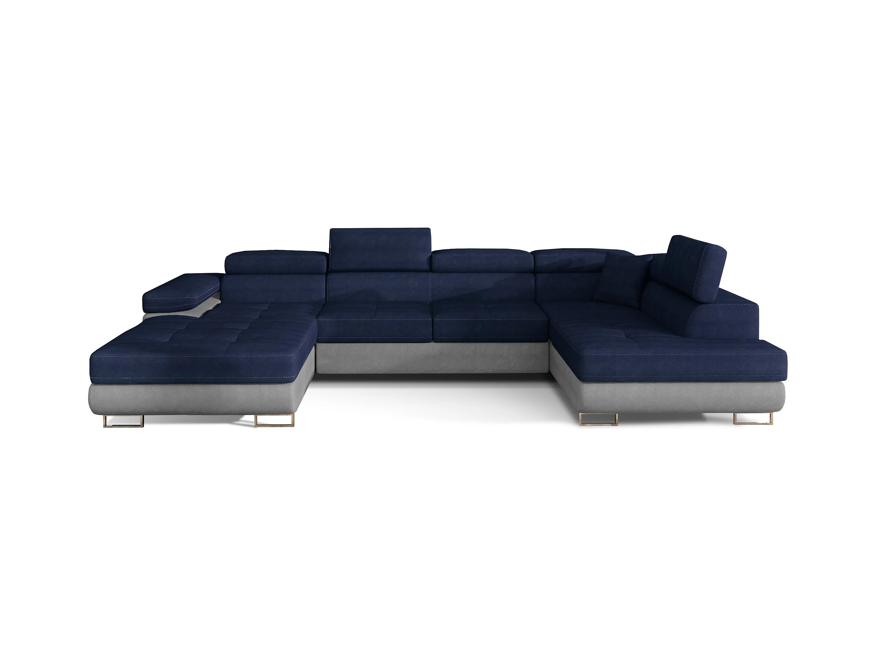 Canapé panoramique convertible ROMANO - Rangement et appuie-têtes réglables-Gris clair/Bleu-Coffre à droite