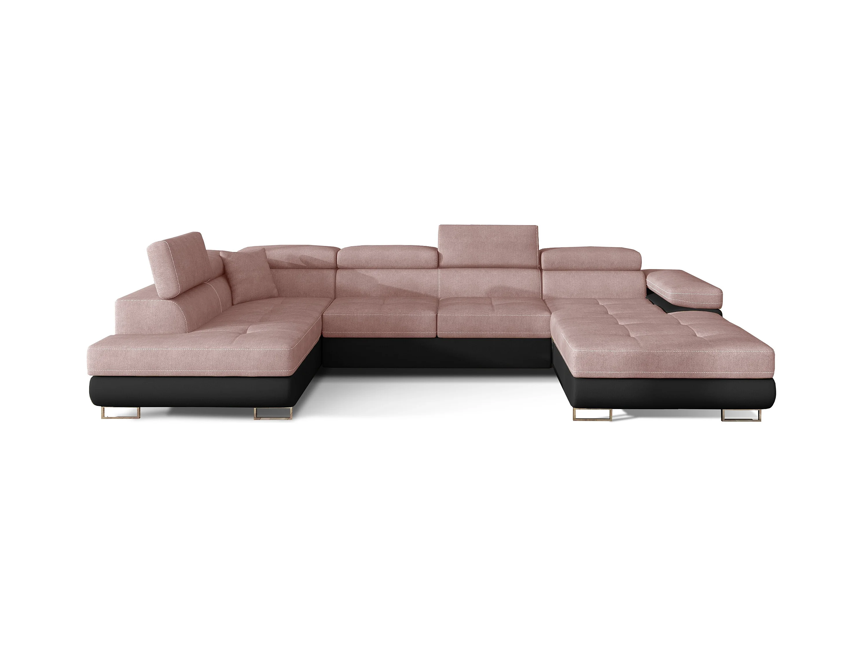 Canapé panoramique convertible ROMANO - Rangement et appuie-têtes réglables-Noir/Rose clair-Coffre à gauche