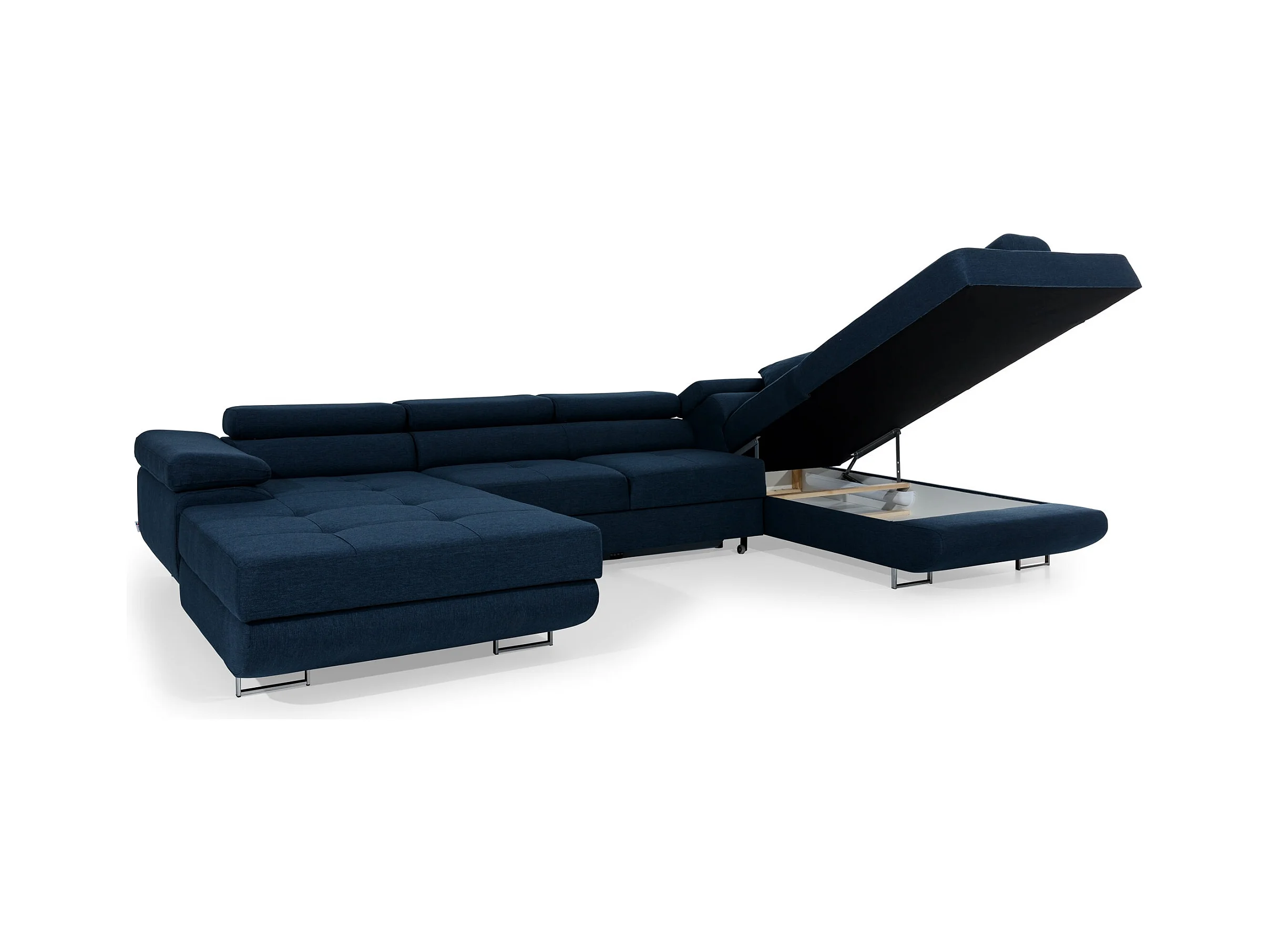 Canapé panoramique convertible ROMANO tissu - Rangement et appuie-têtes réglables-Bleu turquin-Coffre à gauche