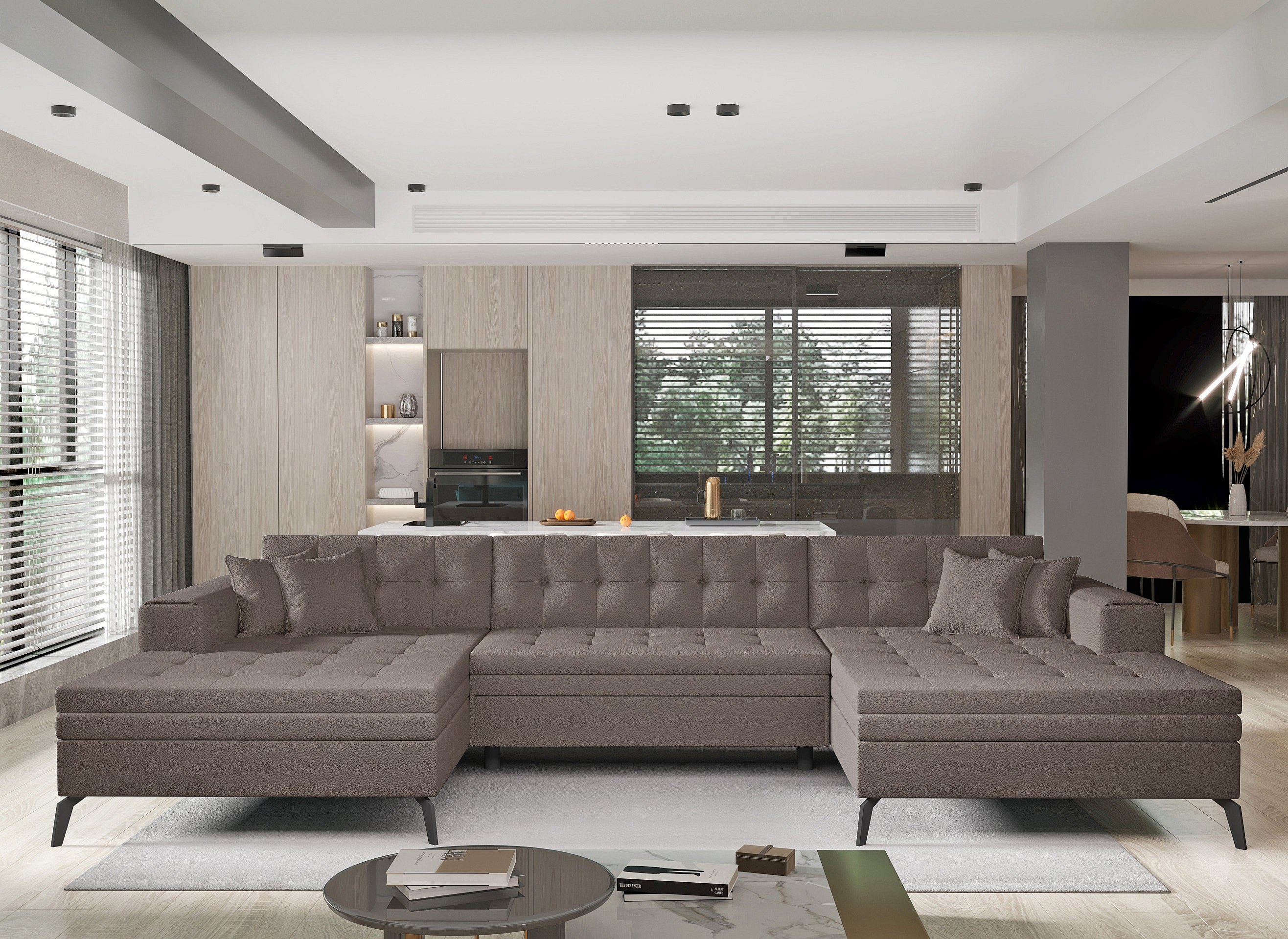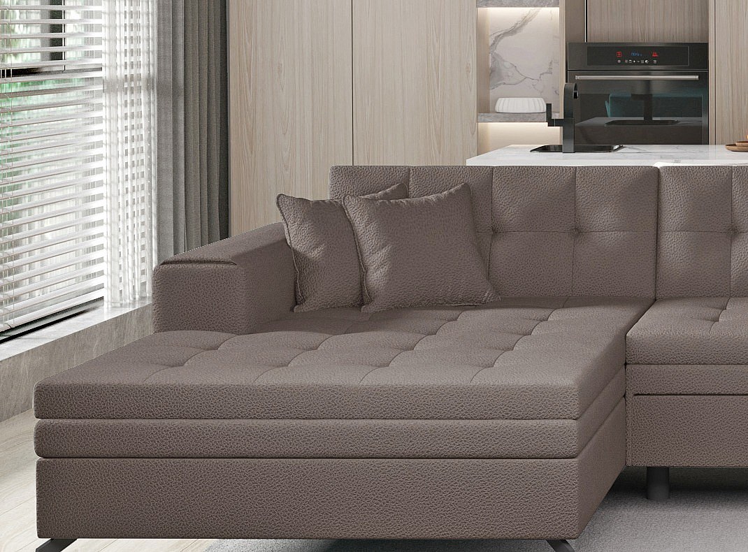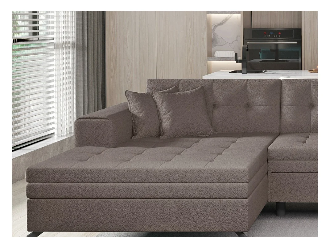 Canapé panoramique convertible tissu capitonné effet cuir marron Romy 350cm